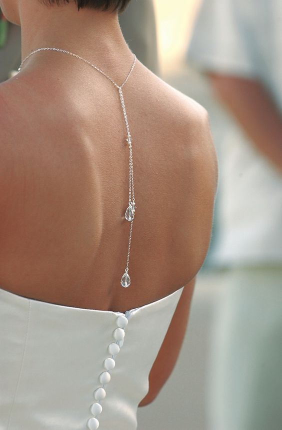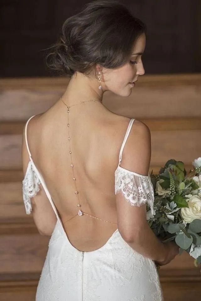 Бодичейн или цепочка для тела — идеальный аксессуар для фасона платья с глубоким декольте или открытой спиной. Такой элемент органично дополнит обнаженные ключицы или лопатки, сделает образ соблазнительным и в то же время утонченным. К слову, аксессуар довольно универсальный и однозначно пригодиться не только в день свадьбы: цепочка будет эффектно смотреться с вечерним нарядом или с купальником.