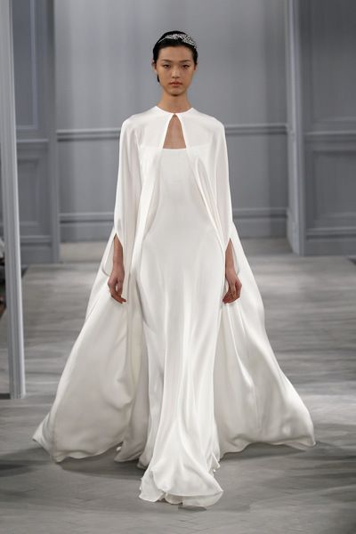 Стилистический прием был несколько раз задействован на прошедшей Неделе свадебной моды, где выходы моделей сопровождались эффектными развевающимися накидками. Воздушные, полупрозрачные кейпы удачно подчеркивали красоту простых и лаконичных платьев.