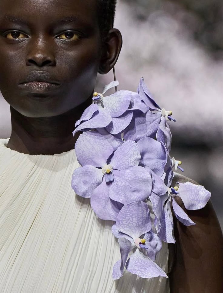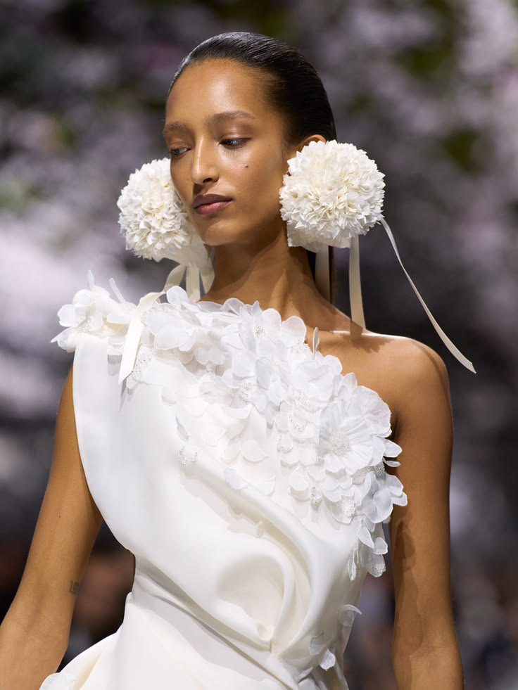 В новом сезоне цветы распустились там, где их меньше всего ждали. Джонатан Андерсон в кутюрной и сезонной коллекции для Dior активно использовал цветочные мотивы. В ушах моделей были серьги-цветы, напоминающие мини-версии того самого легендарного букета от Джона Гальяно.