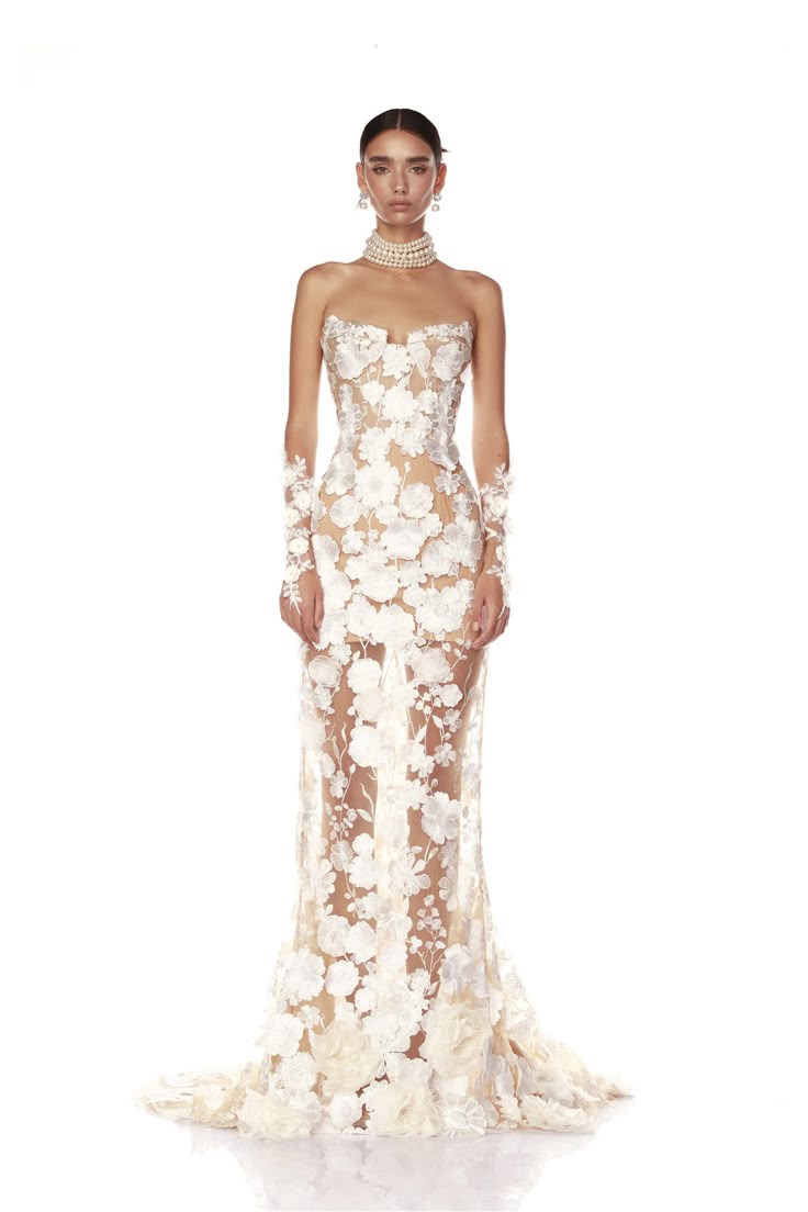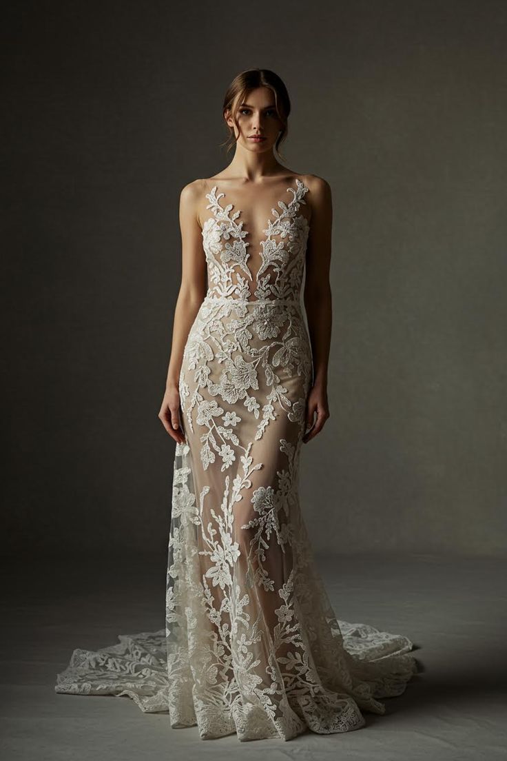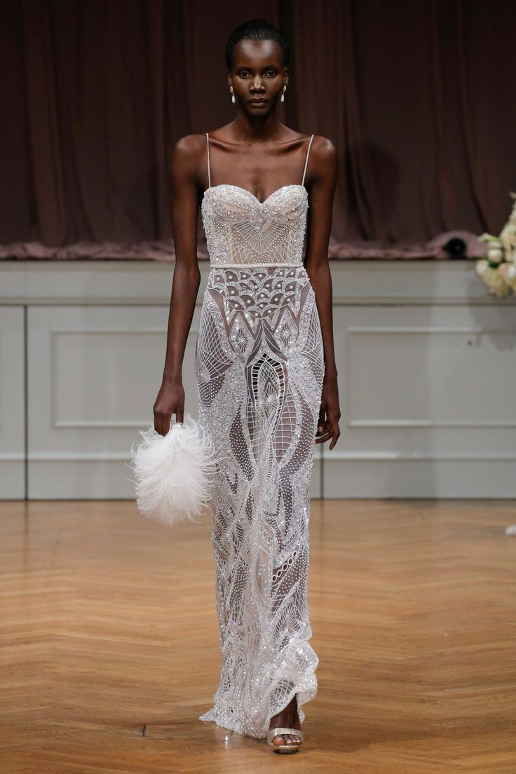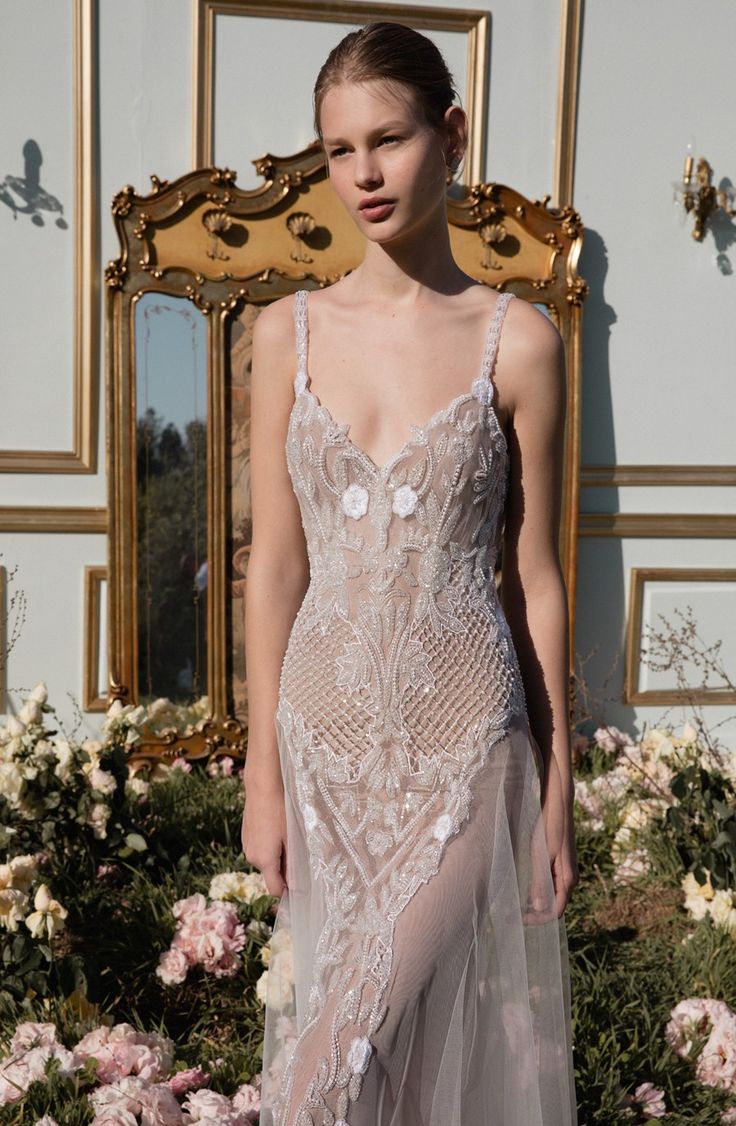 Куда элегантнее смотрятся силуэты, в которых кожа лишь частично проглядывает сквозь кружевные вставки или легкие слои ткани. Особенно эффектны варианты, где прозрачные элементы украшены изысканной вышивкой: бисер, жемчуг, стразы мерцают на сетчатом фоне, создавая при движении тонкую игру света. Такой наряд — настоящее произведение искусства, балансирующее на грани романтики и чувственности.