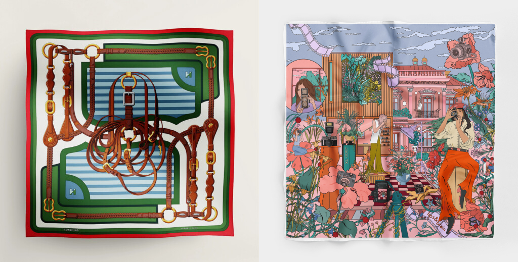 Шелковый шарф Hermes, 60 000 рублей/ шелковый шарф Lips & Brain, 15 000 рублей