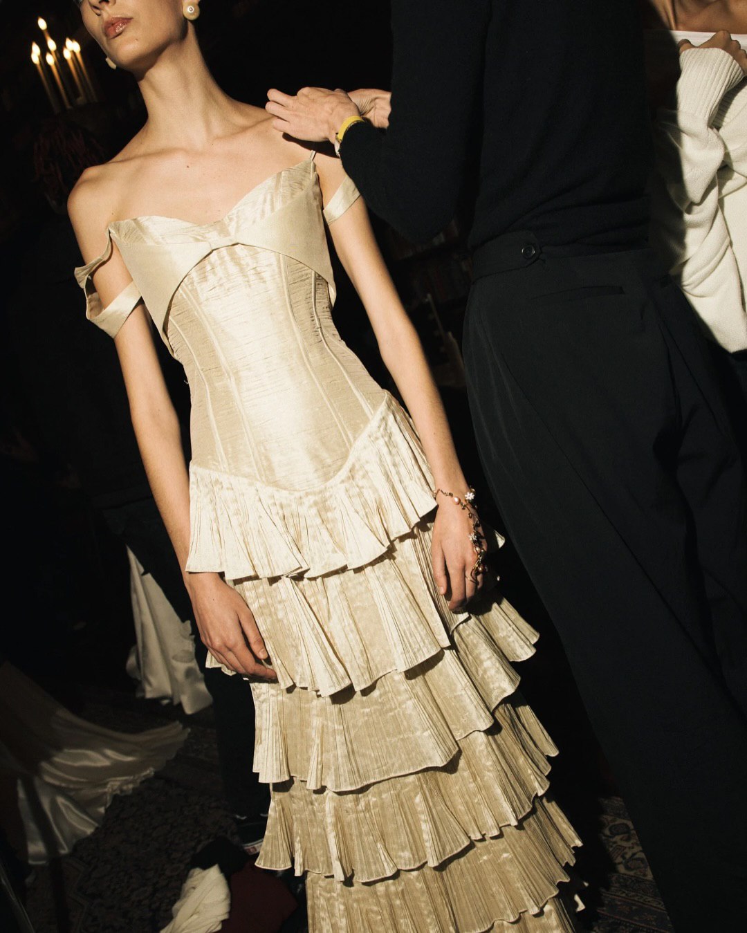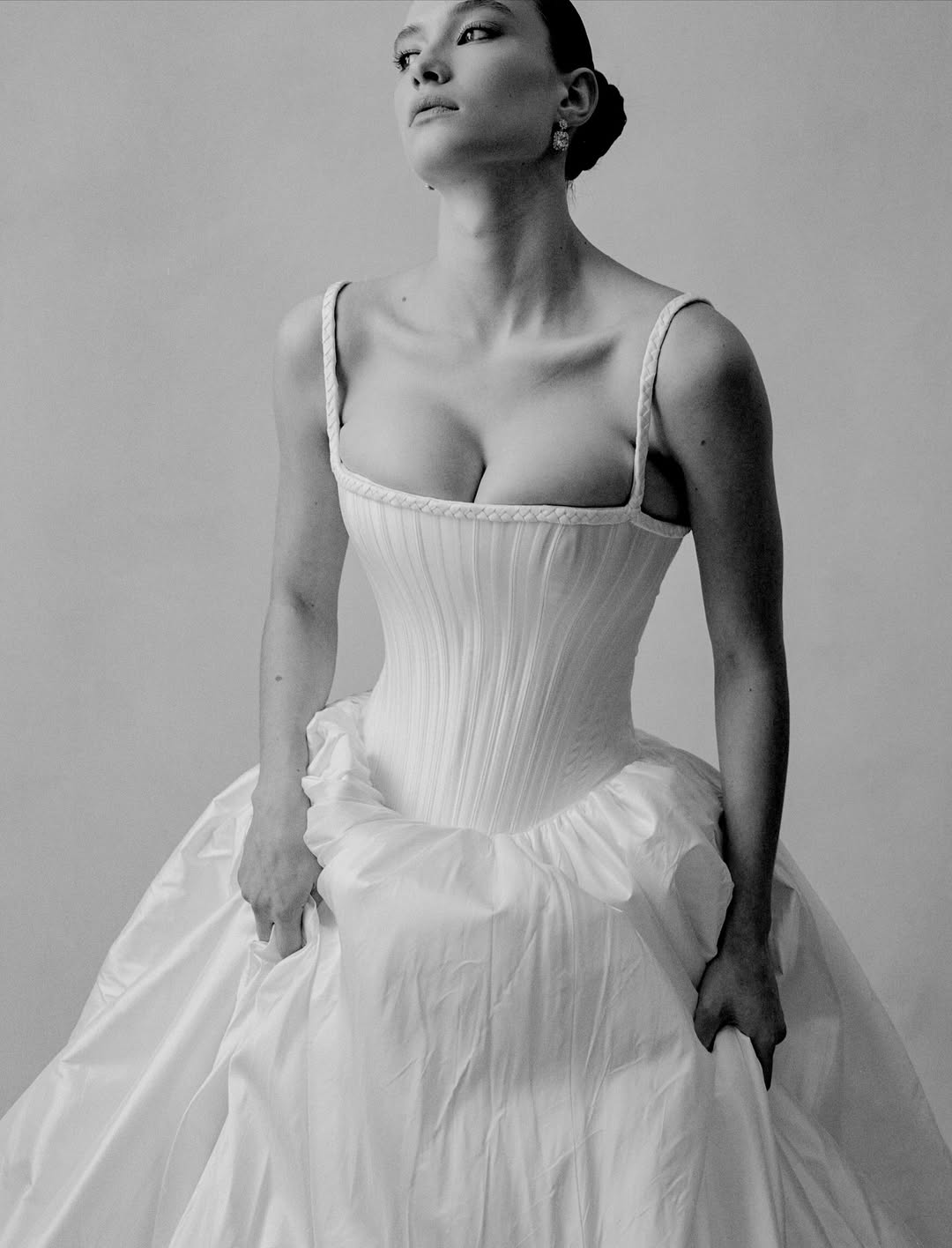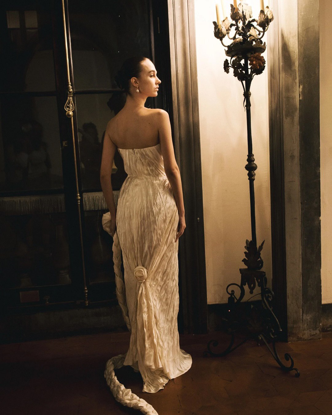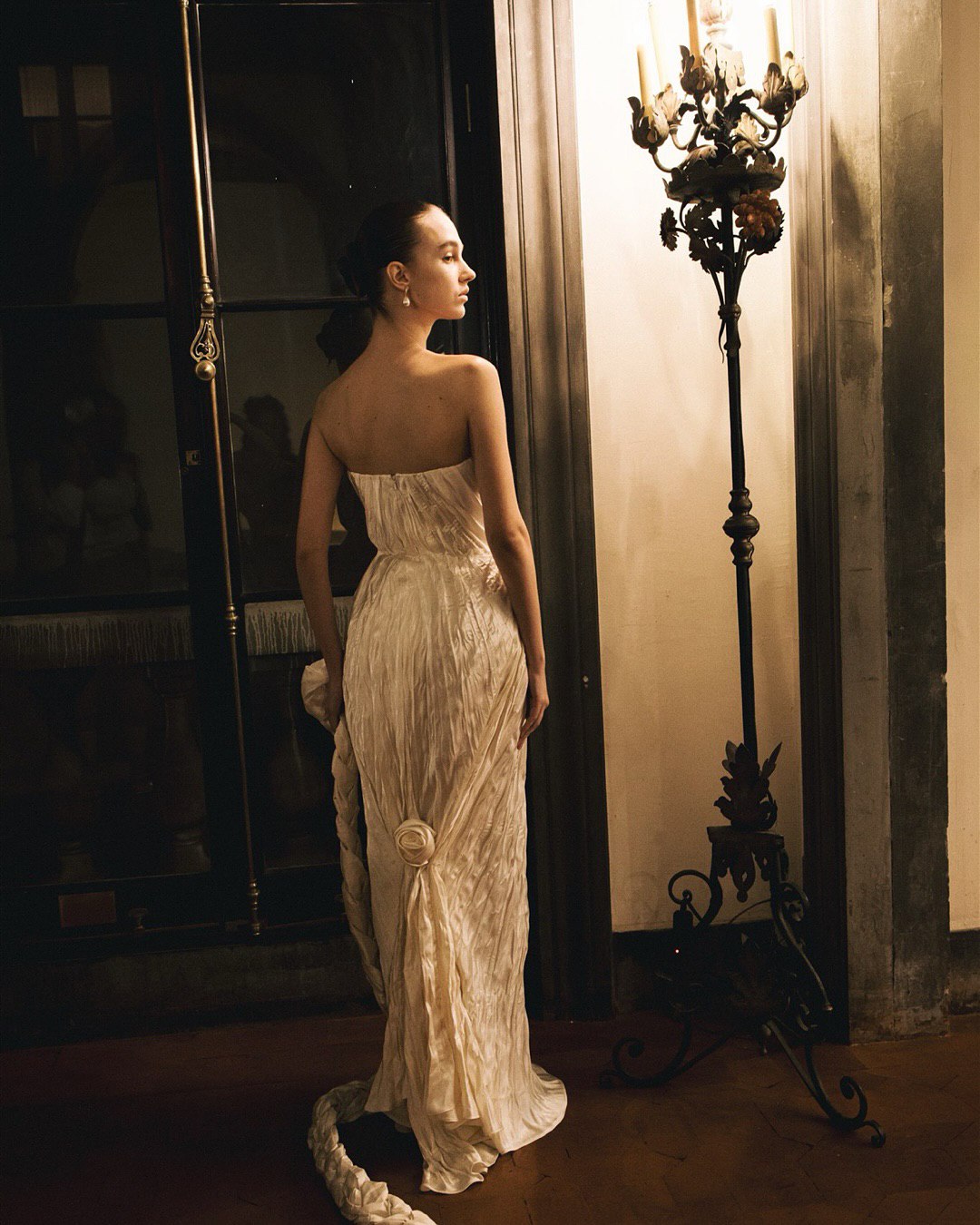 Наряды из весенней коллекции Floure studio были представлены в рамках Недели свадебной моды в Нью-Йорке. Вдохновением для невест, которые готовятся к торжеству в 2026 году, может стать жемчужина показа — модель Davine, сшитая из плиссированного шелкового дупиона и украшенная скульптурным корсетом на тонких бретелях. Всего в капсулу вошло 16 свадебных платьев.