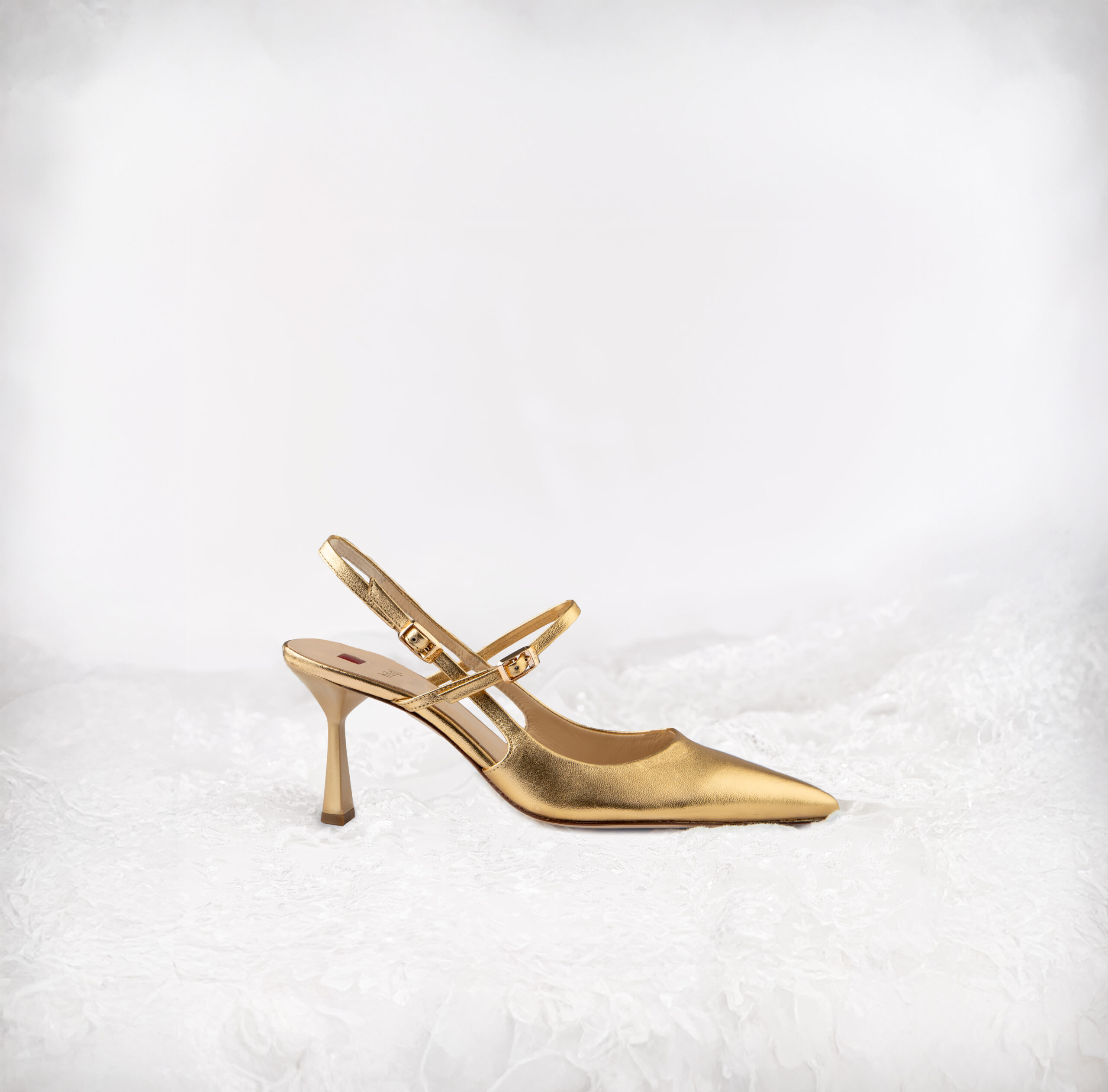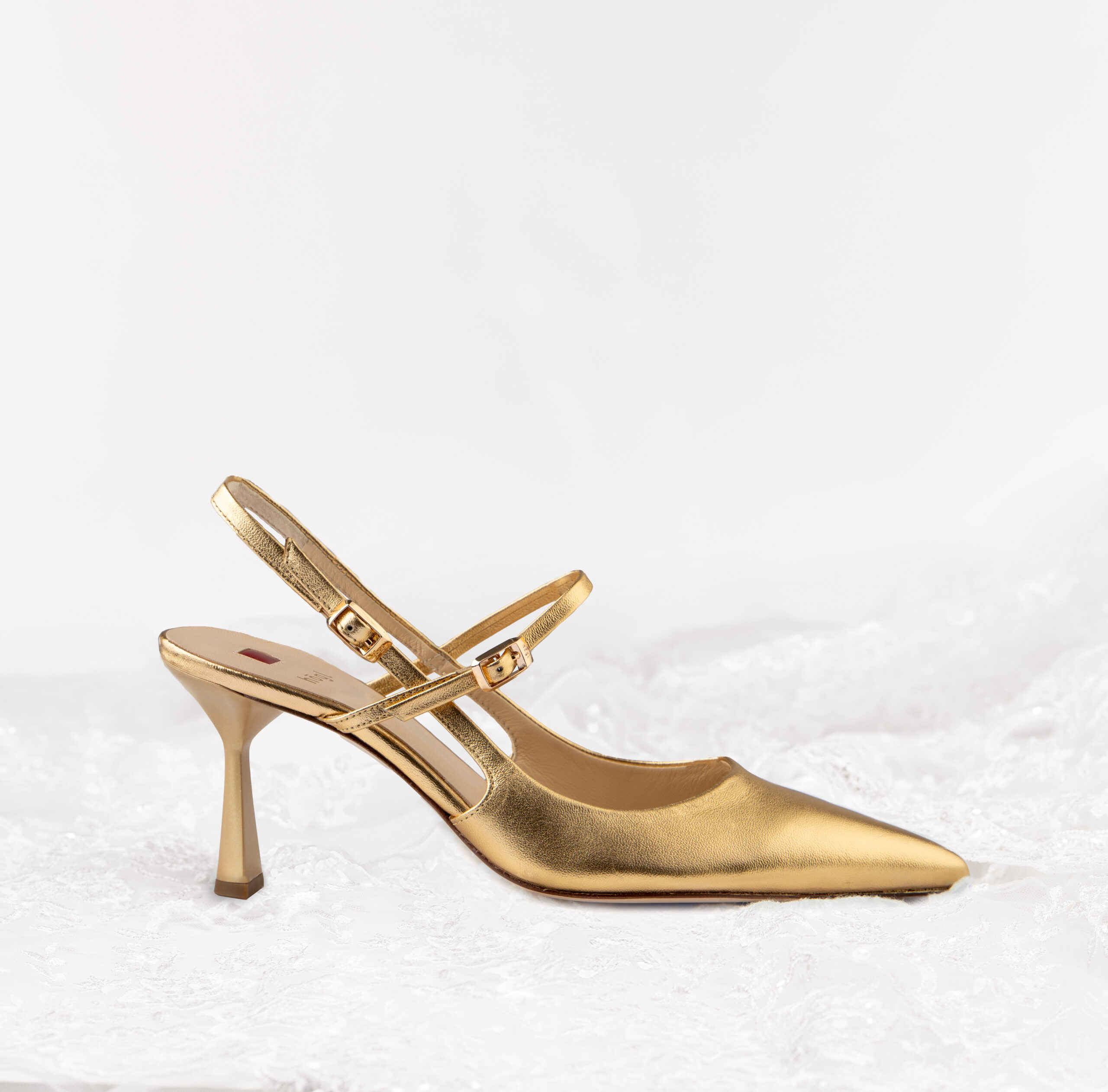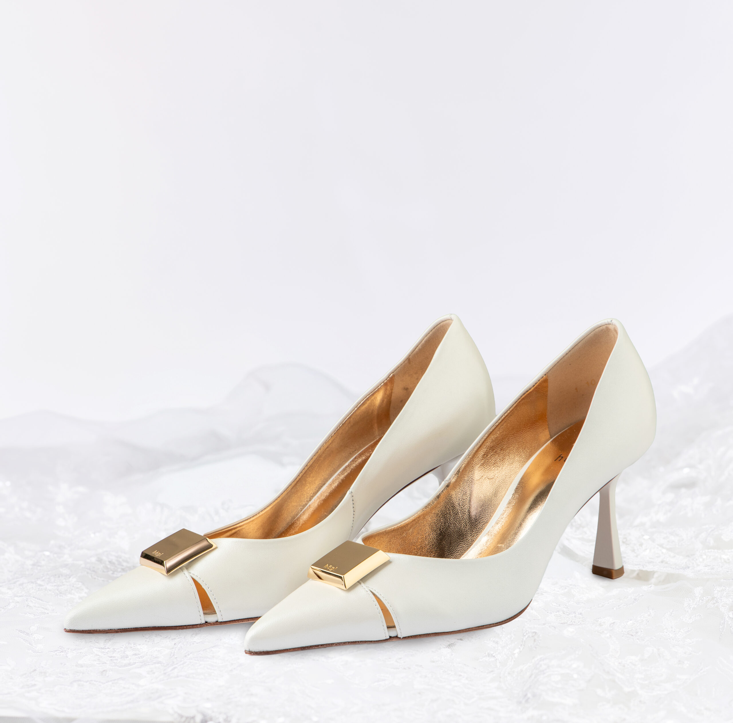Выбор смелых невест — балетки с ремешком на пятке SIMONE из свадебной капсулы Högl. Они выглядят очень элегантно за счет светлой матовой кожи, утонченных вырезов и характерного золотистого элемента на мыске.