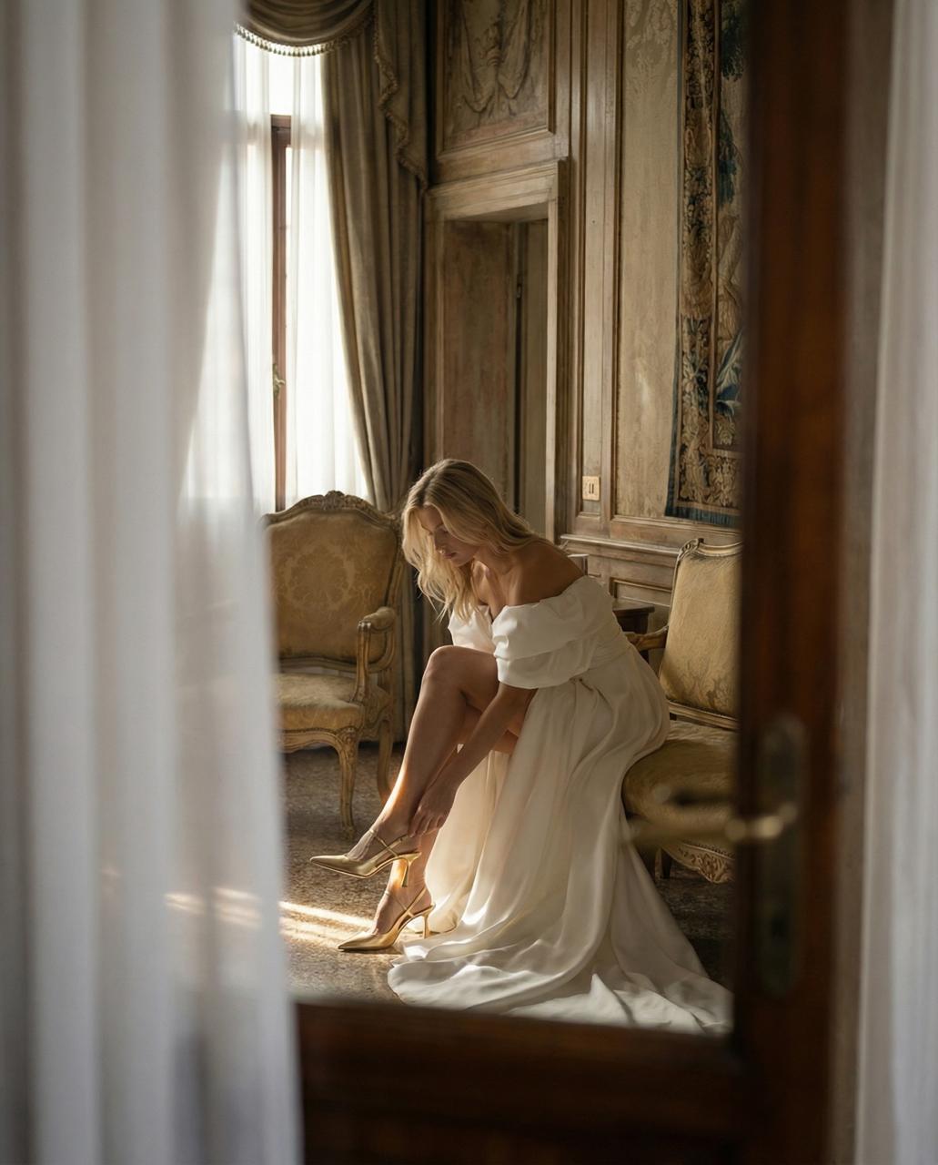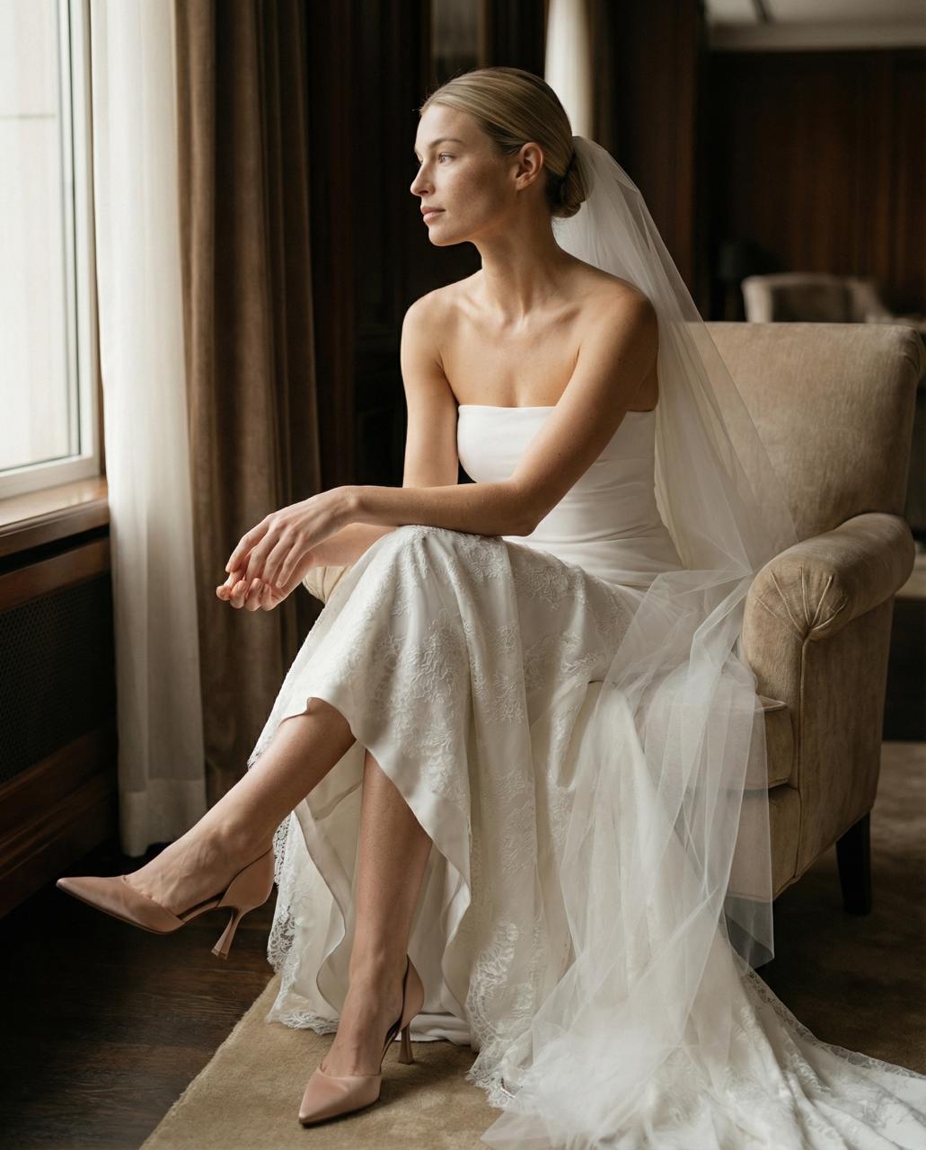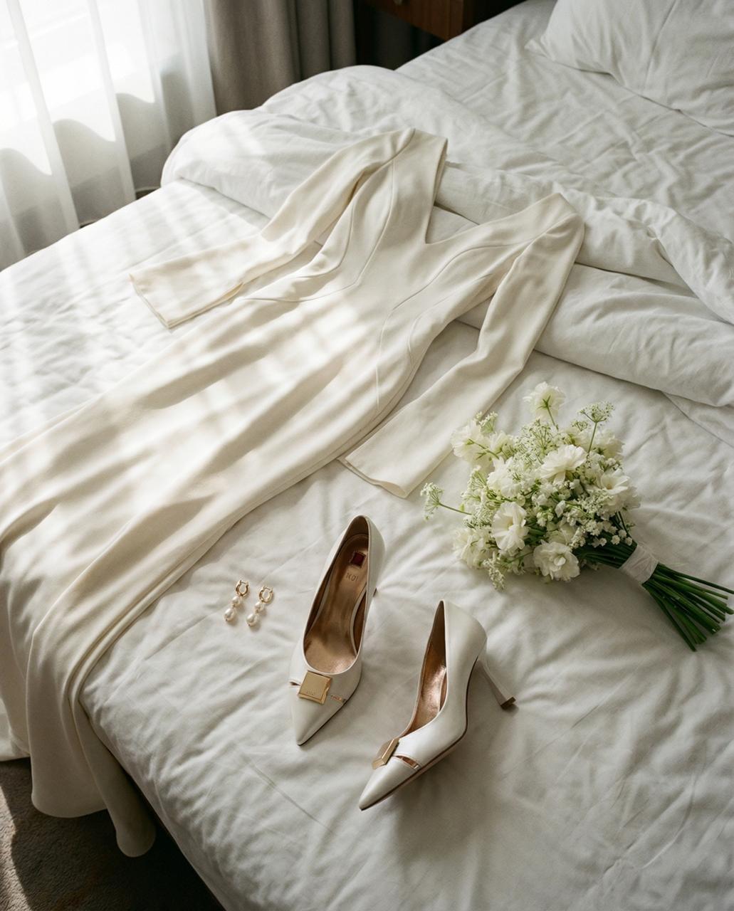 Балетки и невысокий каблук — больше не компромисс, а осознанный выбор. Особенно если свадьба включает много перемещений, танцы, прогулку или второй образ на вечер. Они становятся уместным решением для росписи и вечеринки одновременно.