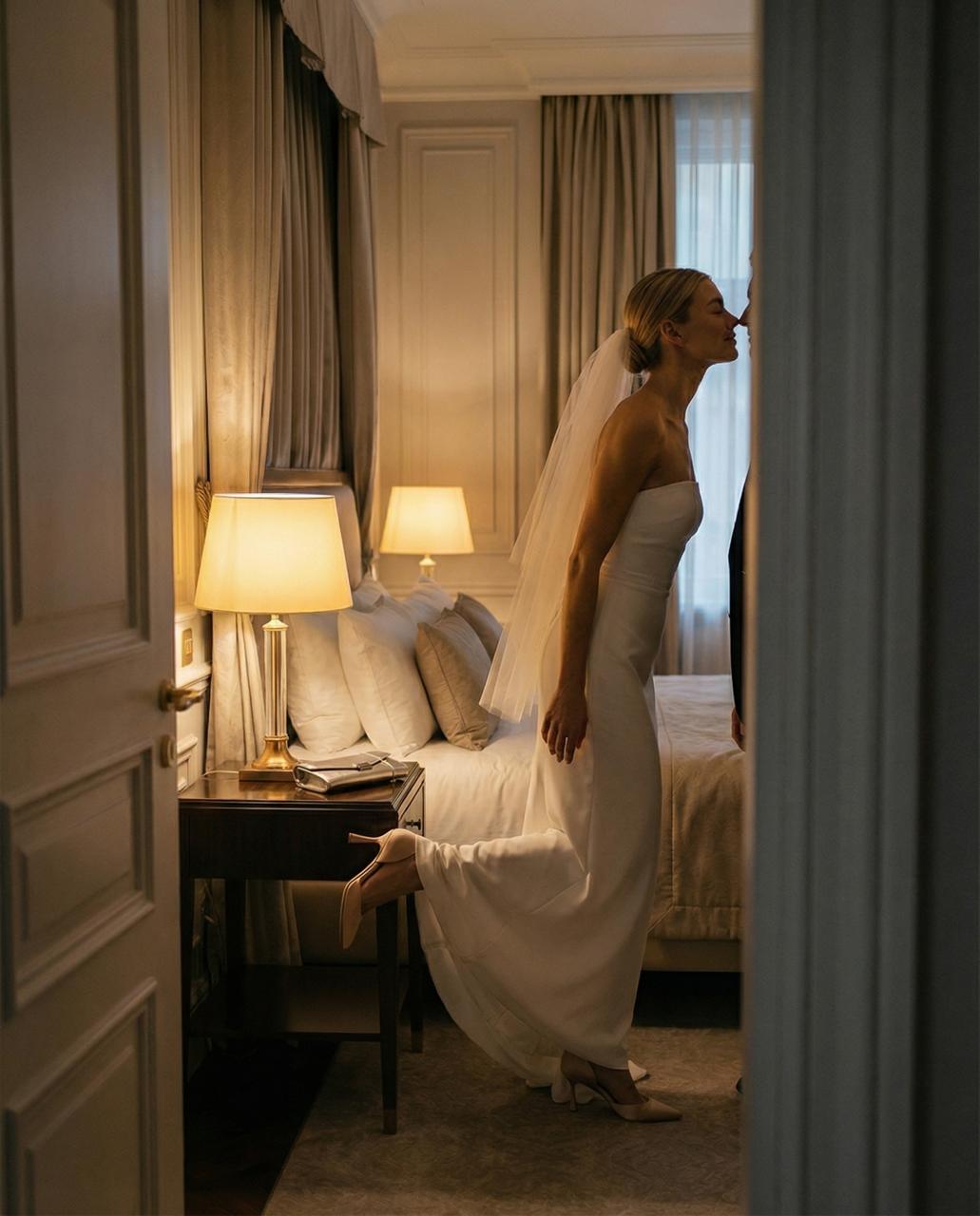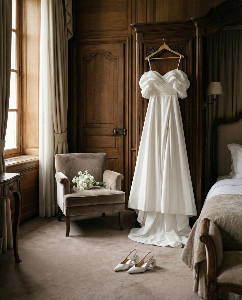 Выбирайте сложные оттенки — молочный, тауп, шоколад. Отдавайте предпочтение фактурам, которые выглядят «дорого» вне свадебного контекста, например, сатину. Избегайте избыточного декора.