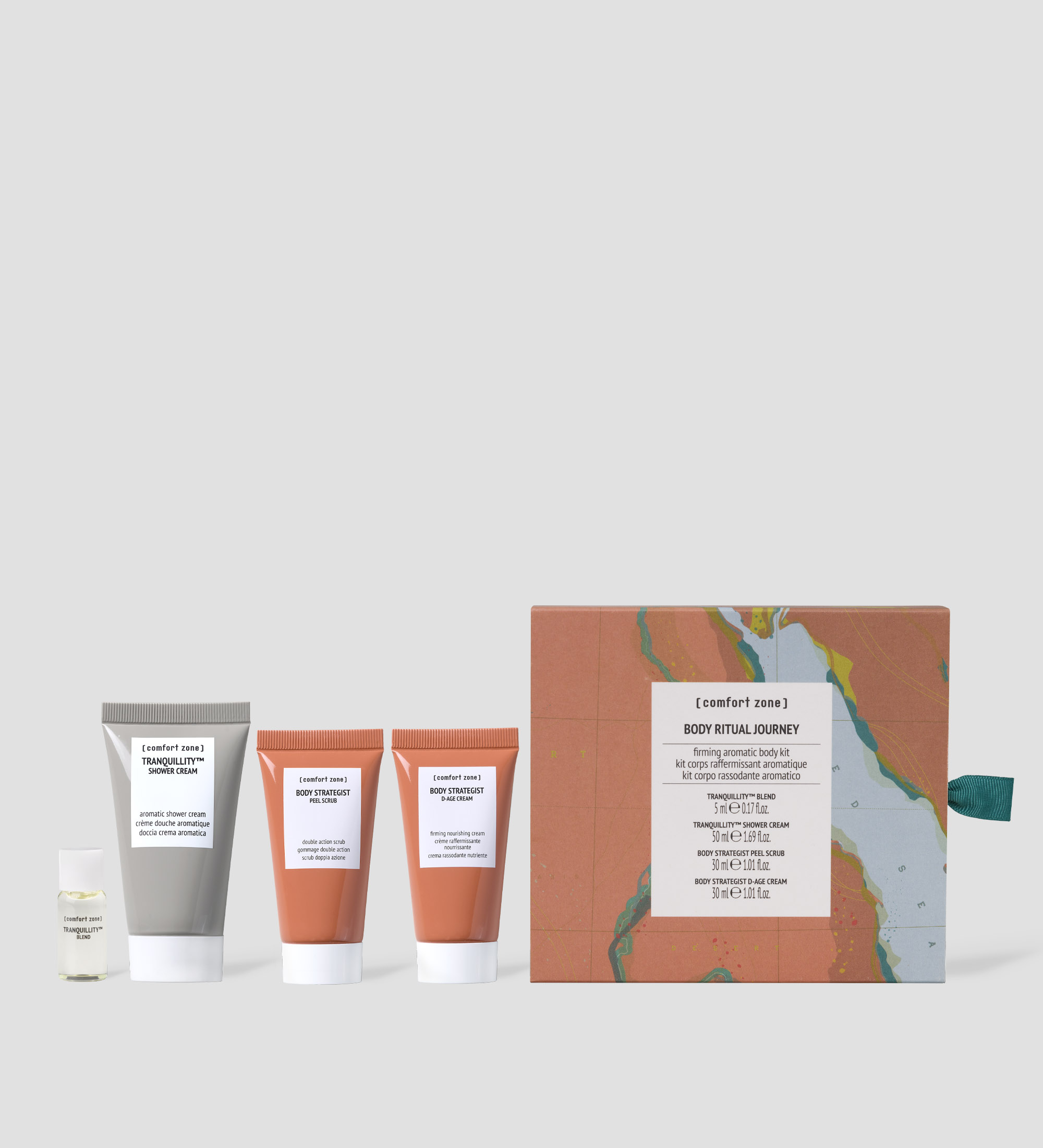 Сomfort Zone выпустил несколько лимитированных наборов в тревел-формате. Наш выбор — укрепляющий ароматический набор для тела. В состав набора для тела входят скраб двойного действия Body Strategist и гель для душа Tranquillity для подготовки кожи; крем D-Age Body Strategist с видимым укрепляющим и питательным действием; и арома-смесь Tranquility, обеспечивающая мгновенное ощущение душевного и физического комфорта.