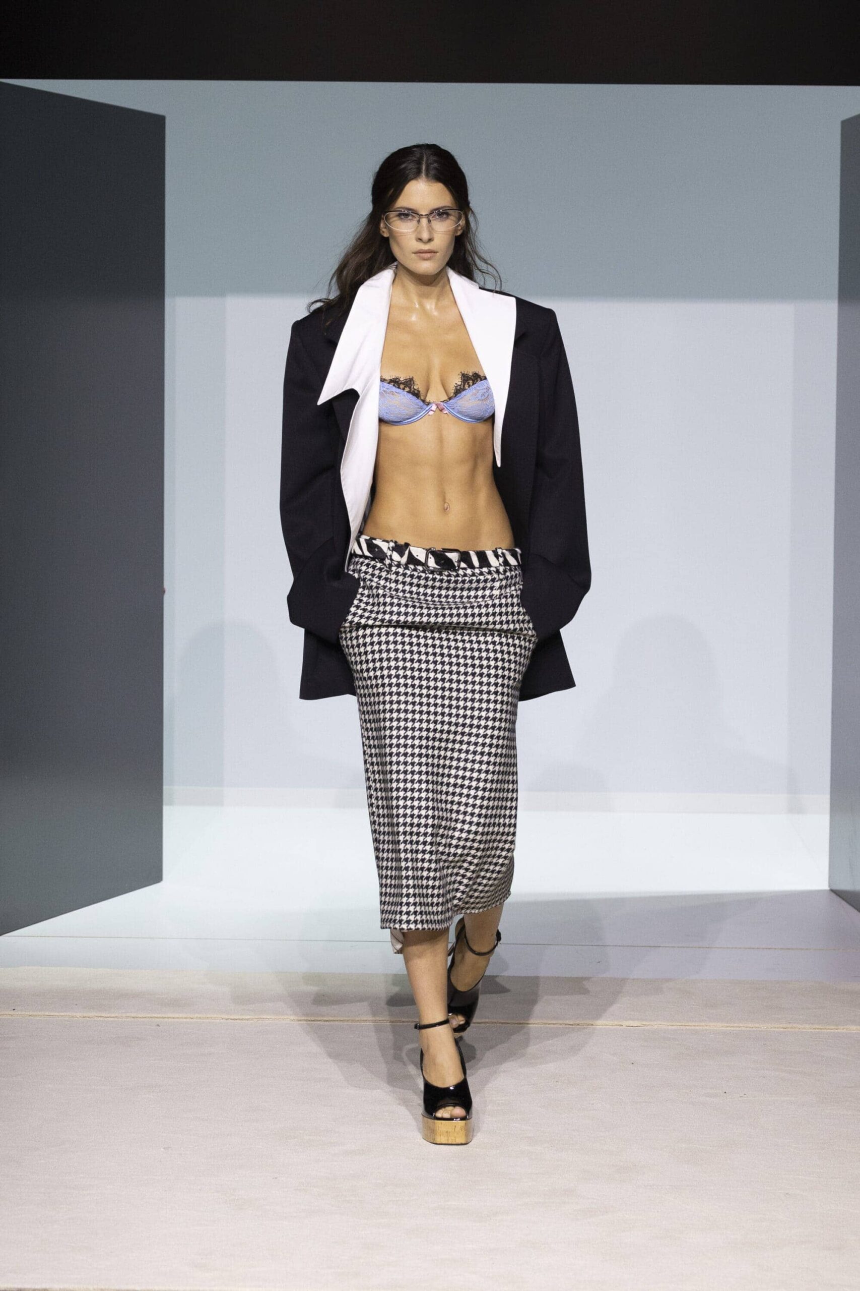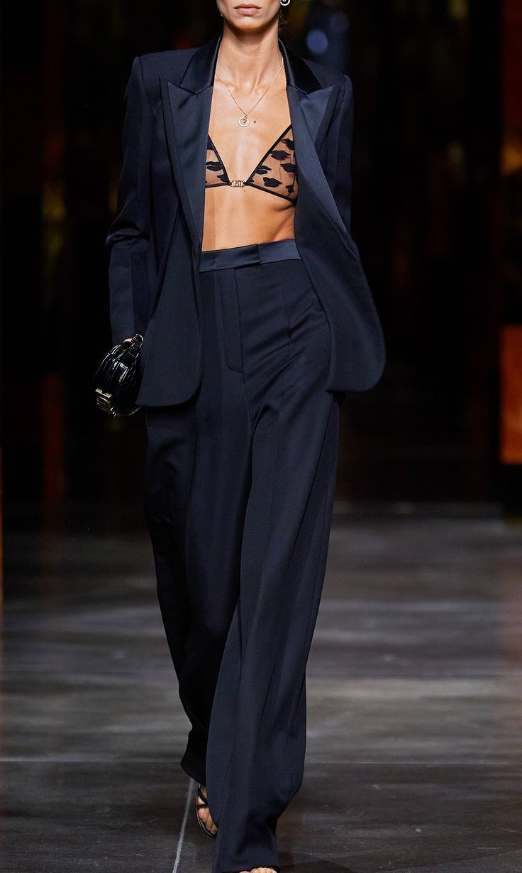 Речь идет не о вульгарности, а об игре контрастов. Самый эффектный прием этого сезона — сочетание изящного белья с «мужской» базой. Попробуйте надеть лаконичный или кружевной бюстгальтер под широкий оверсайз-пиджак с мощными плечами или строгую юбку-миди. Это создает идеальный баланс между дерзостью и элегантностью, жесткостью кроя и нежностью фактур.