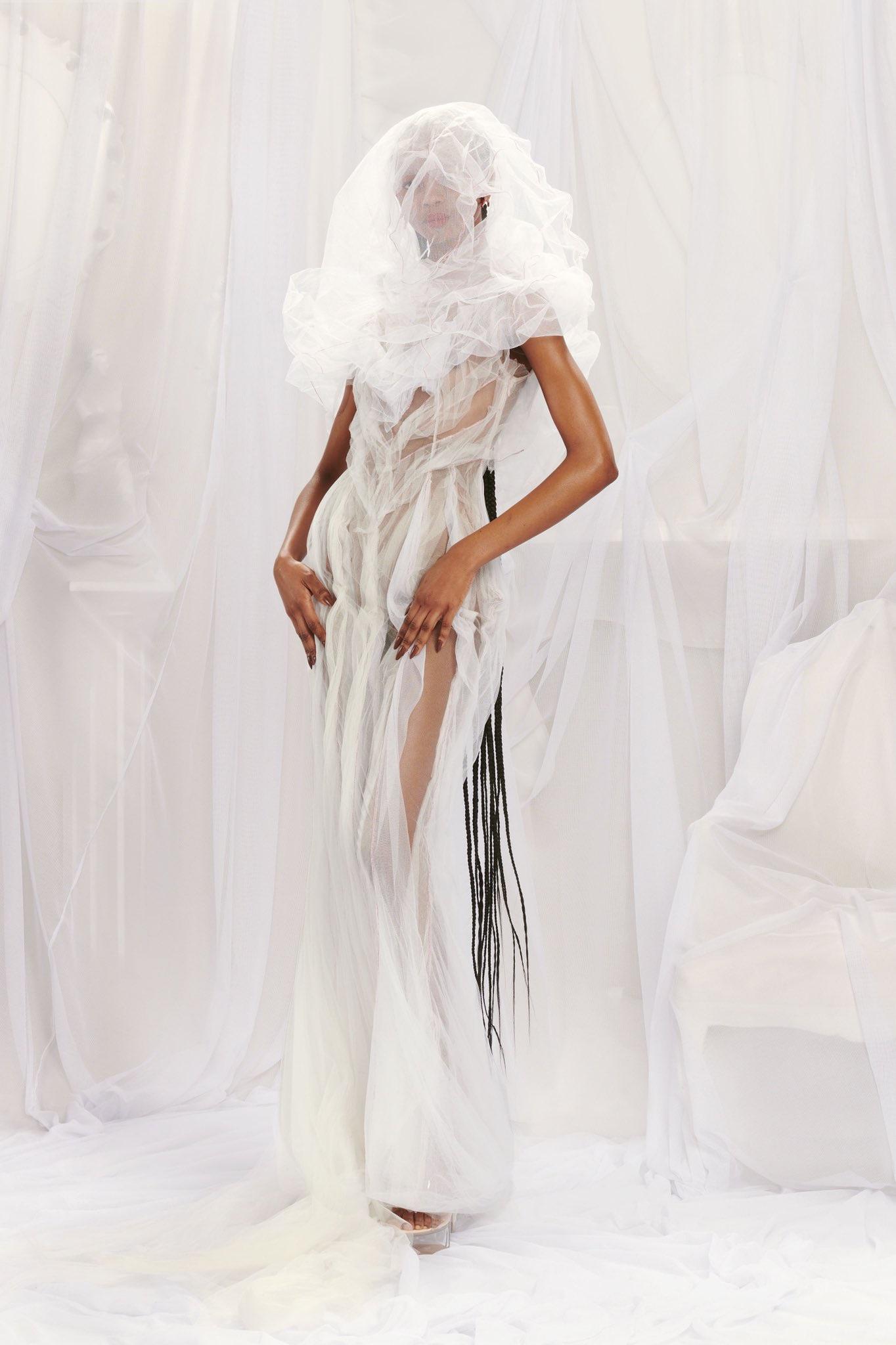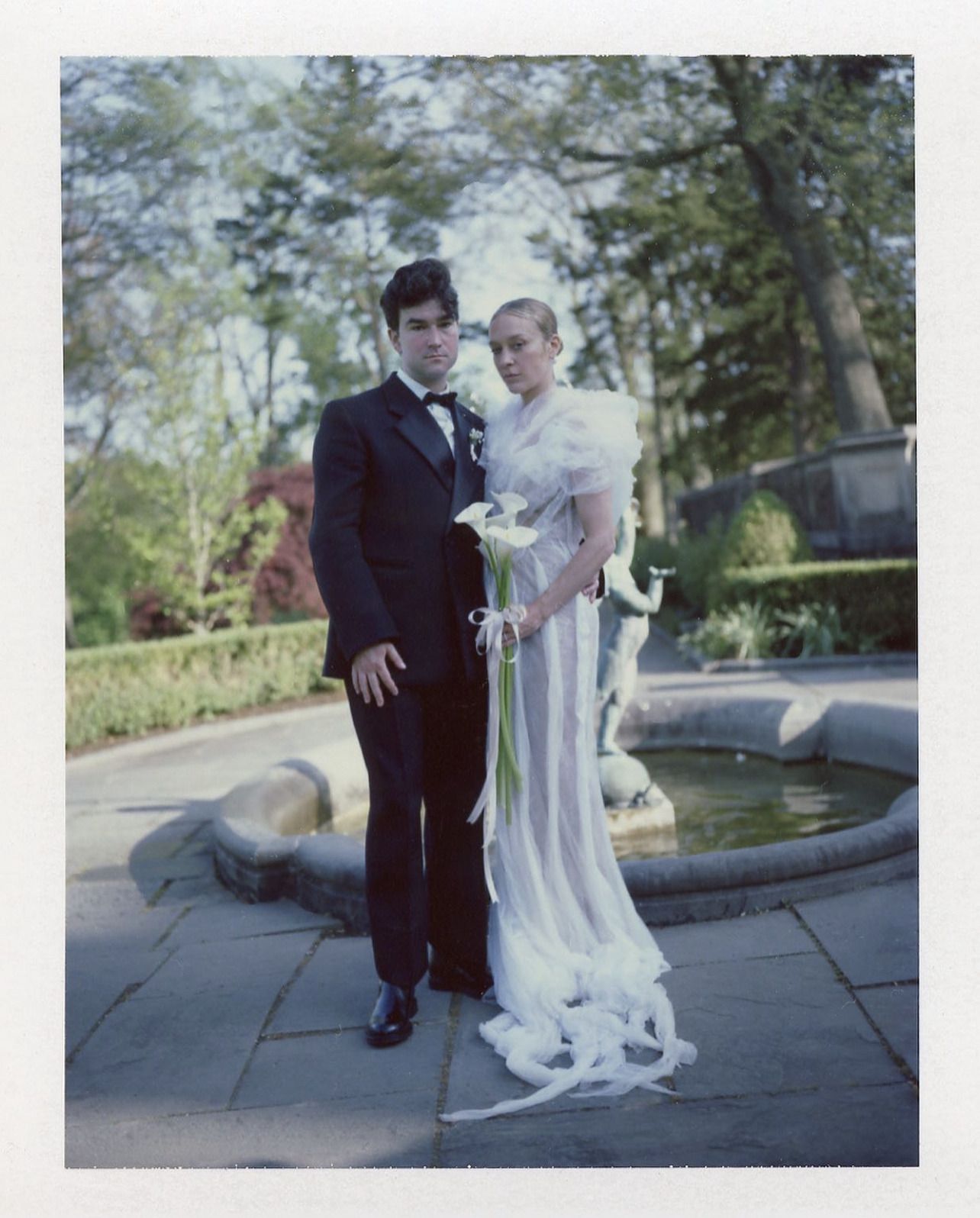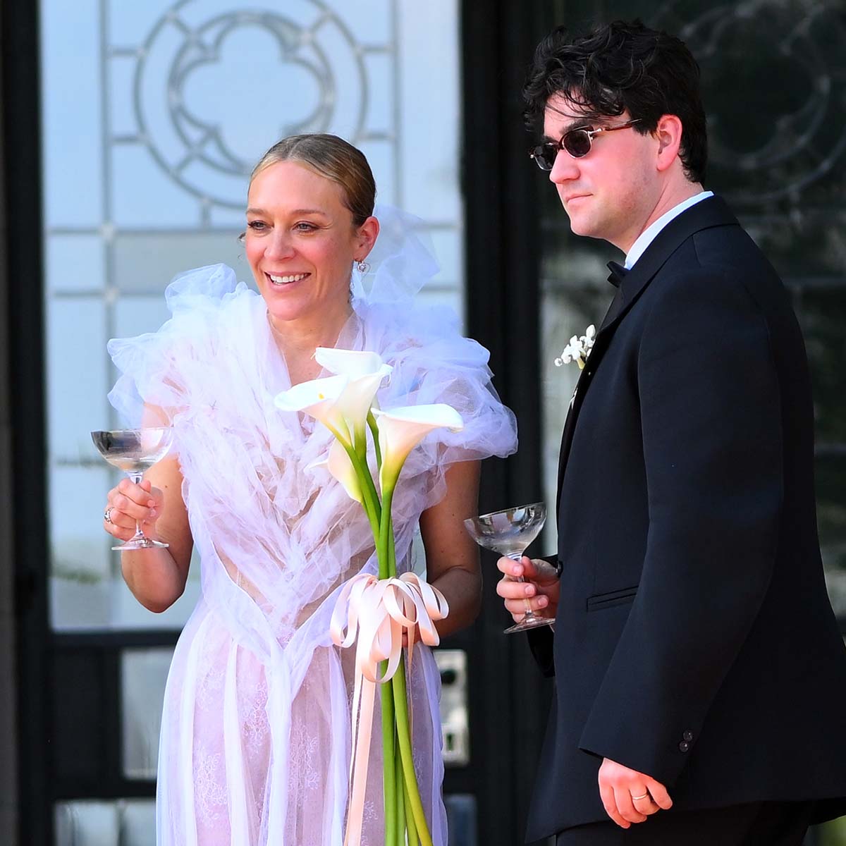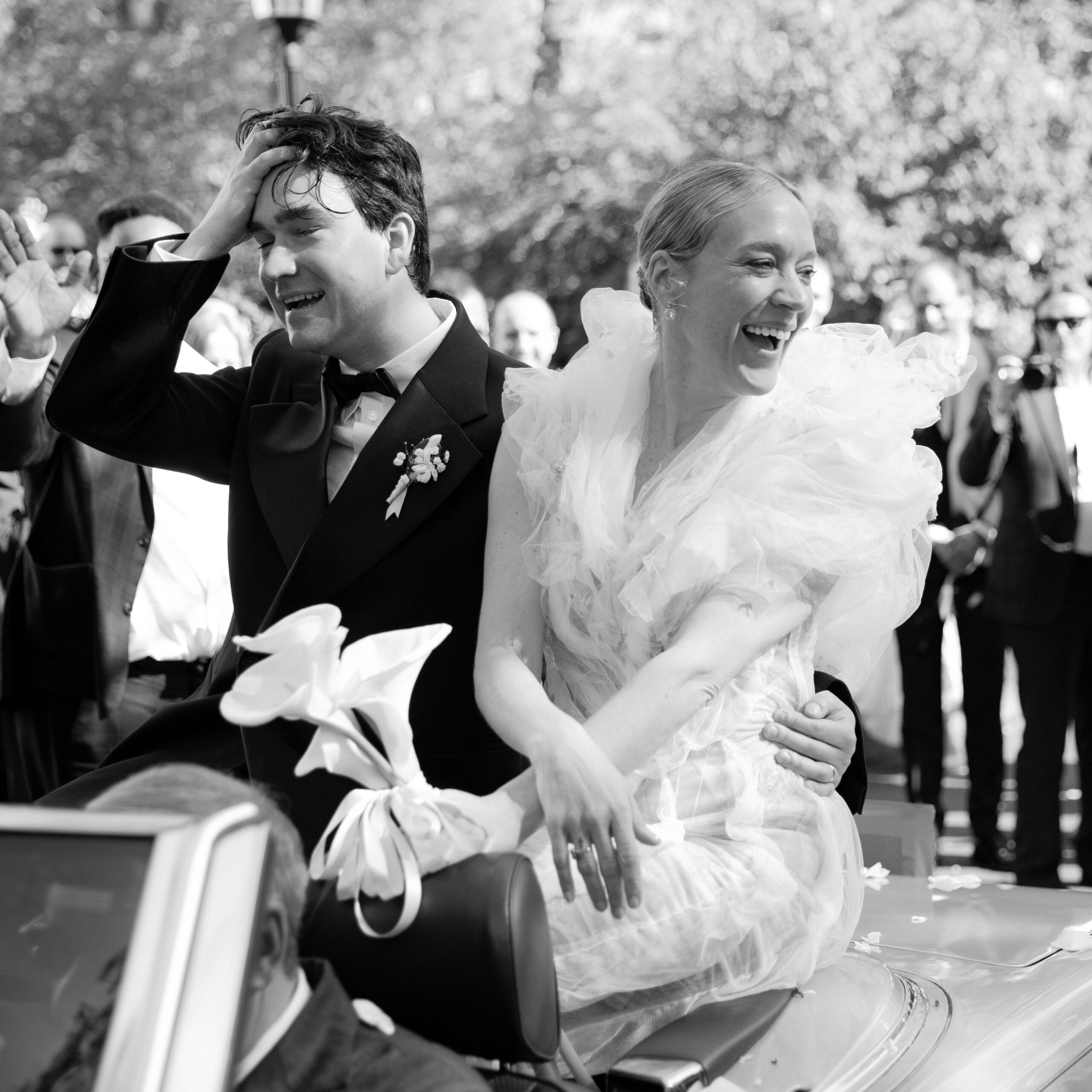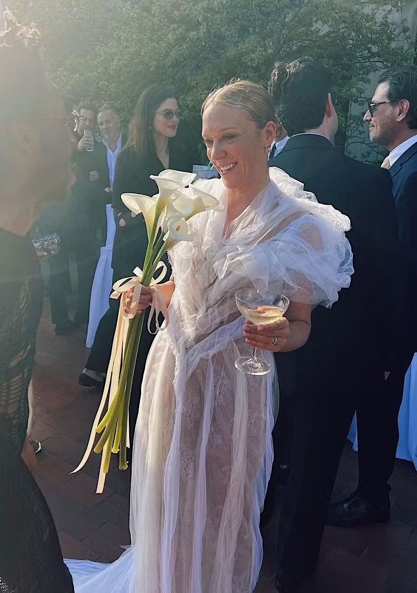 Хлоя Севиньи известна не столько как актриса, сколько как законодательница моды. Как и подобает настоящей it-girl, она вышла замуж в стильных и смелых нарядах. К алтарю актриса отправилась в платье с рюшами из кутюрной коллекции Jean Paul Gaultier, созданном Гленном Мартенсом в рамках кутюрной коллаборации. Волосы были зачесаны назад в низкий пучок, в руках она держала тонкий букет из калл, перевязанный розовой лентой. Всего девушка сменила три наряда: на вторую часть церемонии она надела мини-платье с кружевным шлейфом от Loewe, а на вечеринку отправилась в кружевном комбинезоне от Mugler.