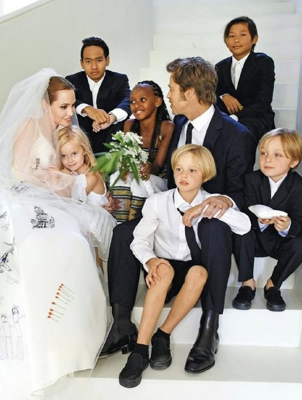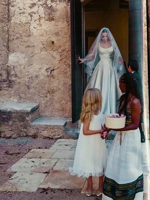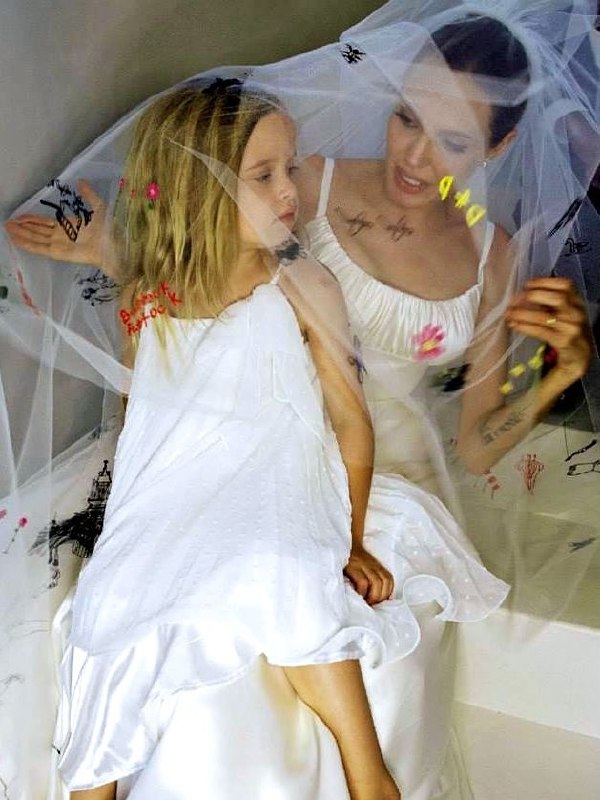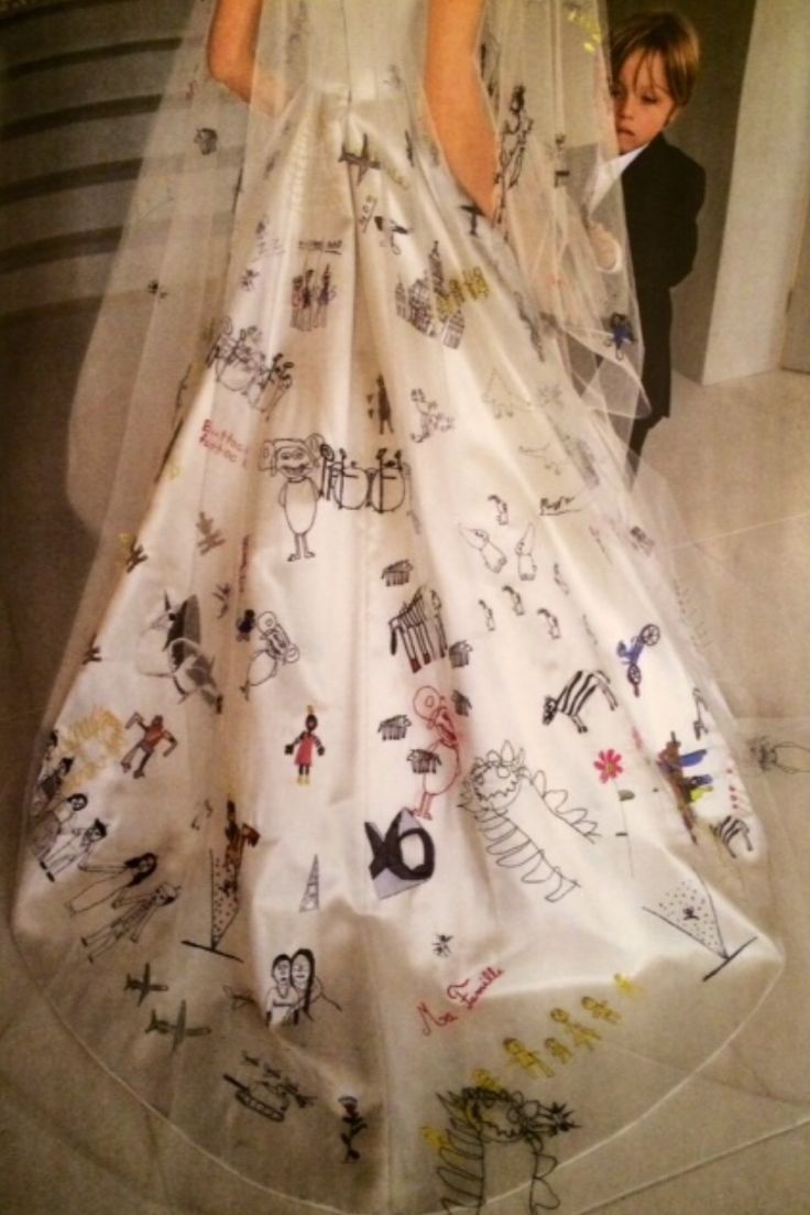 Наряд стал олицетворением стиля Джоли, сочетающего элегантность и сексуальность: молочная драпировка на лифе, круглый глубокий вырез, тонкие бретельки и пышная юбка из струящегося шелка сделали платье максимально нежным. Но Анджелина и Брэд не были бы собой, если бы остановились на сдержанной классике. Изюминкой белоснежного облачения Джоли стала длинная фата с цветной вышивкой ручной работы, воссозданной по рисункам детей молодоженов.