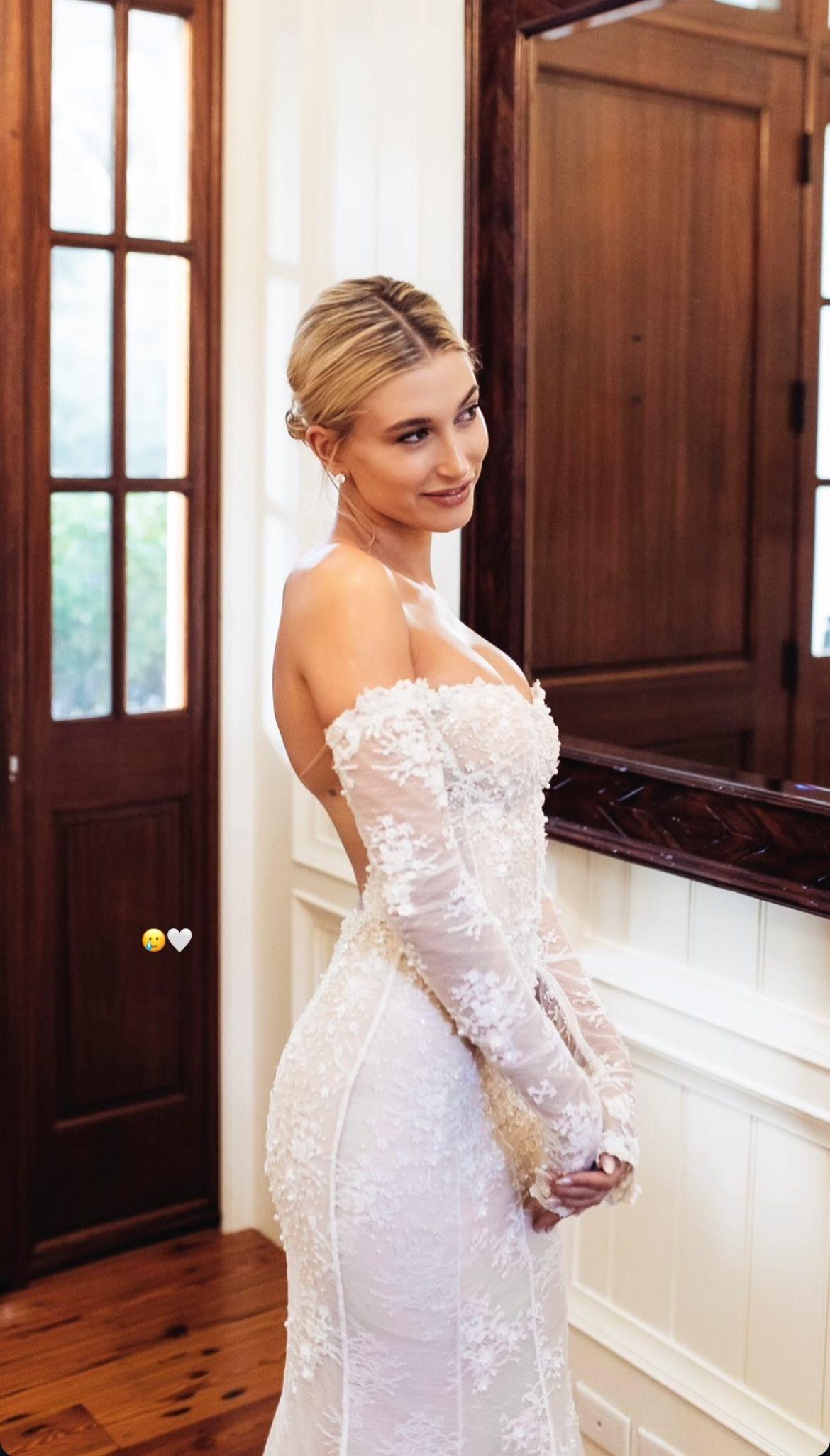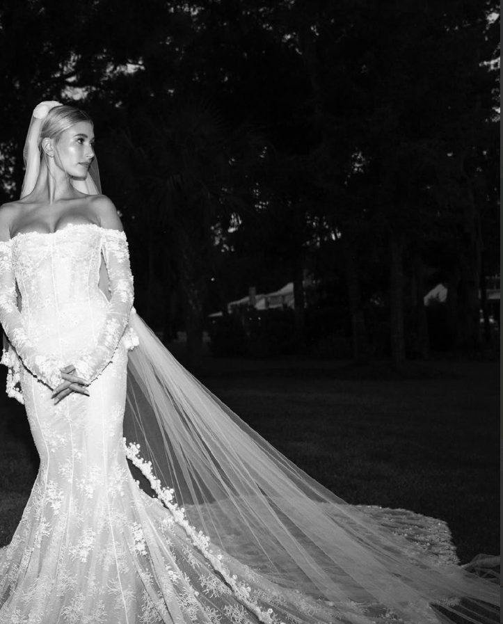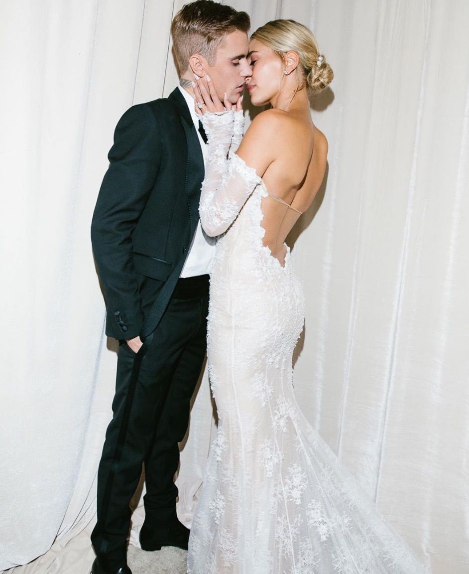 Топ-модель и канадский музыкант зарегистрировали брак в 2018 году в мэрии Нью-Йорка, а год спустя устроили пышное торжество для родных и близких в Южной Каролине. Для официальной церемонии Хейли выбрала уникальное платье от Вирджила Абло, дизайнера Off-White, с девизом «Till Death Do Us Part» («Пока смерть не разлучит нас»), вышитым на фате и подоле. Силуэт был классическим — пышная юбка и удлиненный лиф, но детали, характерные для уличной моды Off-White, делали его ультрасовременным.