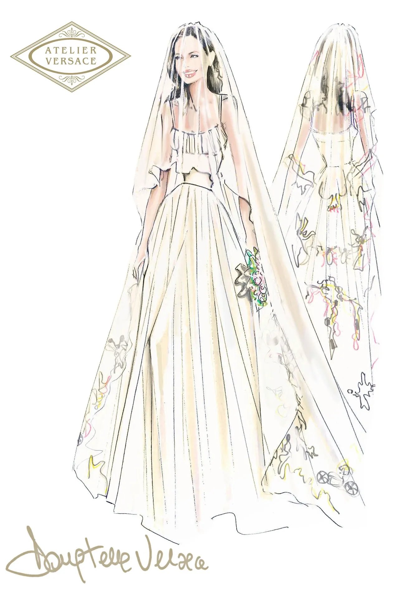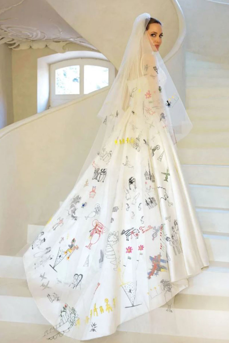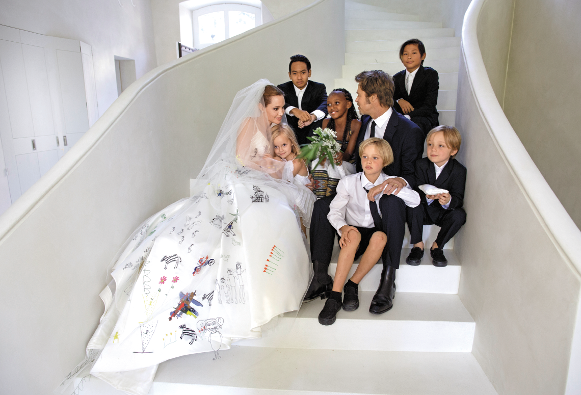 Анджелина Джоли и Брэд Питт сыграли свадьбу в 2014 году. Закрытая семейная церемония прошла в старинном шато пары во Франции, среди виноградников. Единственными гостями были их дети. Ответственную миссию по созданию подвенечного наряда Джоли поручила Донателле Версаче. Белоснежное платье для актрисы в единственном экземпляре сшила команда Atelier Versace.