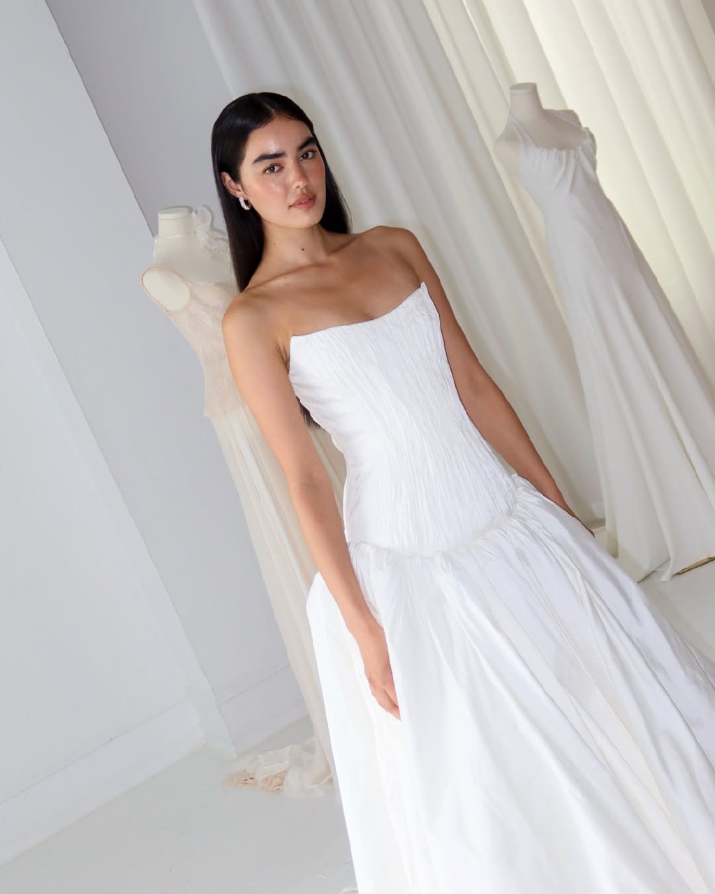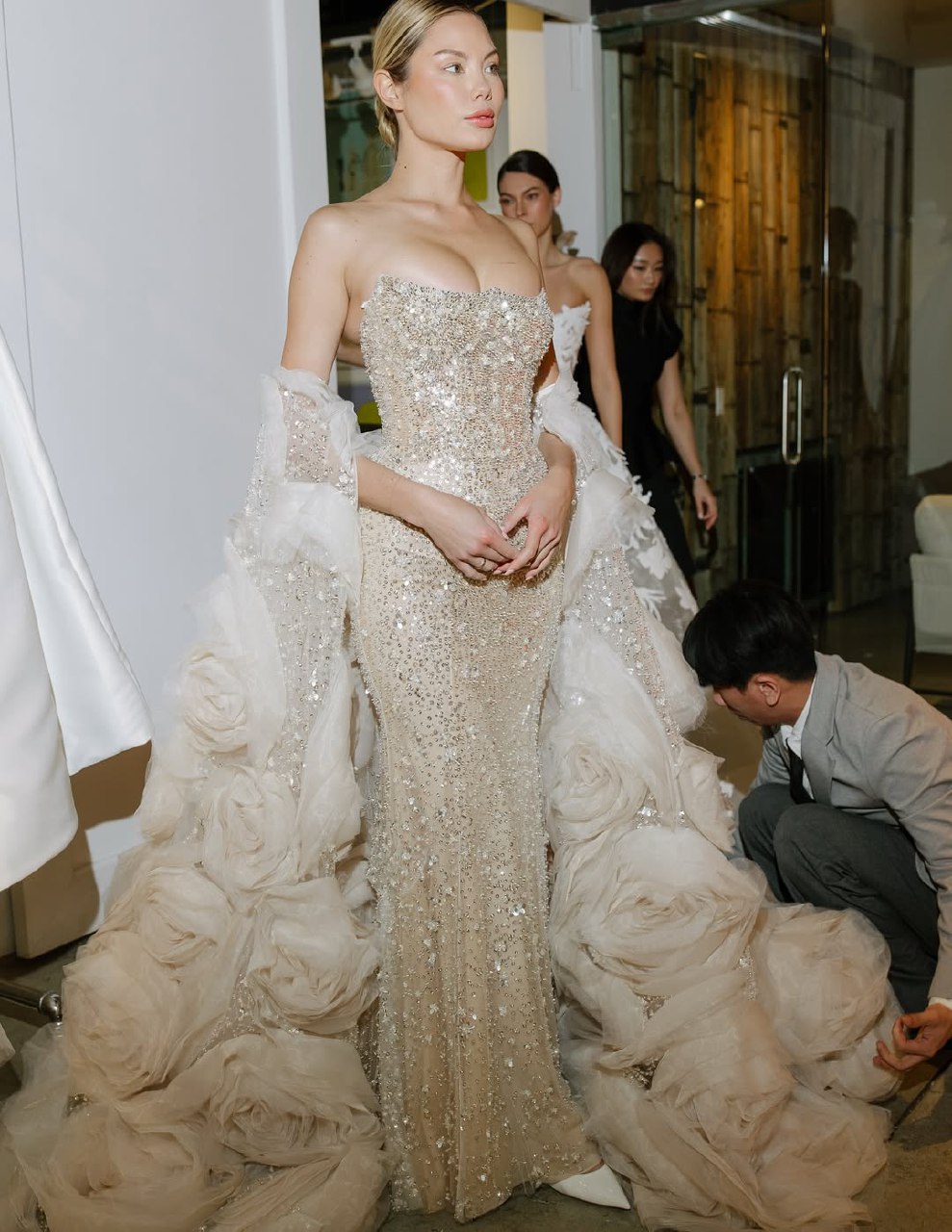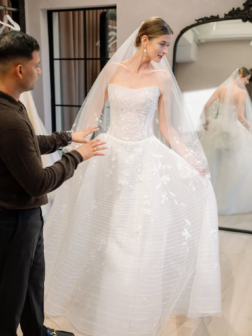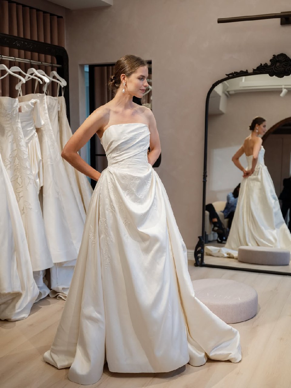Забудьте о тугих и высоких пучках, будущей весной и летом актуальна его непринужденная низкая версия. Этот тренд — идеальное воплощение современной элегантности. Пучок может выглядеть так, будто невеста сделала его всего за несколько минут до торжества, но за кажущейся простотой кроется ювелирная работа стилистов. Бренды Nicole + Felicia Couture, Jenny Yoo и другие показали, что низкий пучок может быть разным: от гладкого и собранного в тугой шарик у основания шеи до мягкого и текстурированного, с выпущенными прядями-обрамляющими лицо. Такой пучок не утяжеляет образ, а, наоборот, подчеркивает изящество шеи и линию декольте.