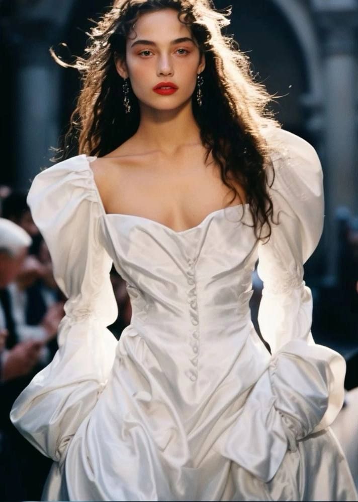 Ищите модели с завышенной или затянутой «баскской» талией, которые создают изящный силуэт «песочные часы». Отдайте предпочтение платьям из благородных тканей, таких как шелковый атлас, шифон, и обратите внимание на детали: рукава-фонарики, воротнички-стойки, шлейфы и, конечно, сложное кружево. Именно эти элементы несут в себе основную историческую отсылку и задают тон всему образу.