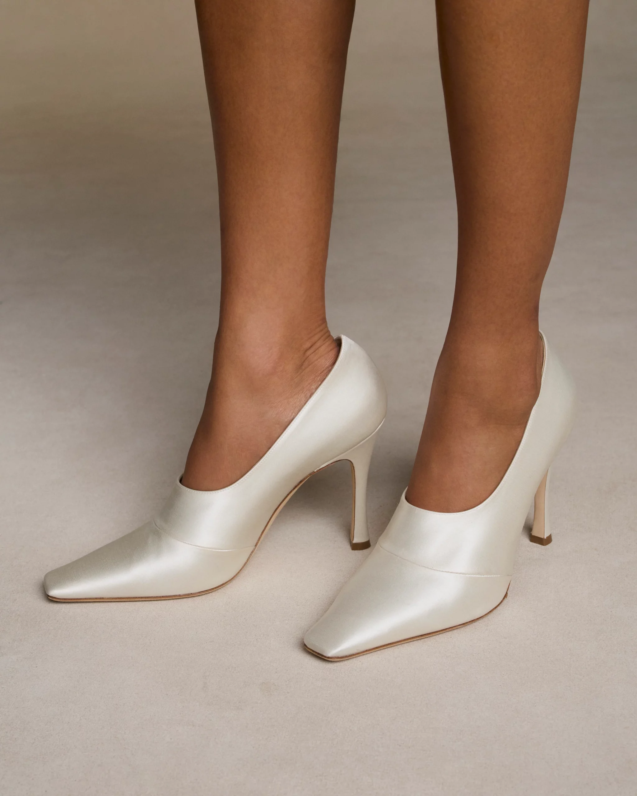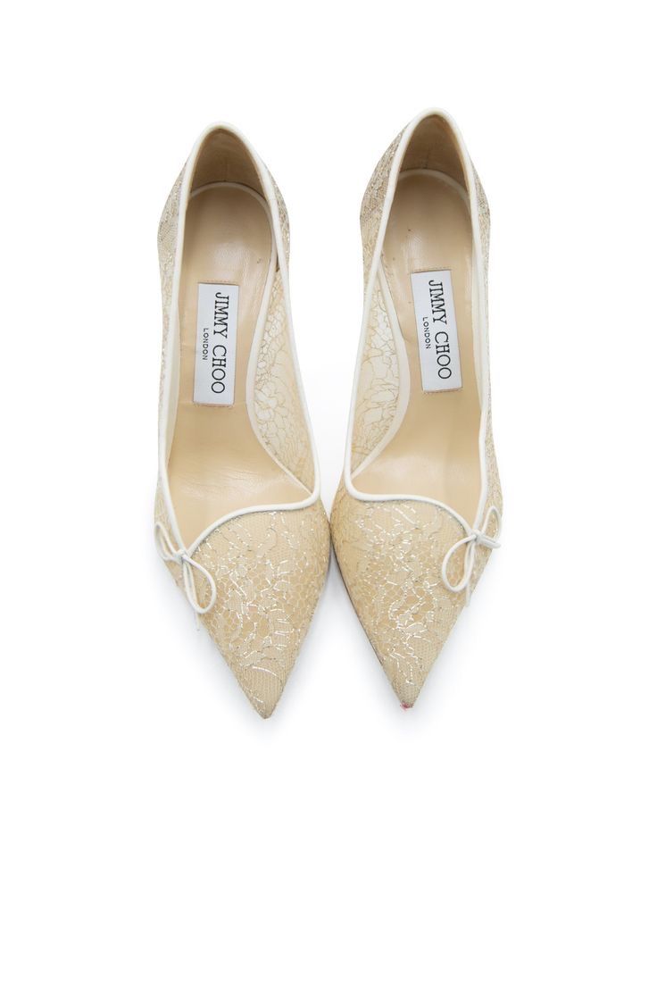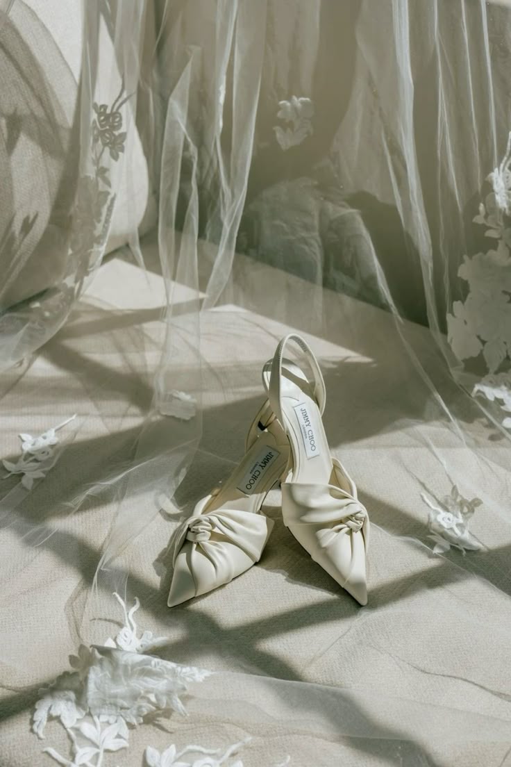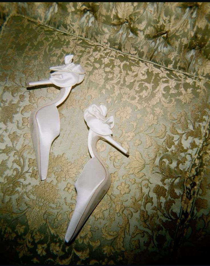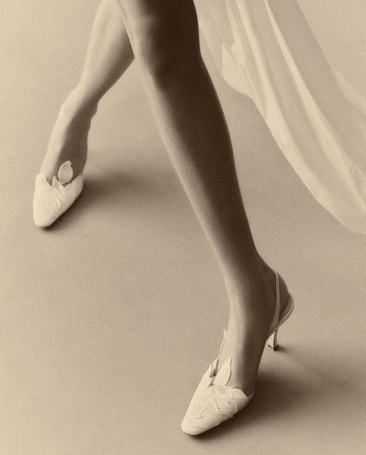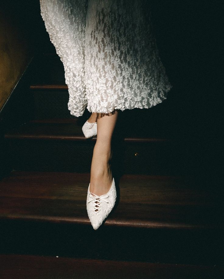 Обувь должна соответствовать общему настроению. Идеальным выбором станут атласные лодочки на небольшом каблуке, мюли или босоножки. Особого внимания заслуживают детали: нарочито длинный острый нос, шнуровка, очаровательные бантики, складки, кружевные вставки. Цвет — кремовый, экрю, нюдовый, золотой или серебряный, либо же можно подобрать обувь в тон платья.