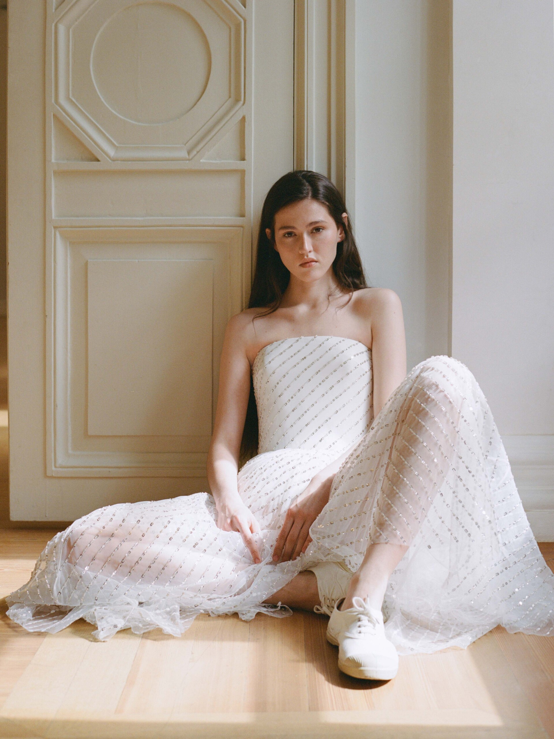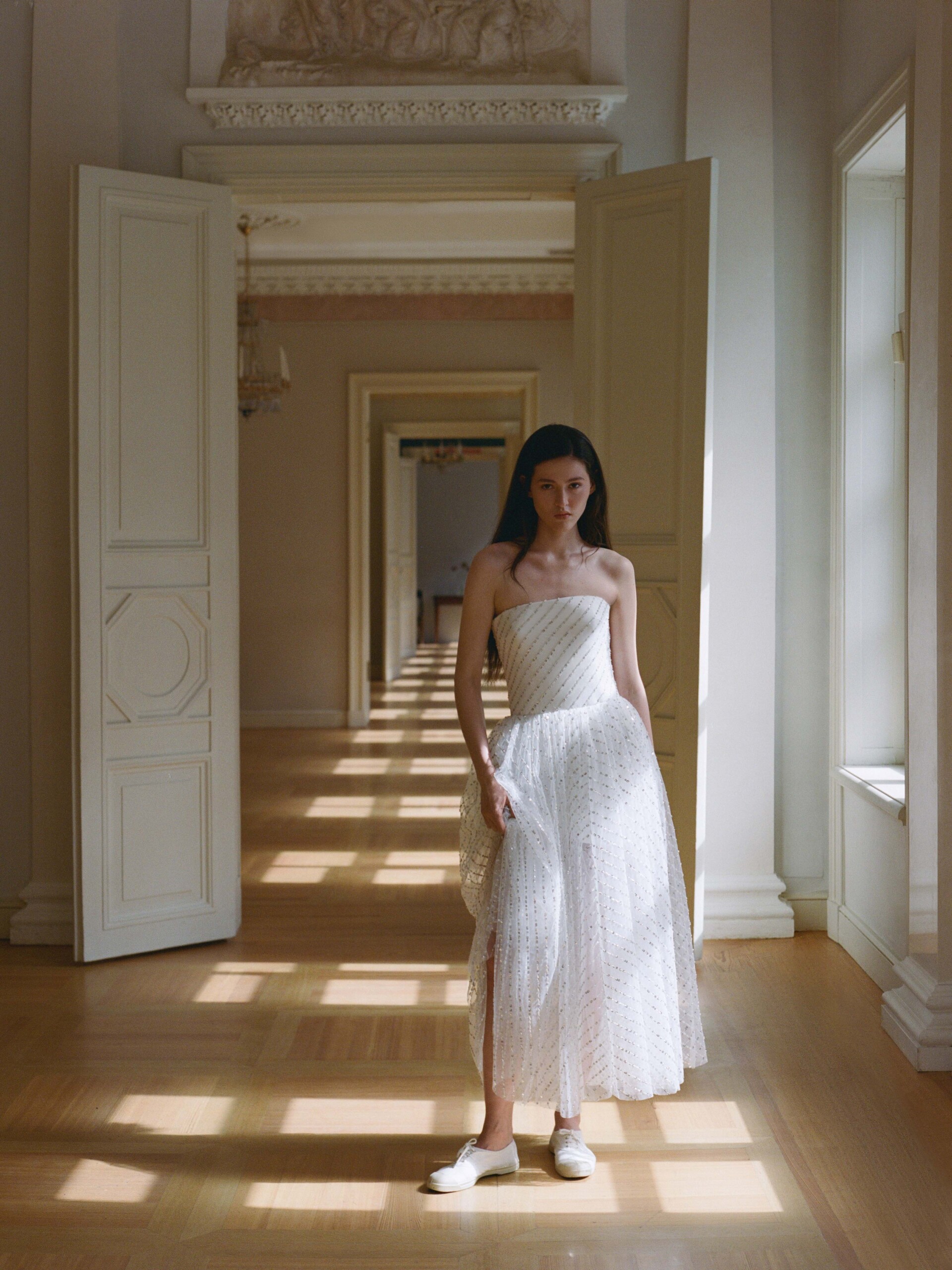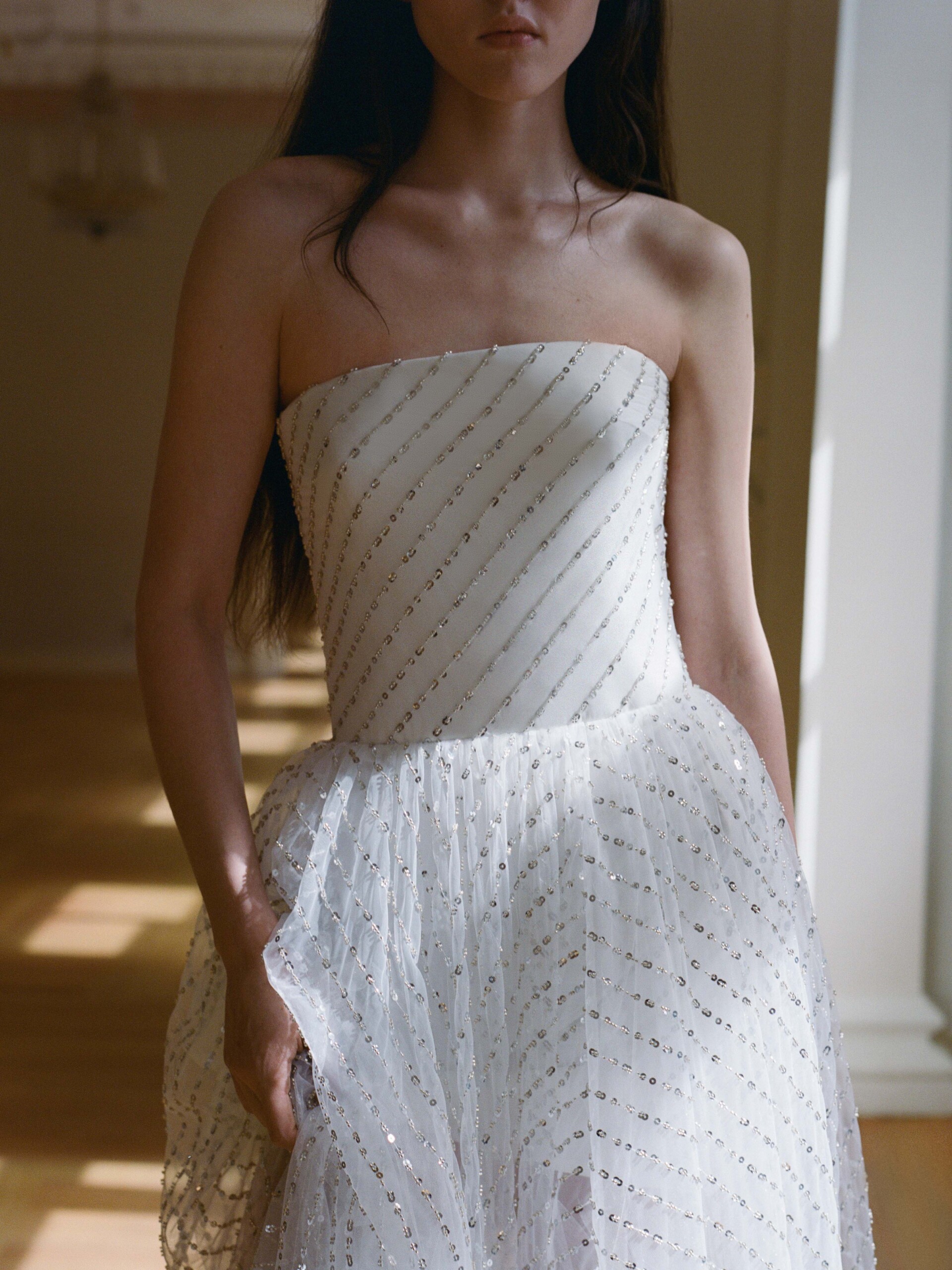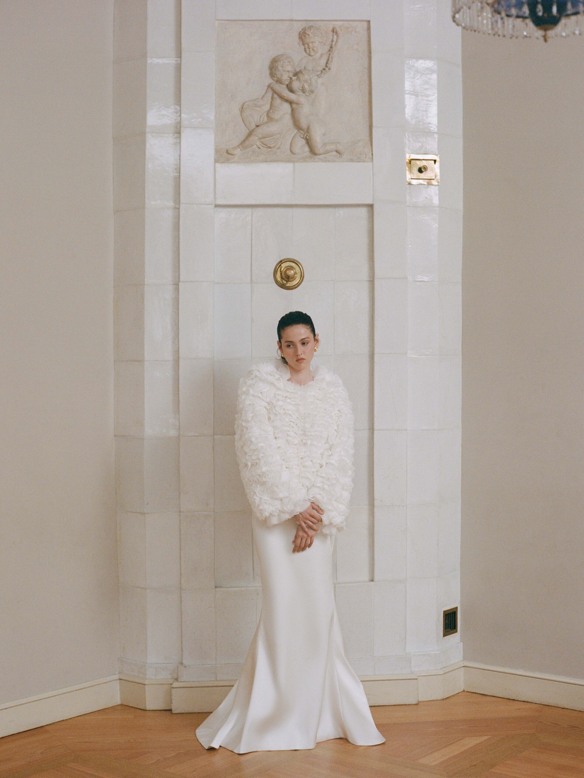 Белый цвет доминирует в коллекции Rasario Bridal, подчеркивая классическую элегантность свадебных нарядов. Каждая ткань тщательно выбрана для создания уникального образа: кордовое кружево добавляет изысканности, мягкий сатин — блеска и гладкости, а плотный атлас обеспечивает структуру и объем. Фатин с пайетками и бисером придает платьям воздушность, в то время как использование матового крепа в отдельных моделях добавляет современные акценты и обогащает коллекцию разнообразием текстур.