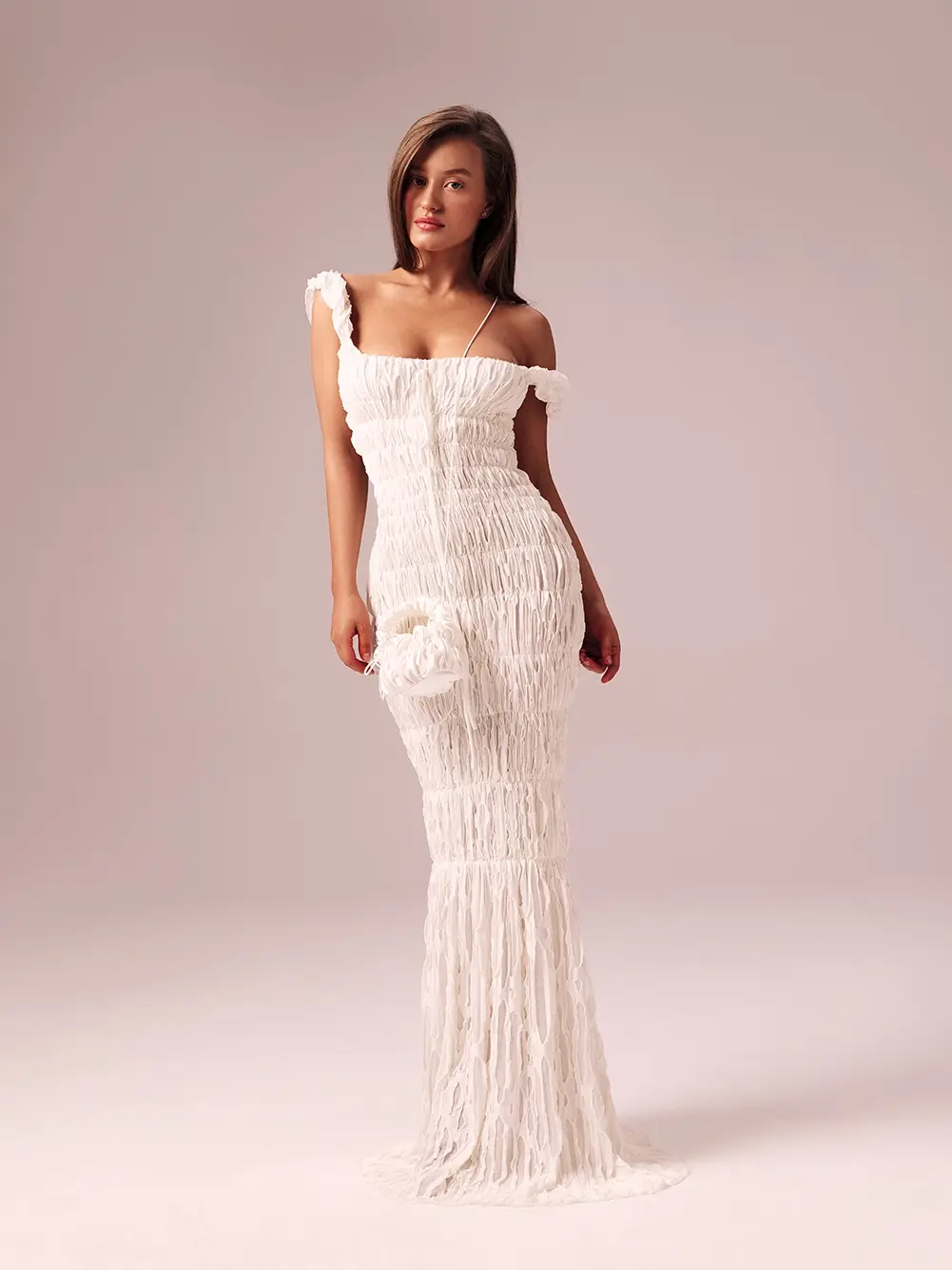 Для более формального ужина в ресторане можно выбрать платье-футляр длиной миди или наряд в пол без лишних деталей. Свадебная мода последних сезонов говорит «да» фактурам: кружево, перфорация, тонкая вязка или нежные аппликации. При этом старайтесь избегать ощущения слишком торжественного наряда, иначе есть риск затмить основное платье. Welcome party или вечеринка-приветствие — это про дружеские объятия, бокал шампанского в расслабленной позе и легкость передвижений.