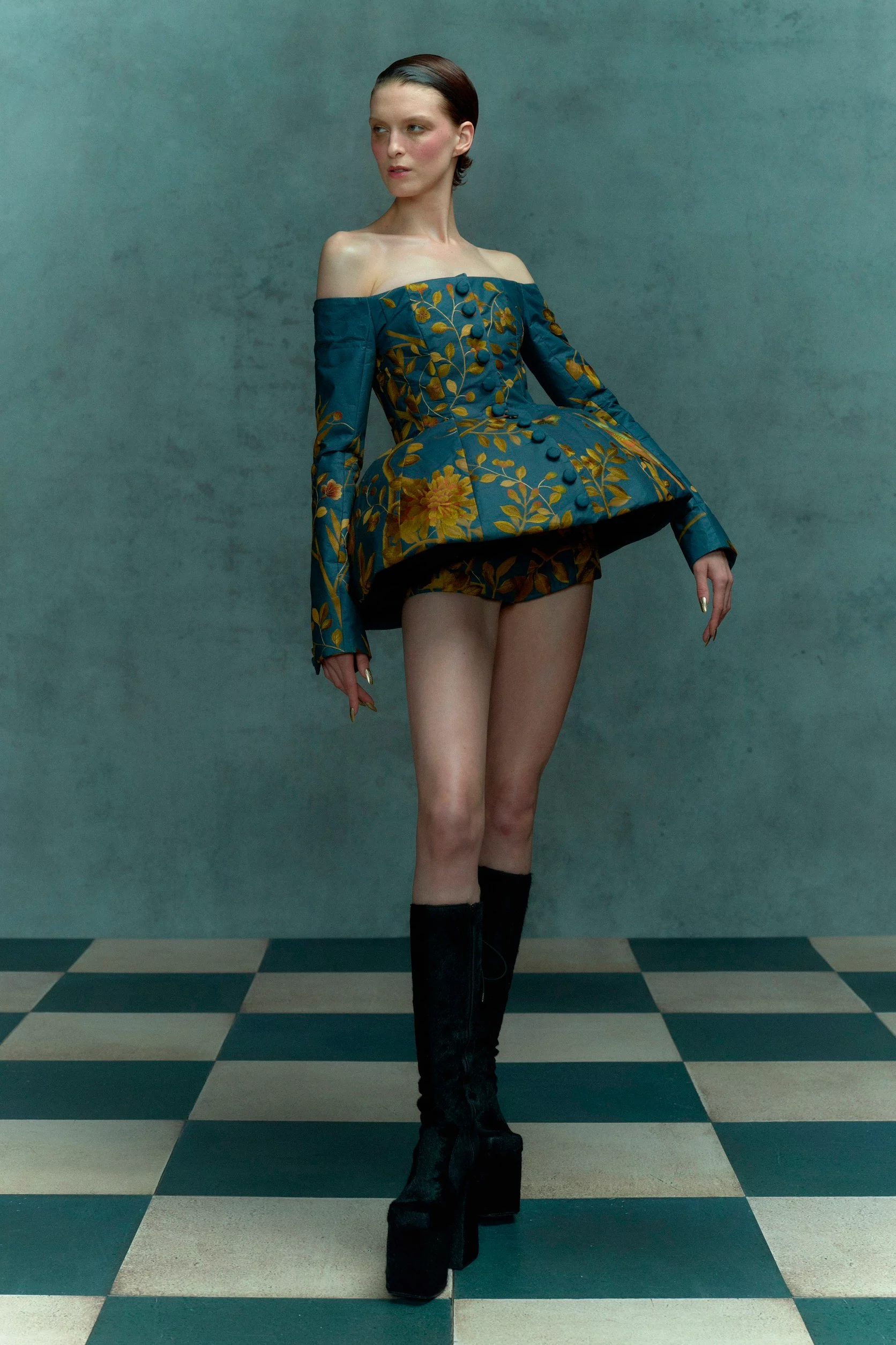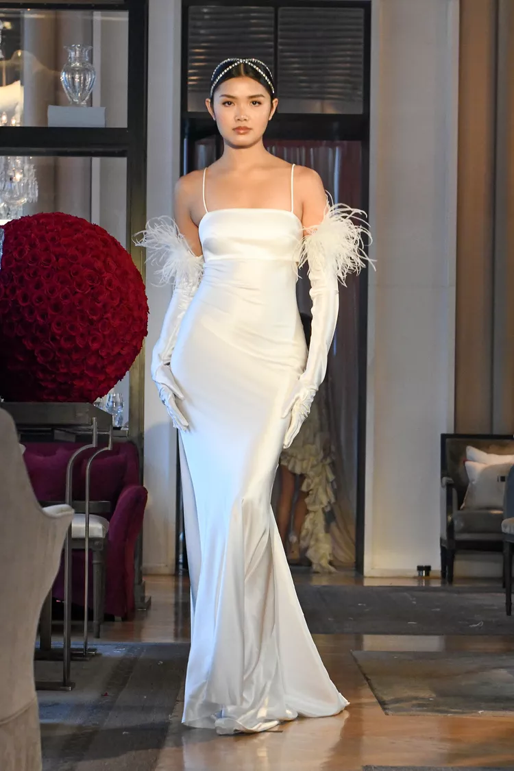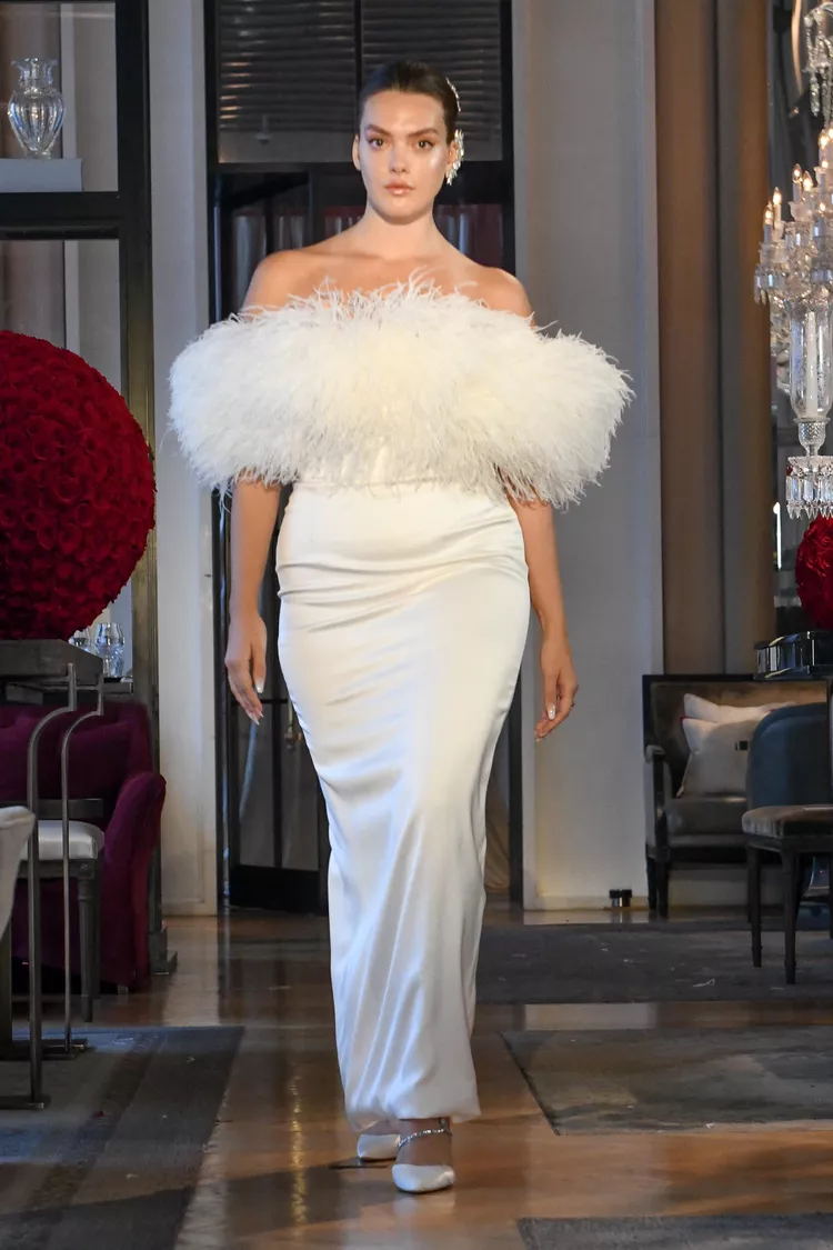 В капсулу вошли мини-платья, наряды с перьями и блестками, костюмы из кружева, платья-жакеты, полупрозрачная одежда и многое другое. Что примечательно, в коллекции было несколько роскошных образов для невест plus-size. Помимо интересных дизайнов марка показала необычные примеры стилизации с помощью аксессуаров. Перчатки, ободки, массивные чокеры с жемчугом и шляпы с фатой добавили акцентов образам и сделали их по-настоящему интересным.