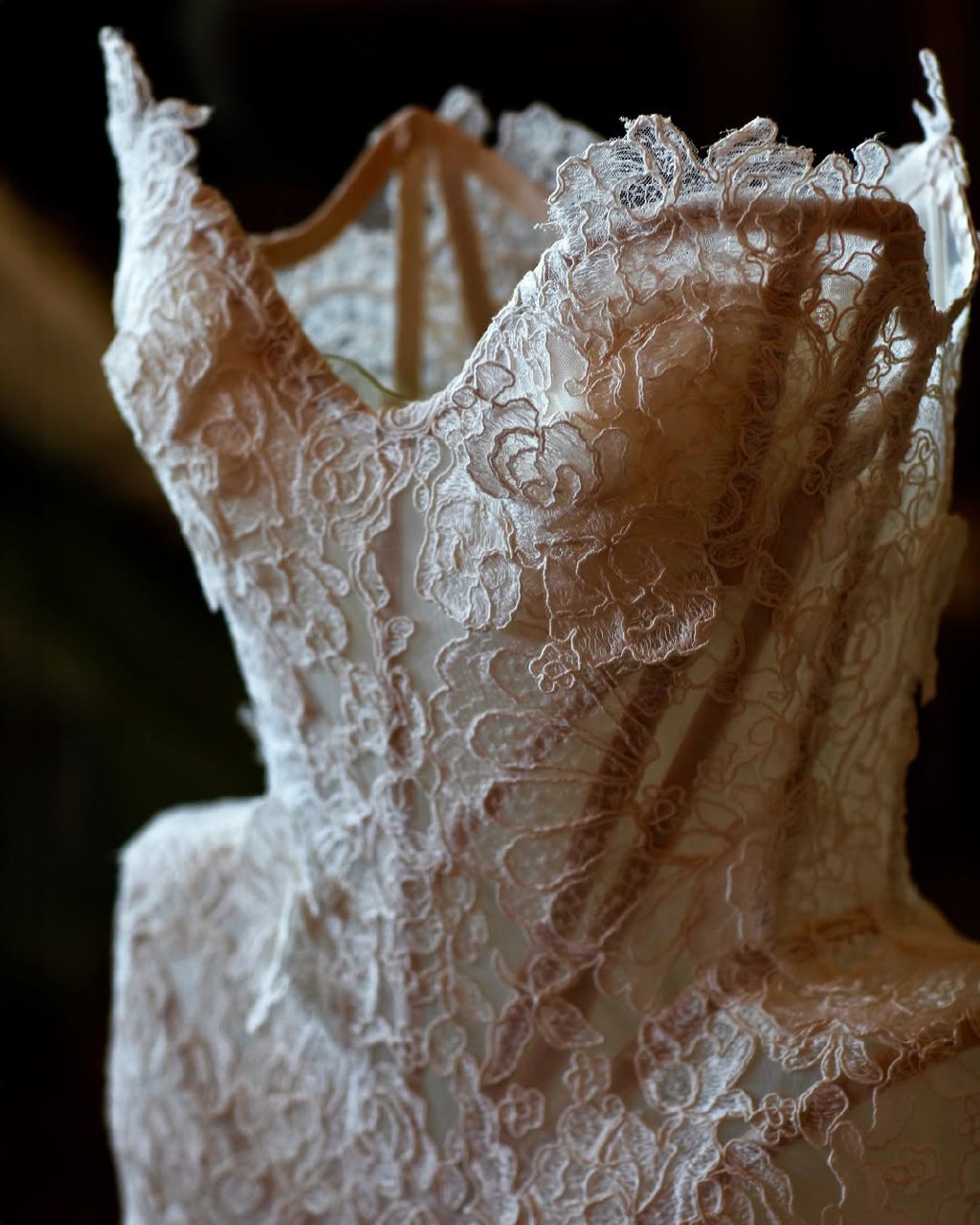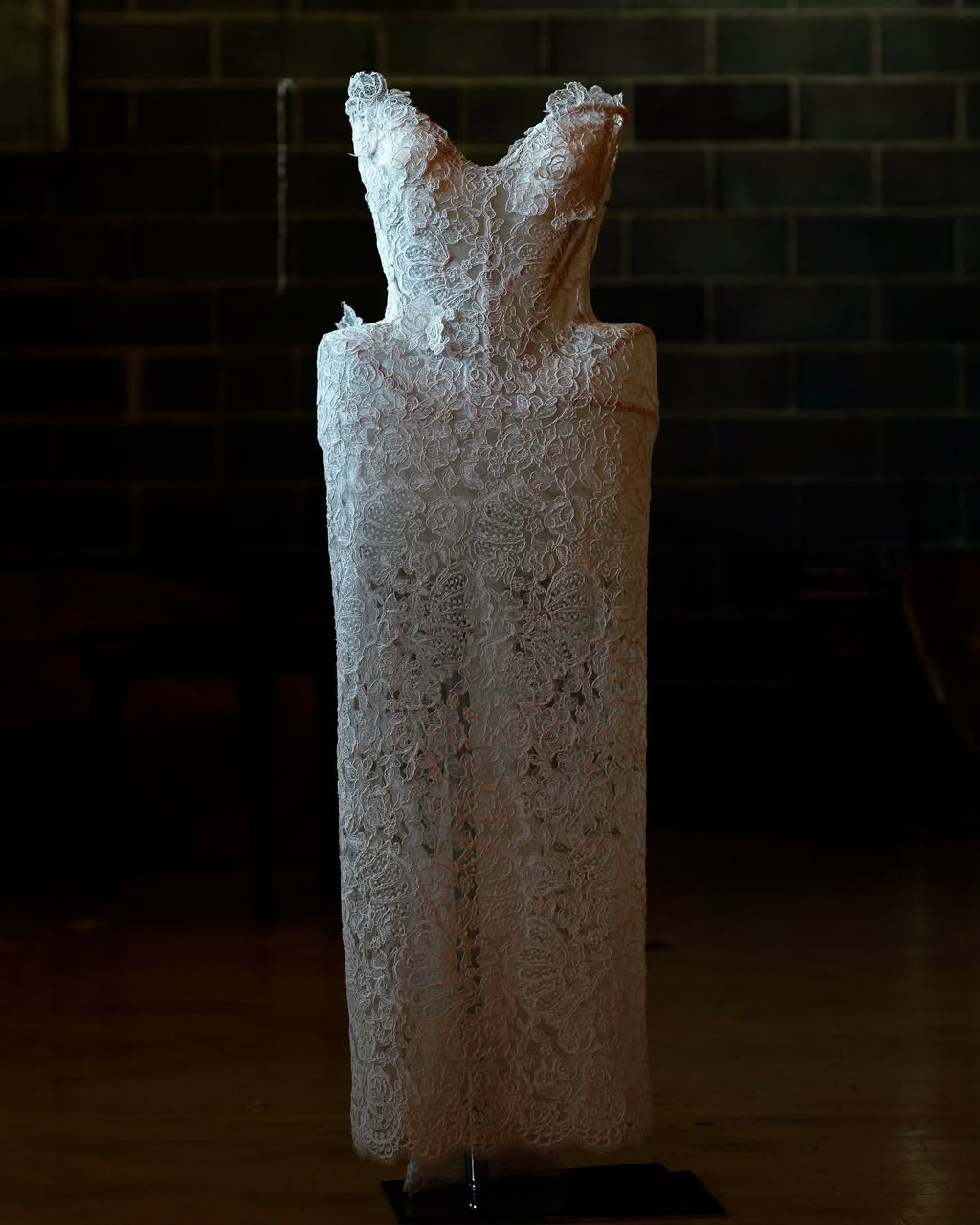 Корсет для этого свадебного образа был создан на заказ для невесты по имени Энрика. Она архитектор по профессии, поэтому дизайнер решил сделать ставку скульптурный и женственные силуэт. В результате получилось платье в пол из кружева с прямой юбкой и архитектурным корсетом с гипертрофированными бедрами. Наряд был создан в единственном экземпляре, его стоимость не уточняется.