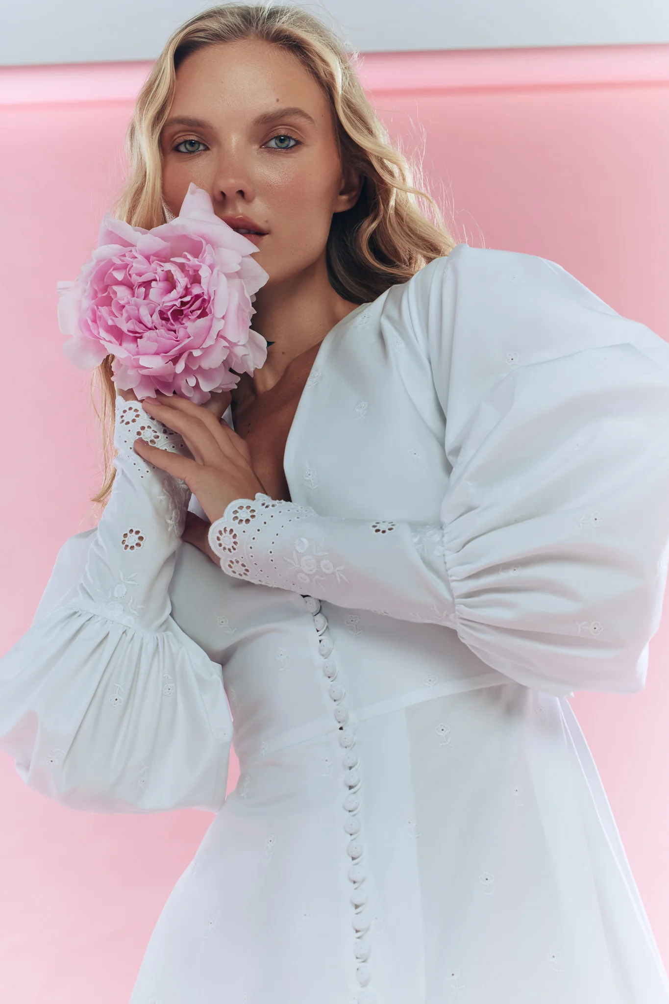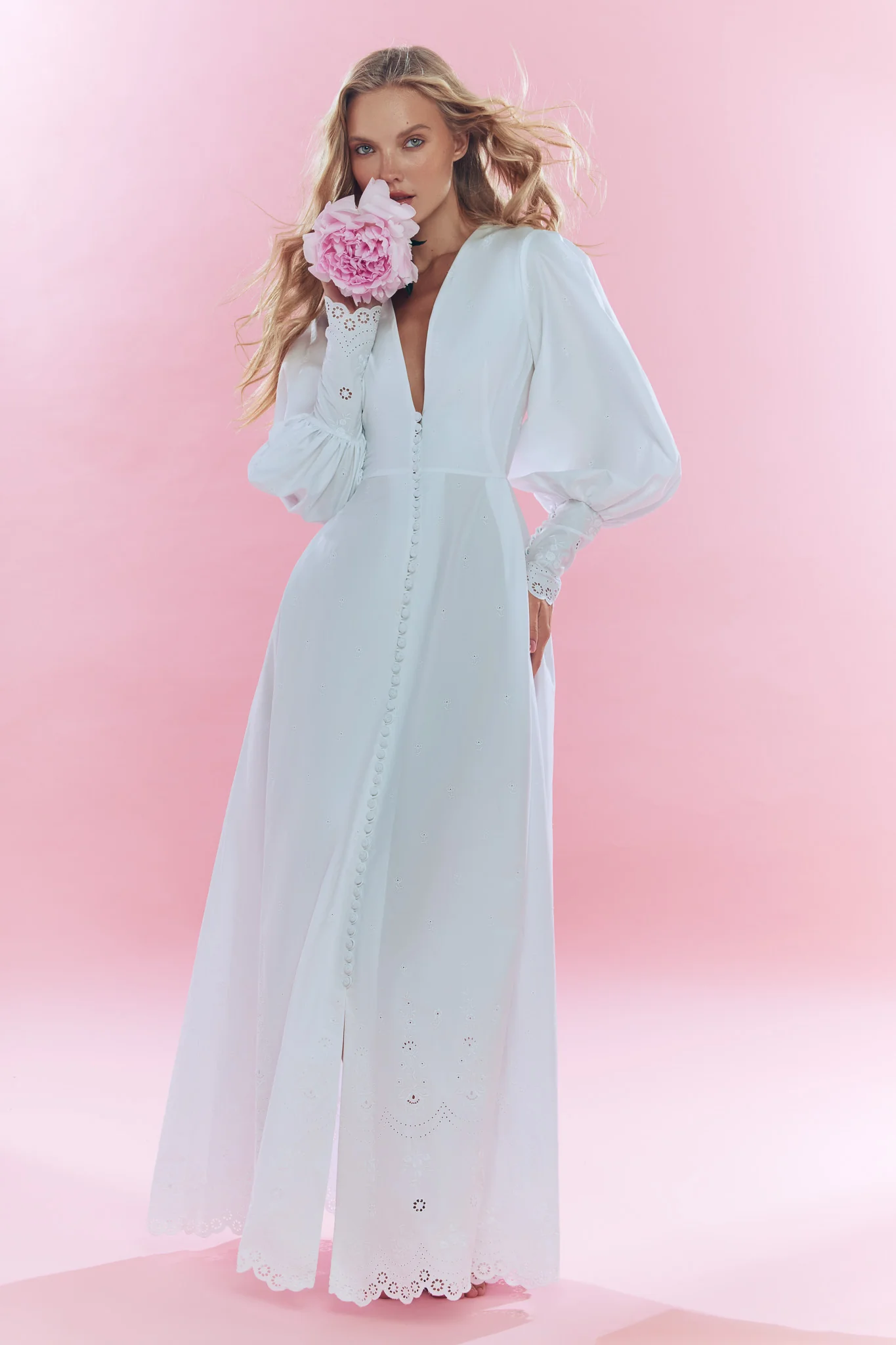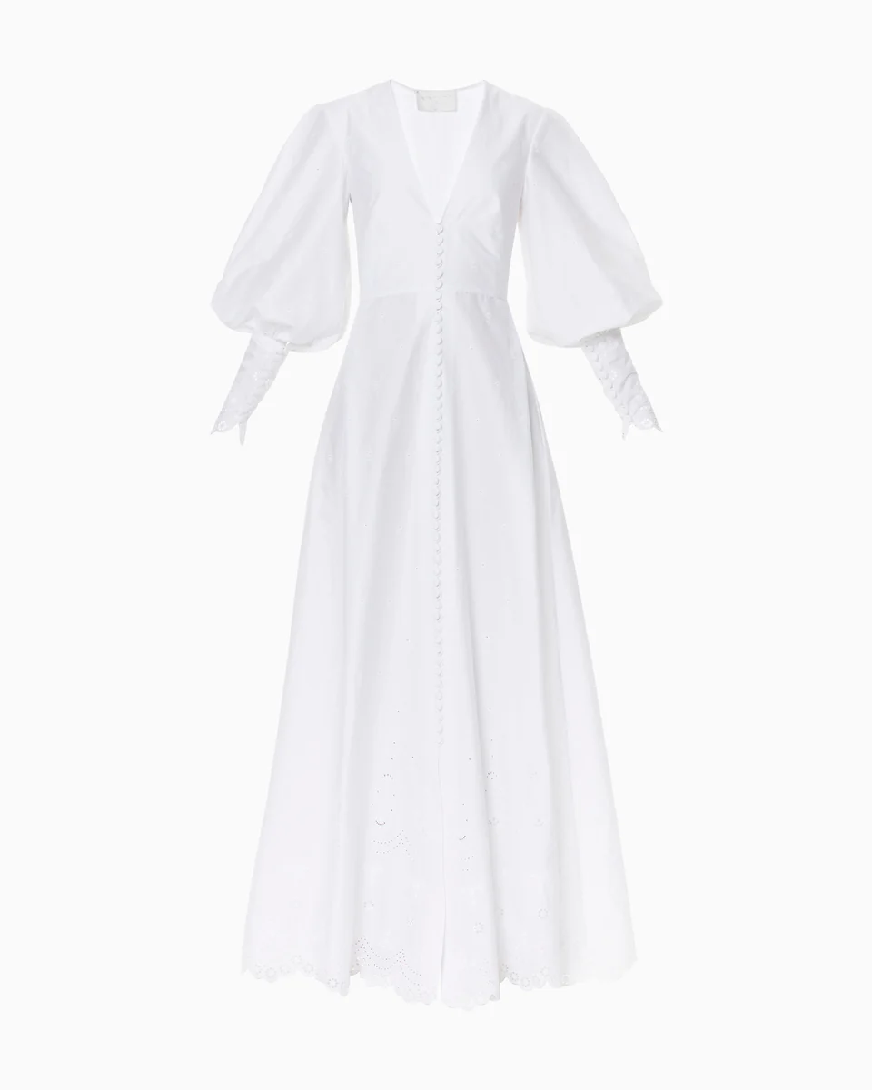 Романтичное платье PIMELEA выполнено в стилистике 19-го века и сшито из итальянского хлопка. Наряд отличают объемные рукава, высокие манжеты с ажурной оторочкой и десятки маленьких пуговиц на передней стороне. Сдержанный силуэт удачно сбалансирован соблазнительным вырезом. Идеальный вариант для осенней свадьбы на природе. Сейчас платье доступно на сайте бренда со скидкой 50%, его стоимость составляет 39 750 рублей.
