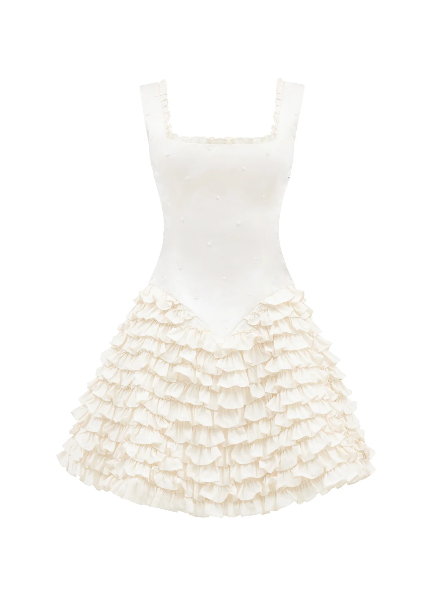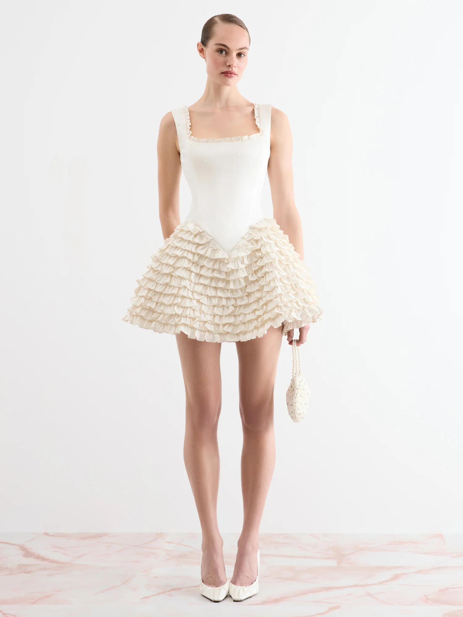 Платье «Балерина» из коллекции бренда сочетает в себе красивый силуэт, романтичное настроение и женственность. Наряд состоит из плотного корсета на завязках, который подчеркивает фигуру и зону декольте. Объемная мини-юбка с рюшами из тафты делает образ игривым и дерзким. Платье доступно на официальном сайте французской марки Clio Peppiatt, его стоимость составляет € 3600.