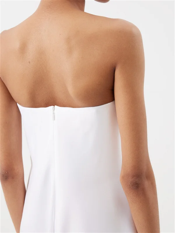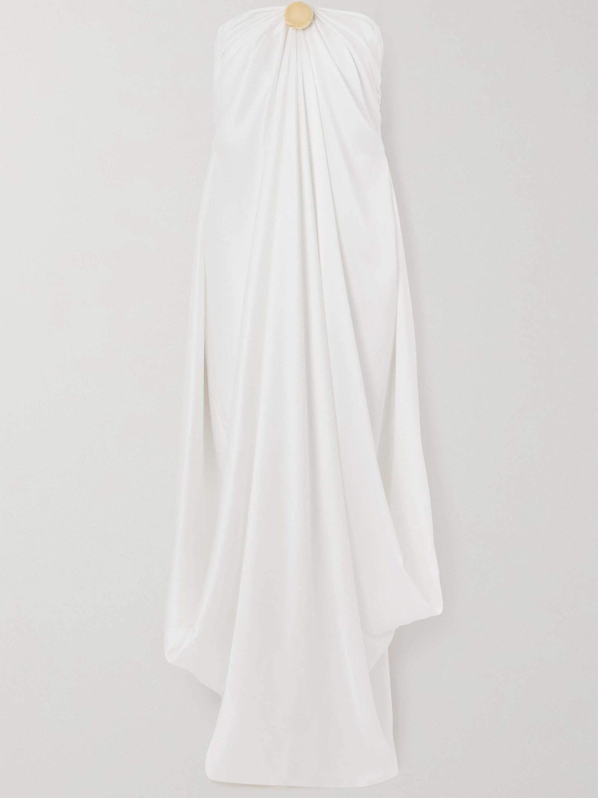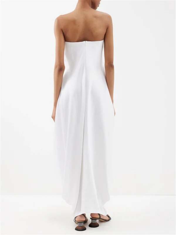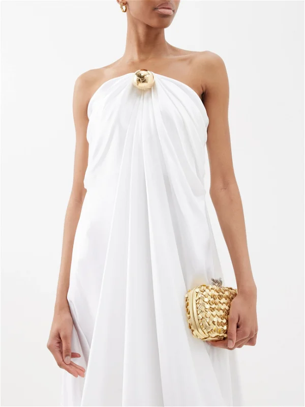 Сложный дизайн отсылает к образам греческих богинь, платье сшито из 100-процентного плотного шелка. Минималистичный дизайн дополняет массивная золотистая брошь в форме сферы, она фиксирует платье по центру в зоне бюстье и создает красивые складки. Подобный образ идеально подойдет для летней свадьбы в греческом стиле. Открытый верх подчеркивает шею и зону декольте, а длина макси добавляет наряду торжественности. Стоимость платья составляет около 470 000 рублей.