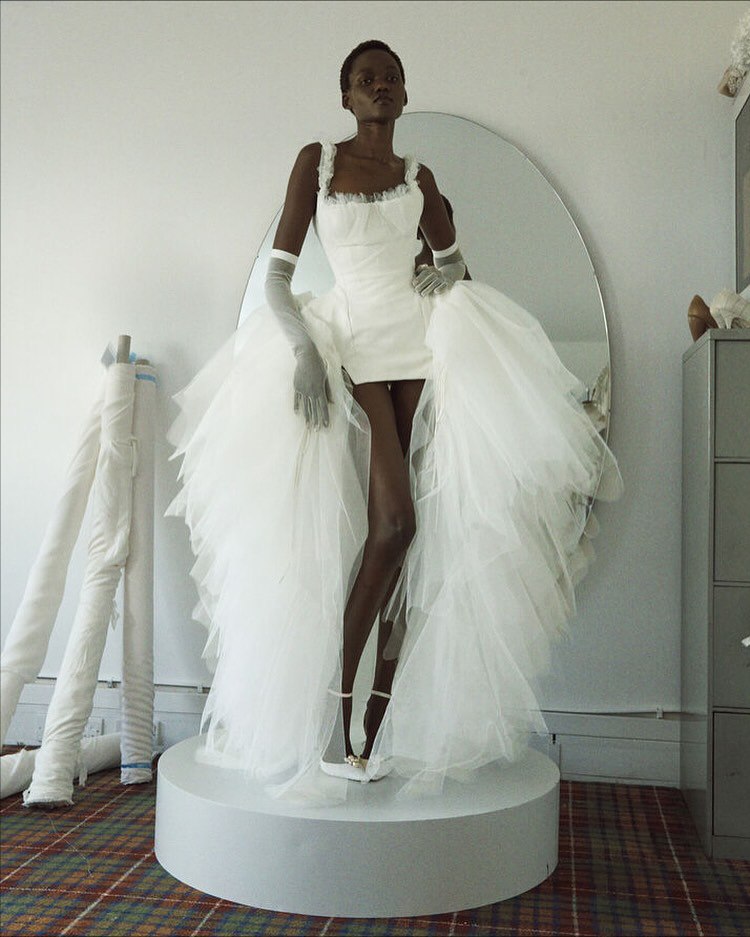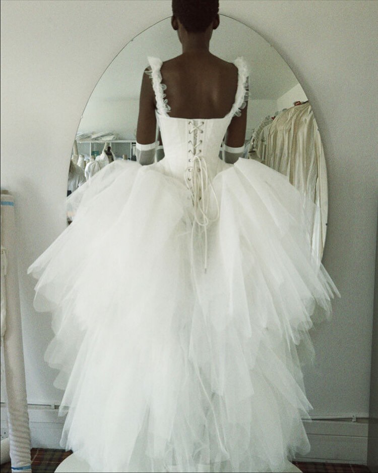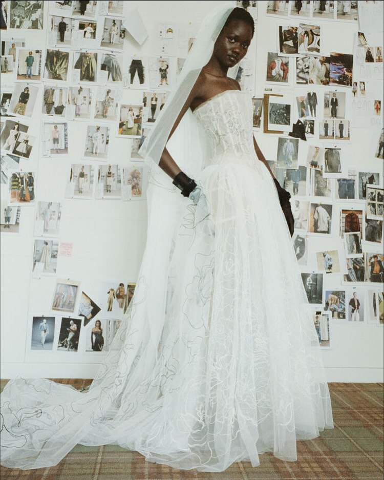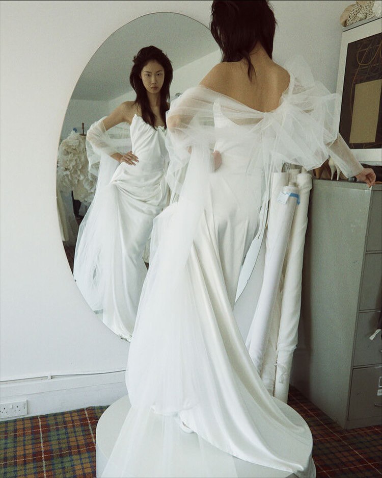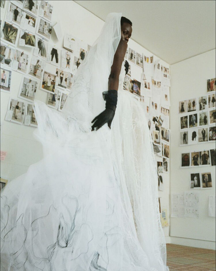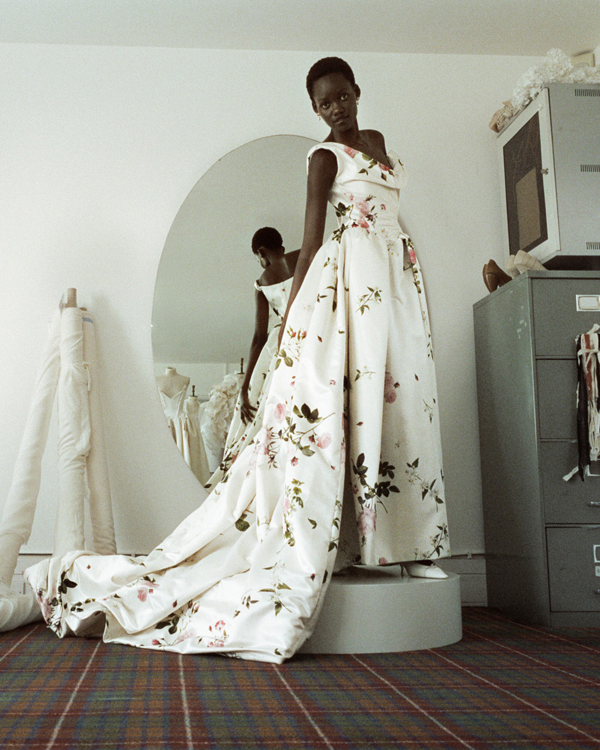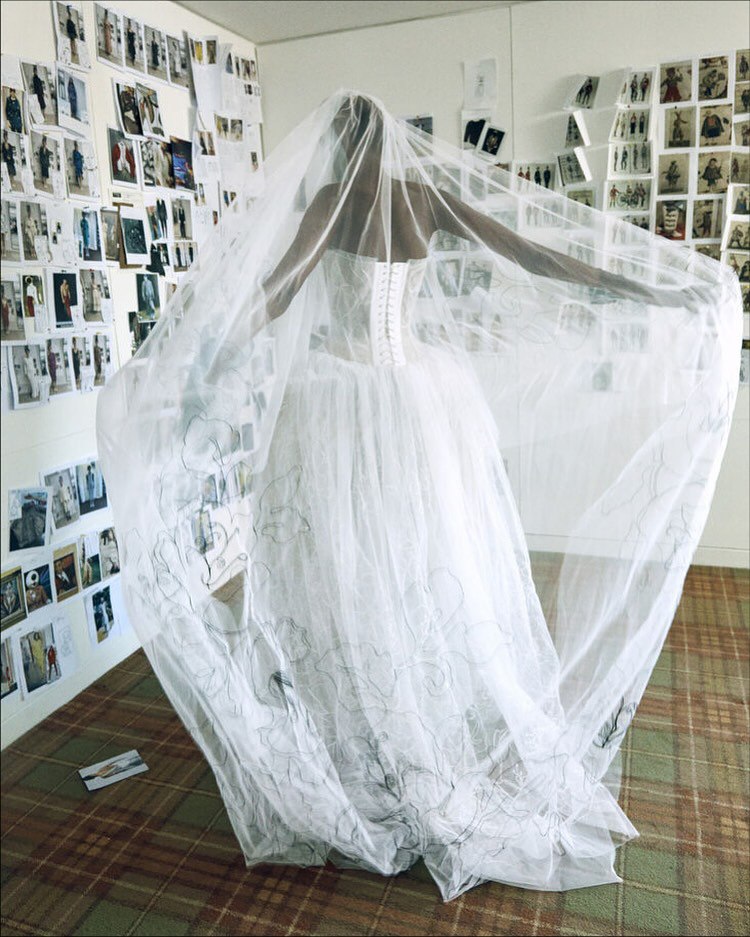 В коллекции есть редкое платье с принтом, розы навеяны ботаническими акварелями Пьера-Жозефа Редуте XVIII века; а цветки апельсина позаимствованы из дворика университета, они символизируют невинность и чистоту.