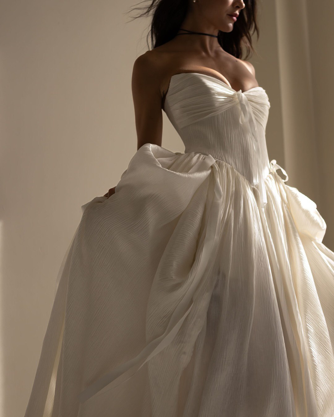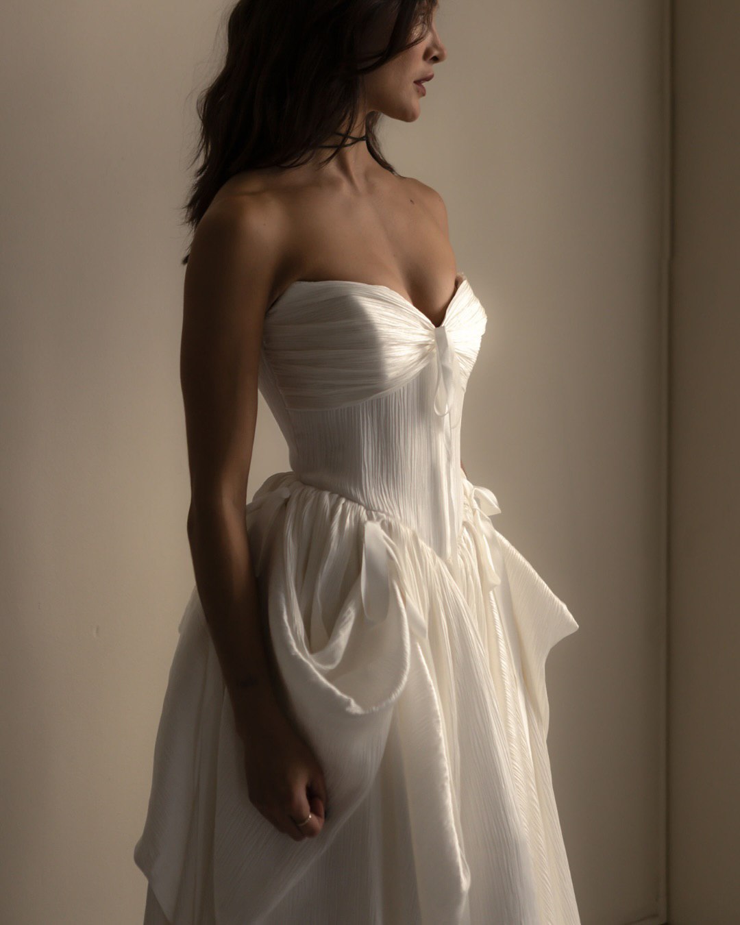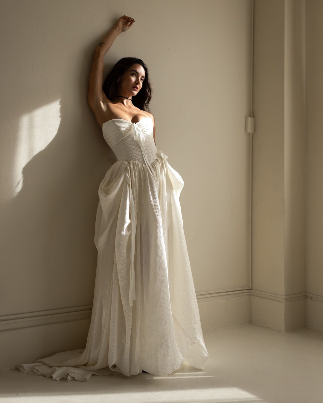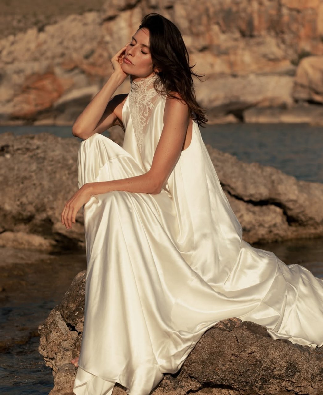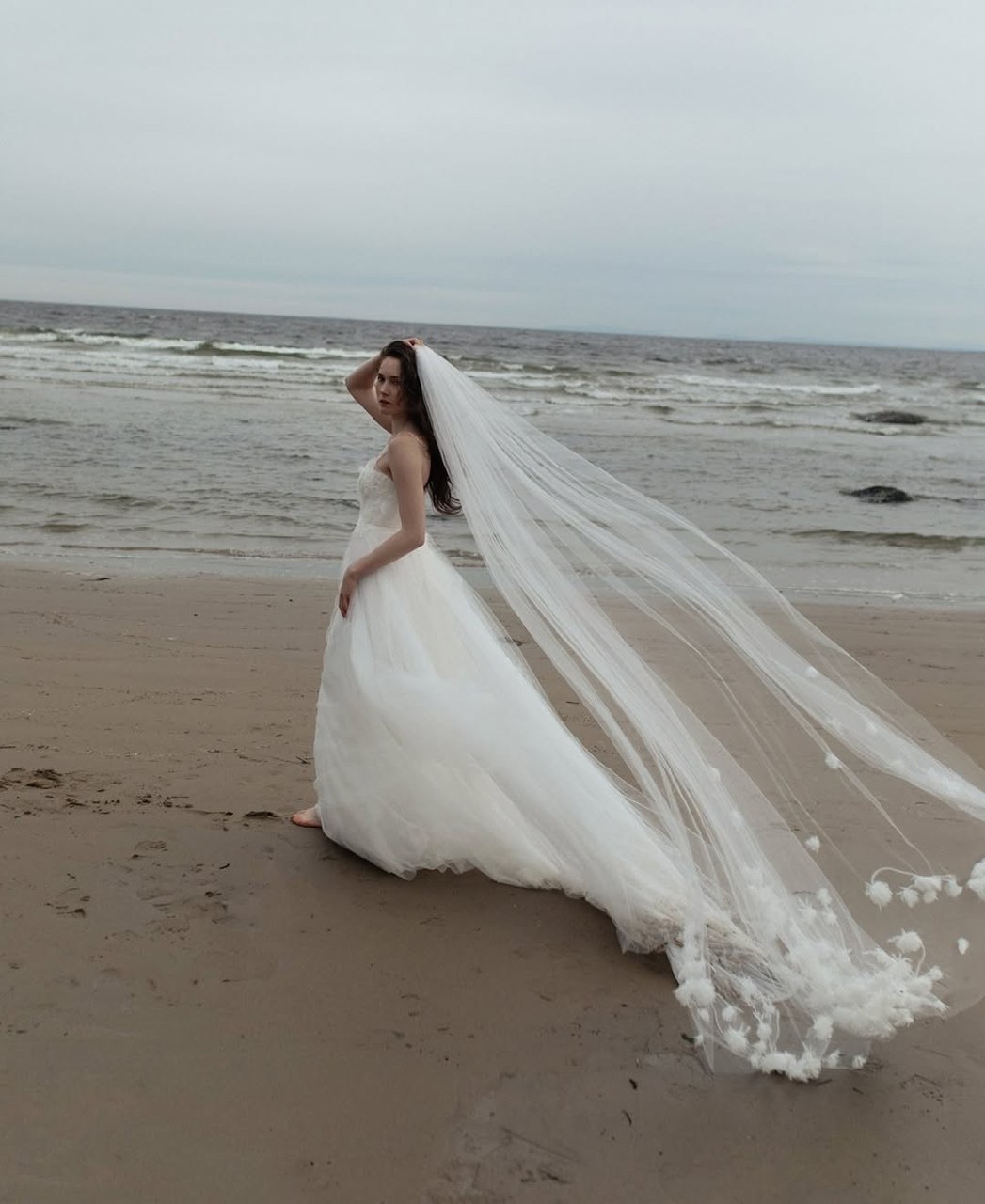 Дизайны гармонично сочетают современную эстетику с вневременной классикой. Шелковый тюль и газовый шифон струятся подобно легкому бризу, а продуманные силуэты балансируют между динамикой и скульптурностью. Это ода многогранности любви и женственности — для современной невесты, чтящей традиции, но создающей собственную историю.