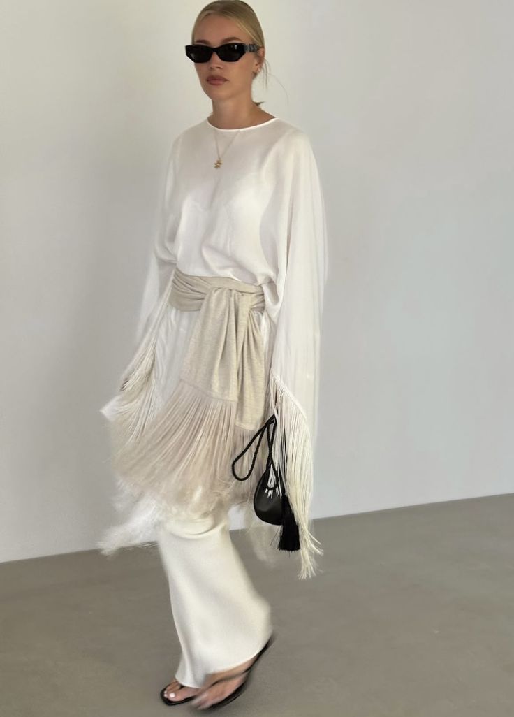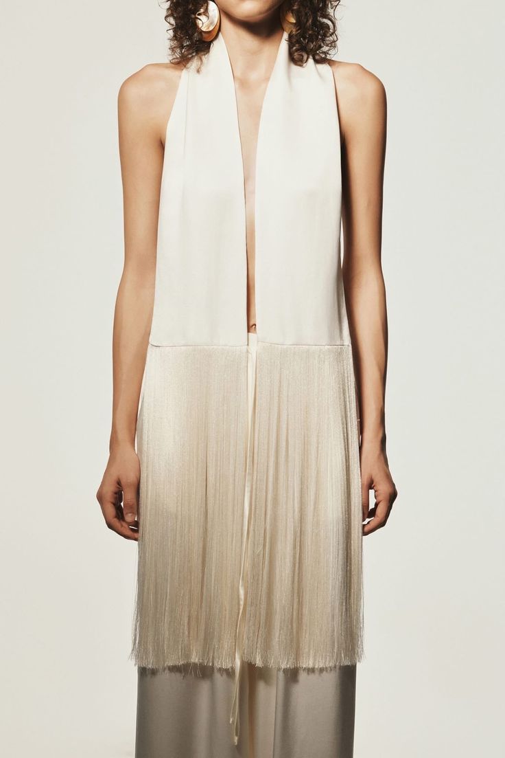 Главные хиты — асимметричные юбки-макси с длинными вертикальными нитями и узкие шелковые шарфы. Особого внимания заслуживают модели с бахромой из бисера, которые мерцают при каждом движении, создавая эффект водопада или драгоценного ливня.