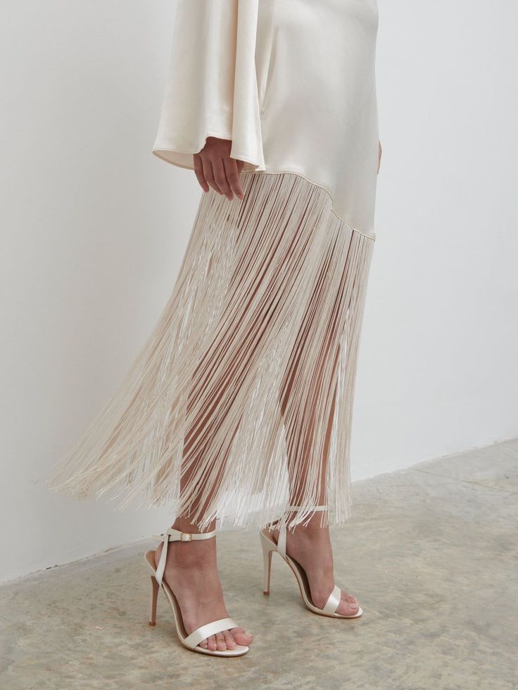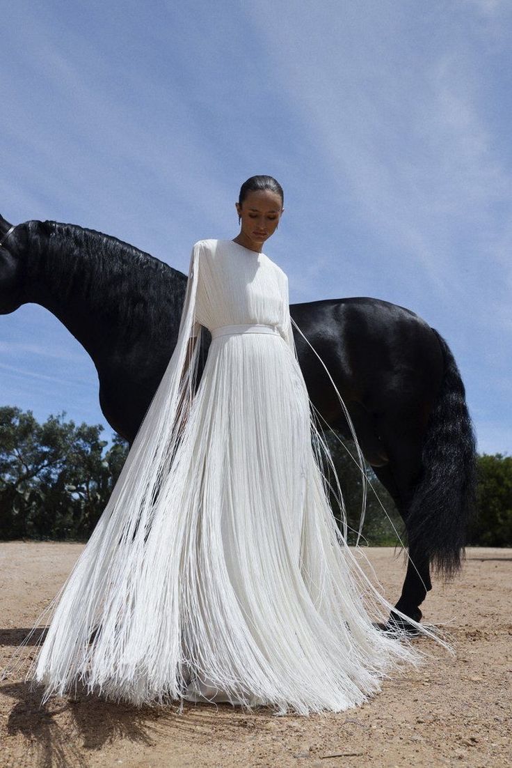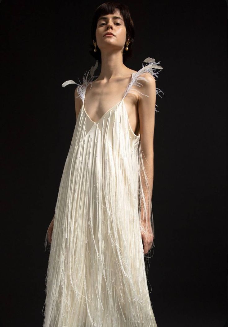 Вдохновляясь показами Alaïa и Chanel, невесты все чаще делают выбор в пользу этих подвижных нитей. Теперь бахрома — это не просто декор, а архитектурный элемент кроя.