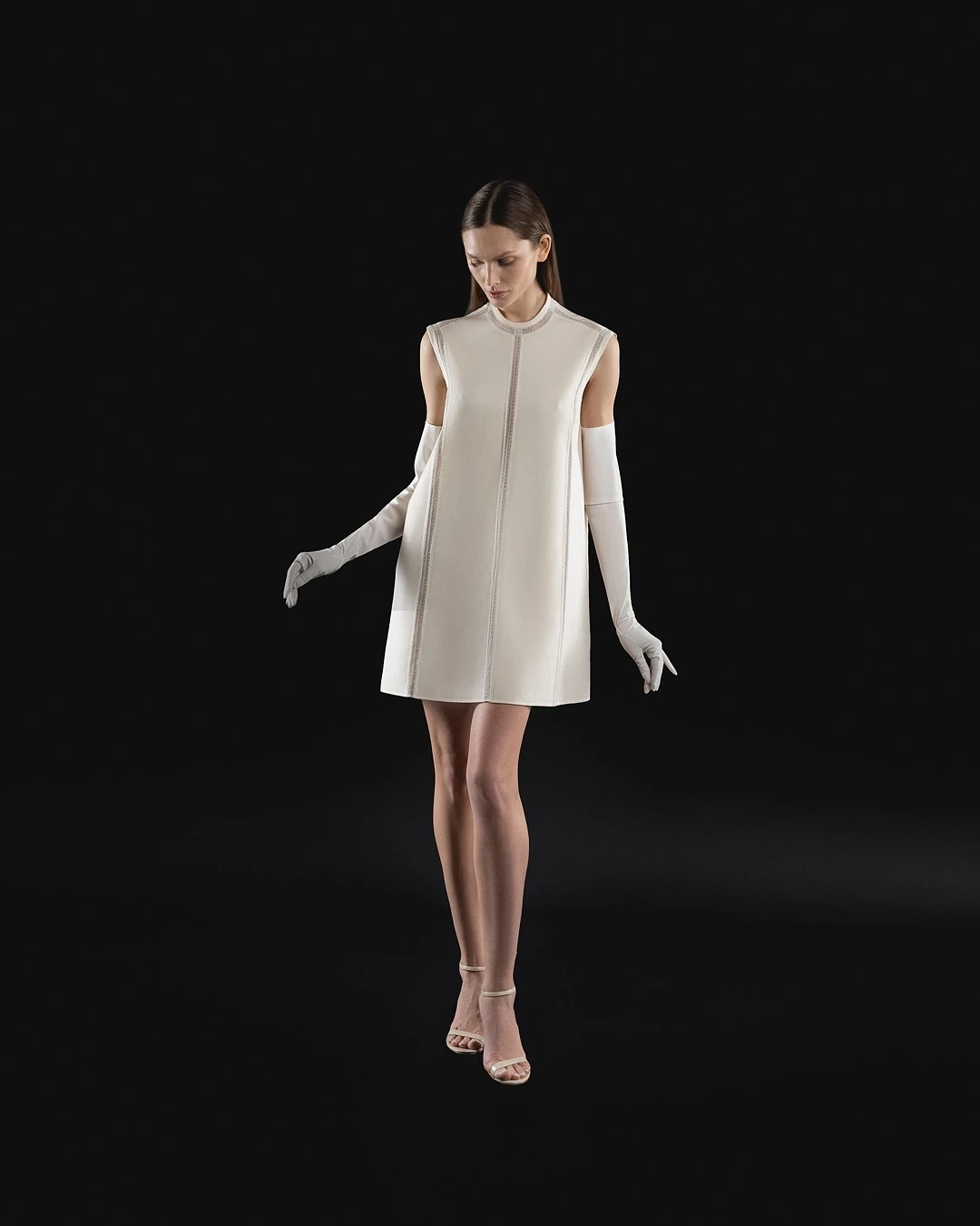 Вертикальные детали — бант, спускающийся от талии; ряд пуговиц на спине — также вытягивают силуэт.