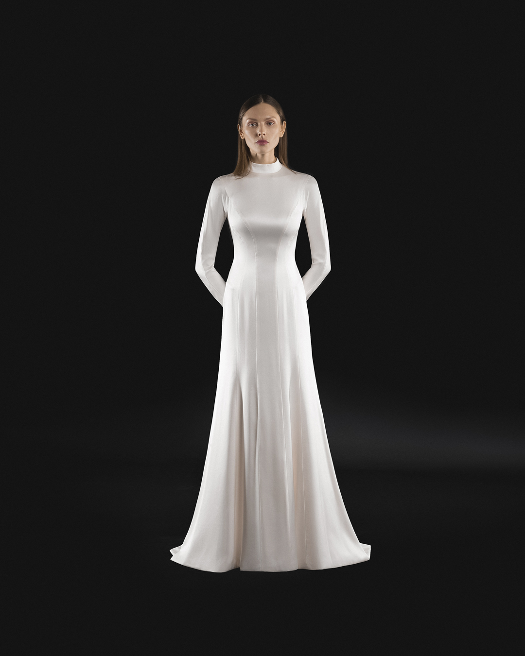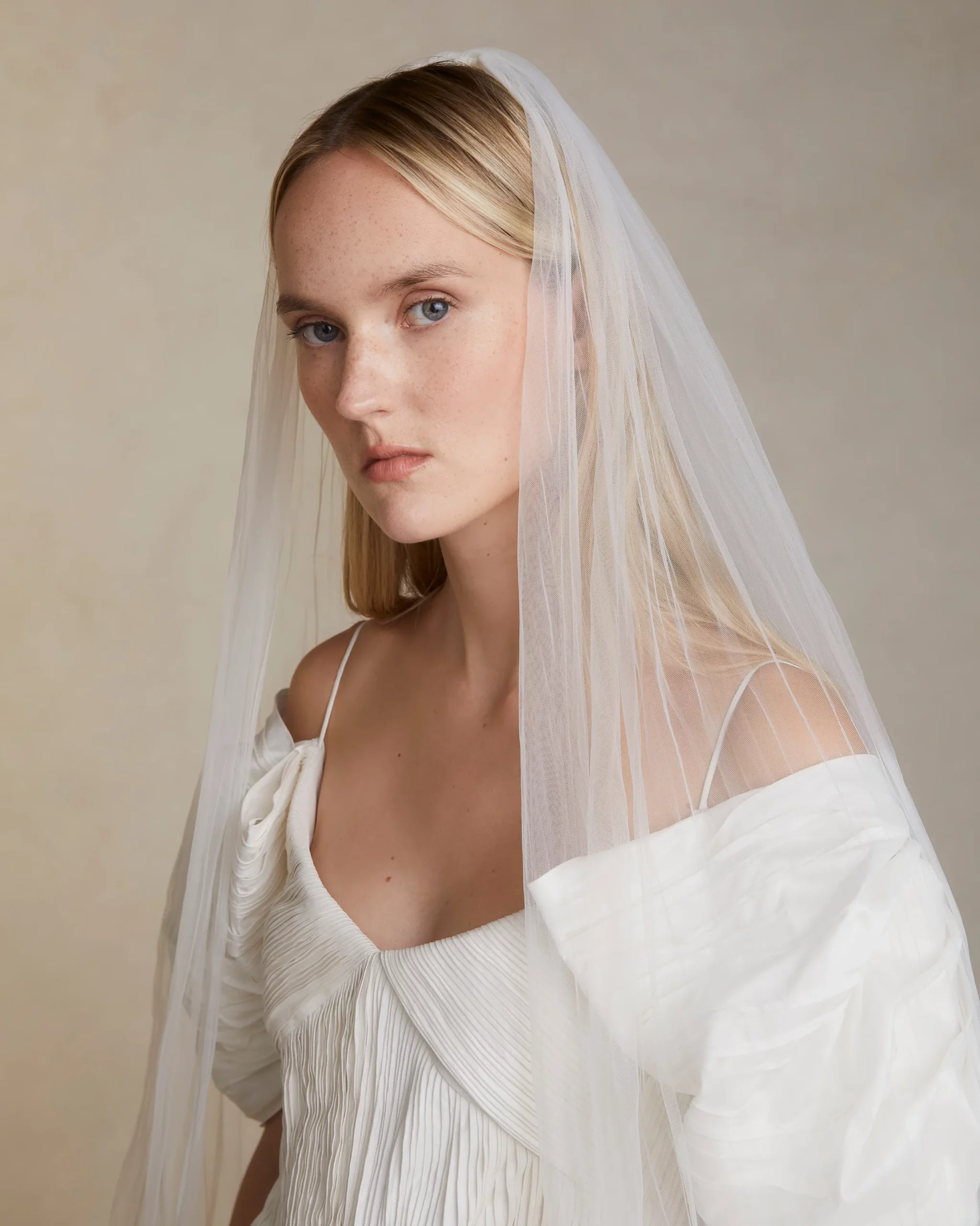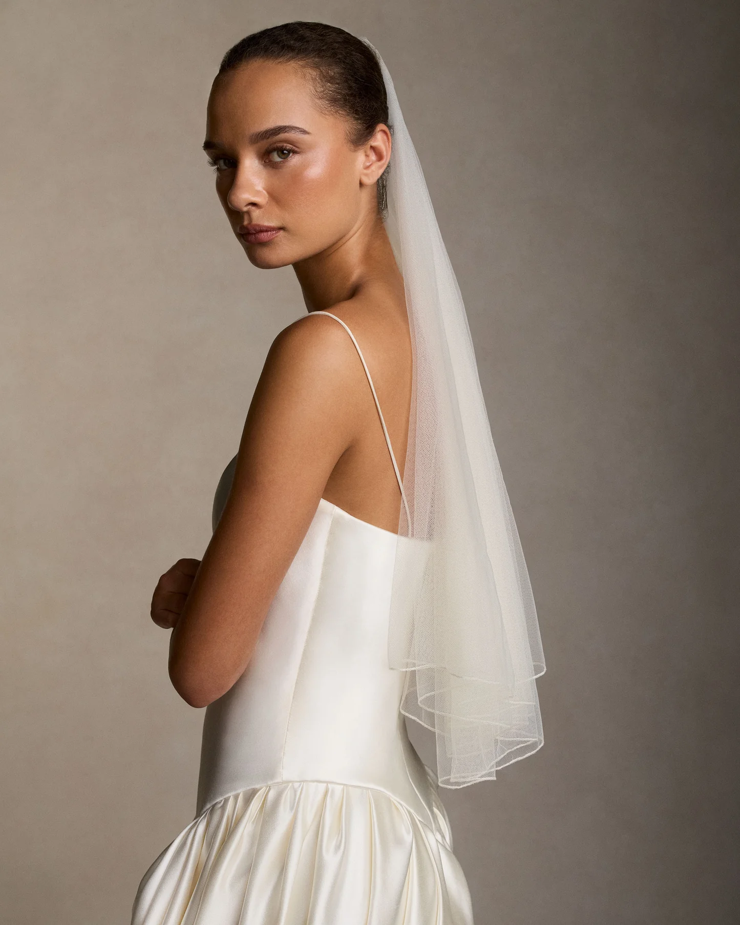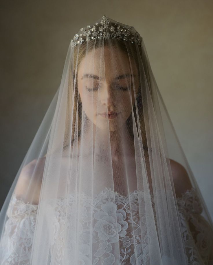 В случае с миниатюрной невестой каждый сантиметр работает на образ. Вместо объемной фаты выберите короткую вуаль-паутинку или минималистичную однослойную длинную фату — она струится вертикально, не создавая лишнего объема у плеч.