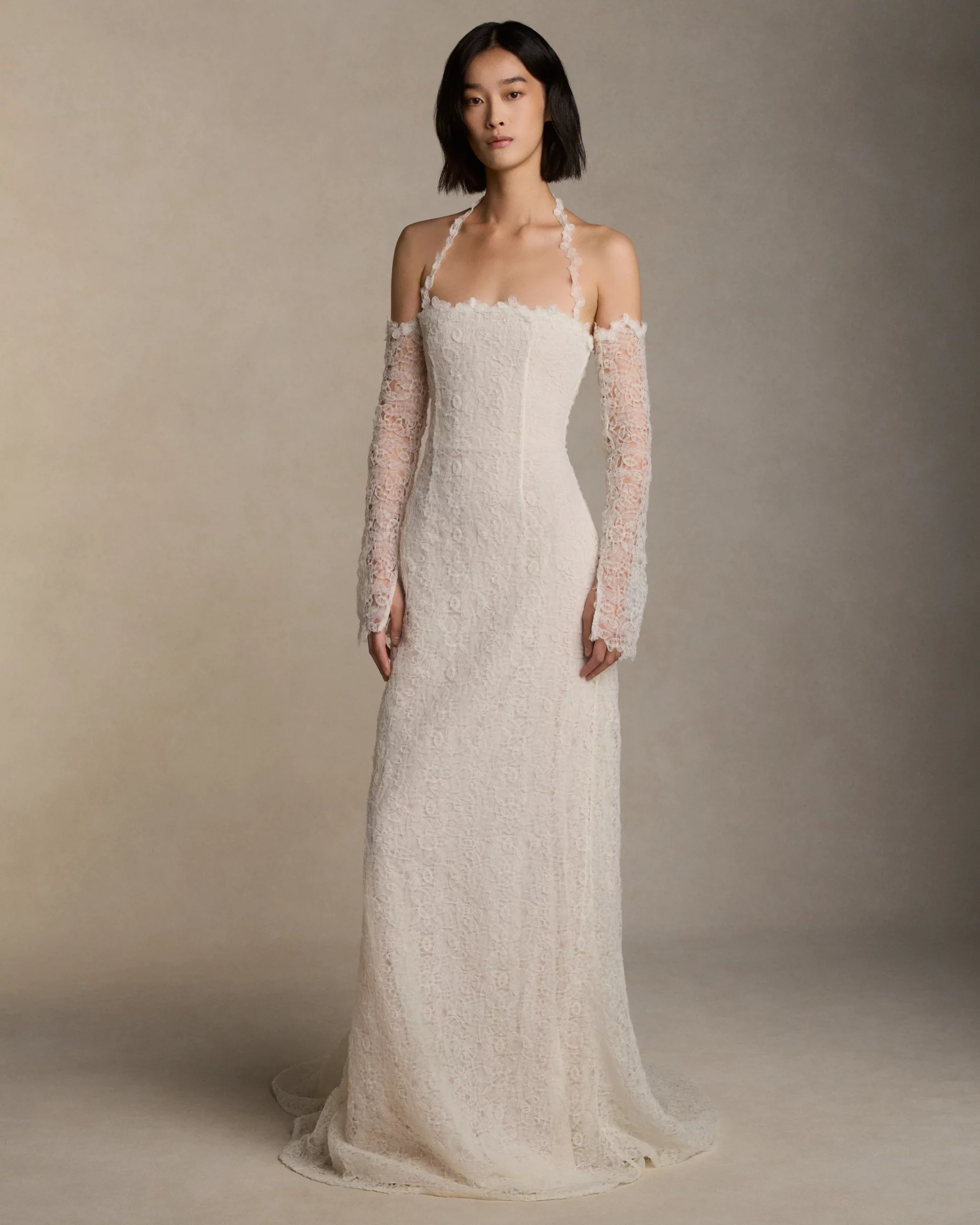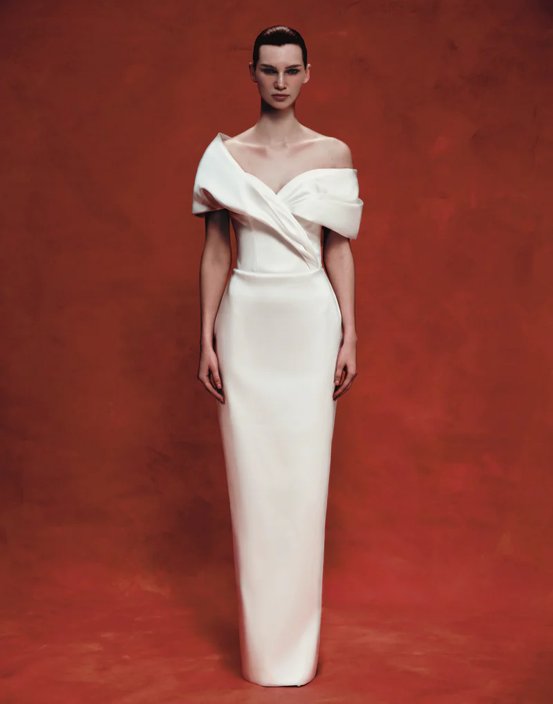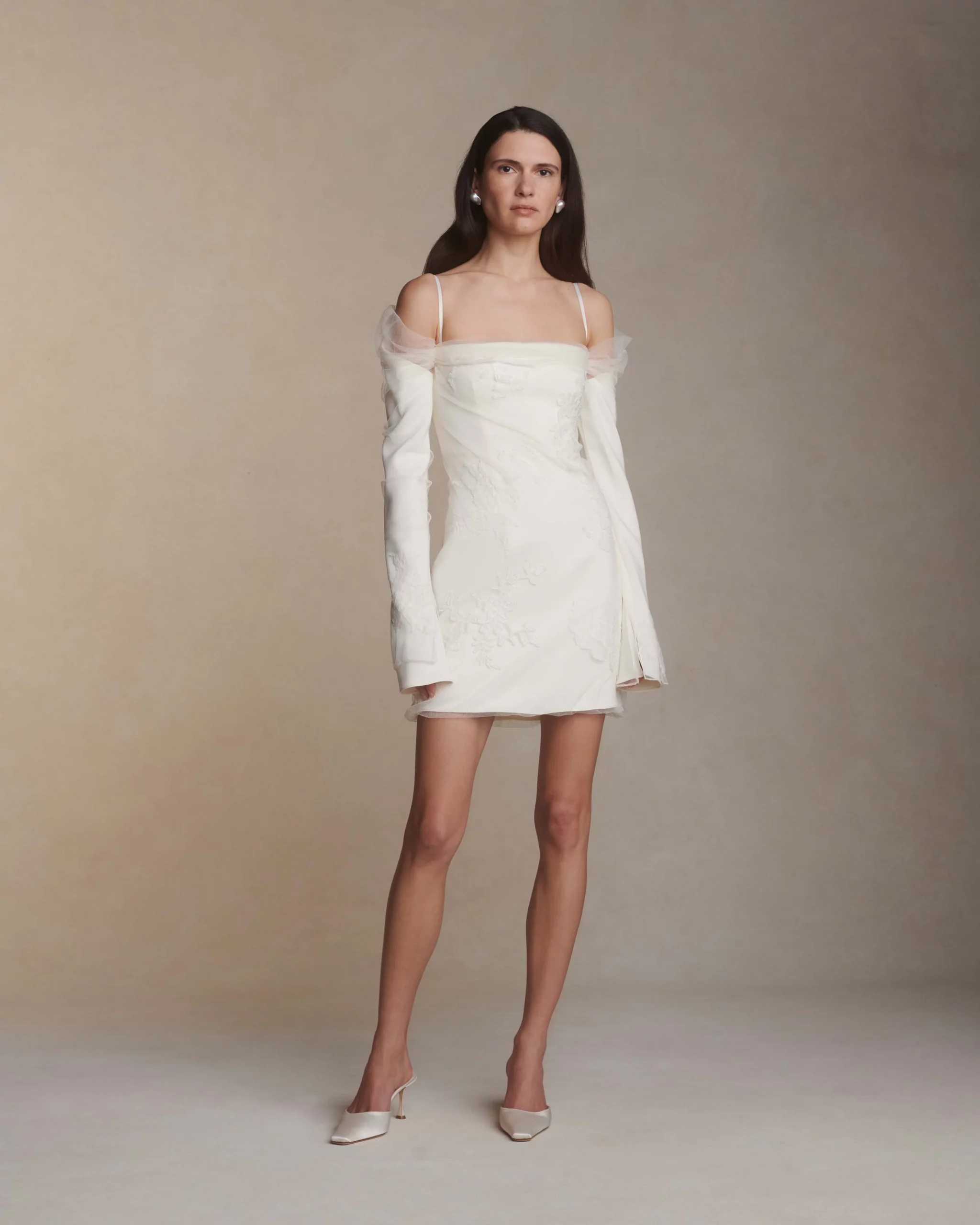 В случае с миниатюрной невестой каждый сантиметр работает на образ. Вместо объемной фаты выберите короткую вуаль-паутинку или минималистичную однослойную длинную фату — она струится вертикально, не создавая лишнего объема у плеч.