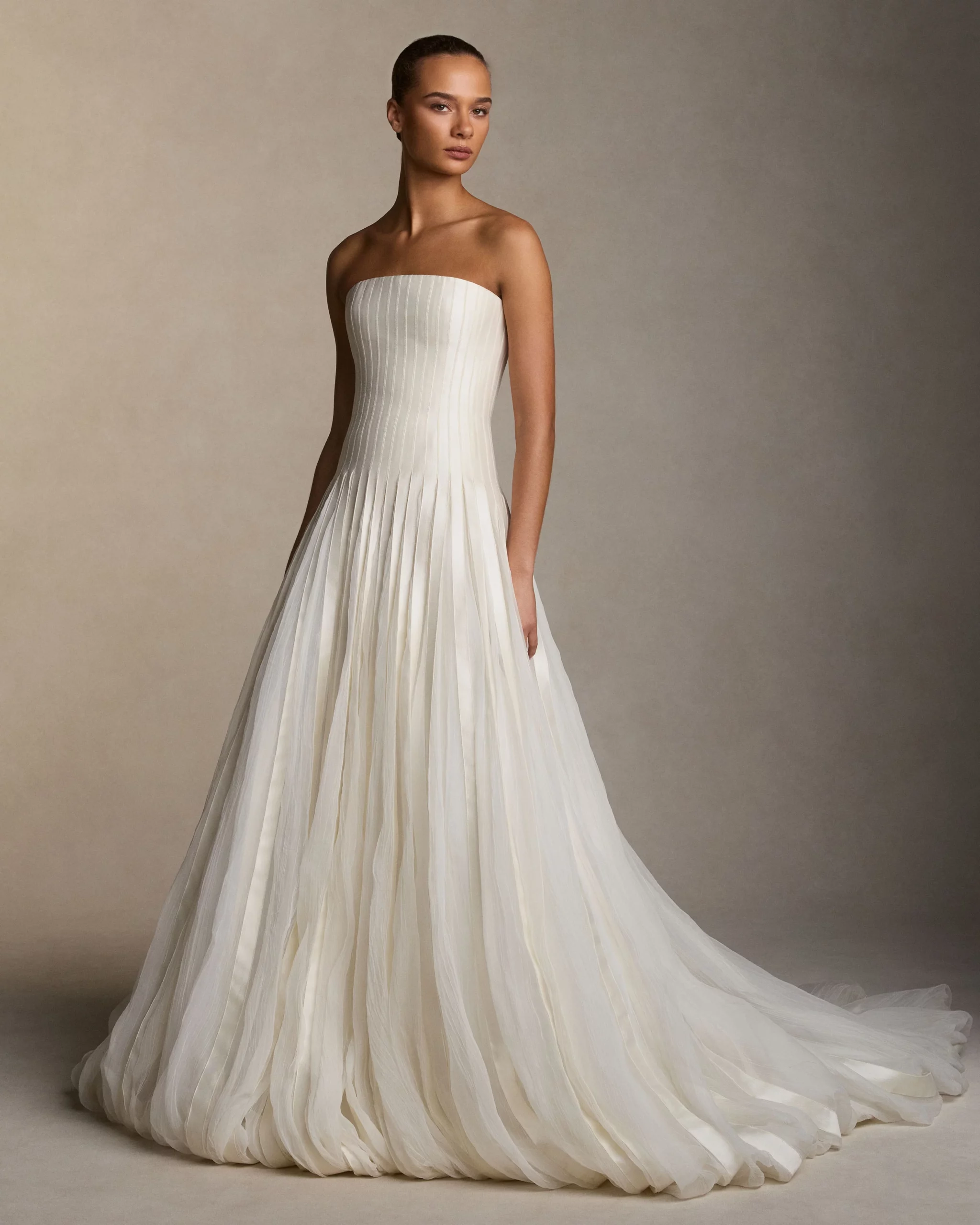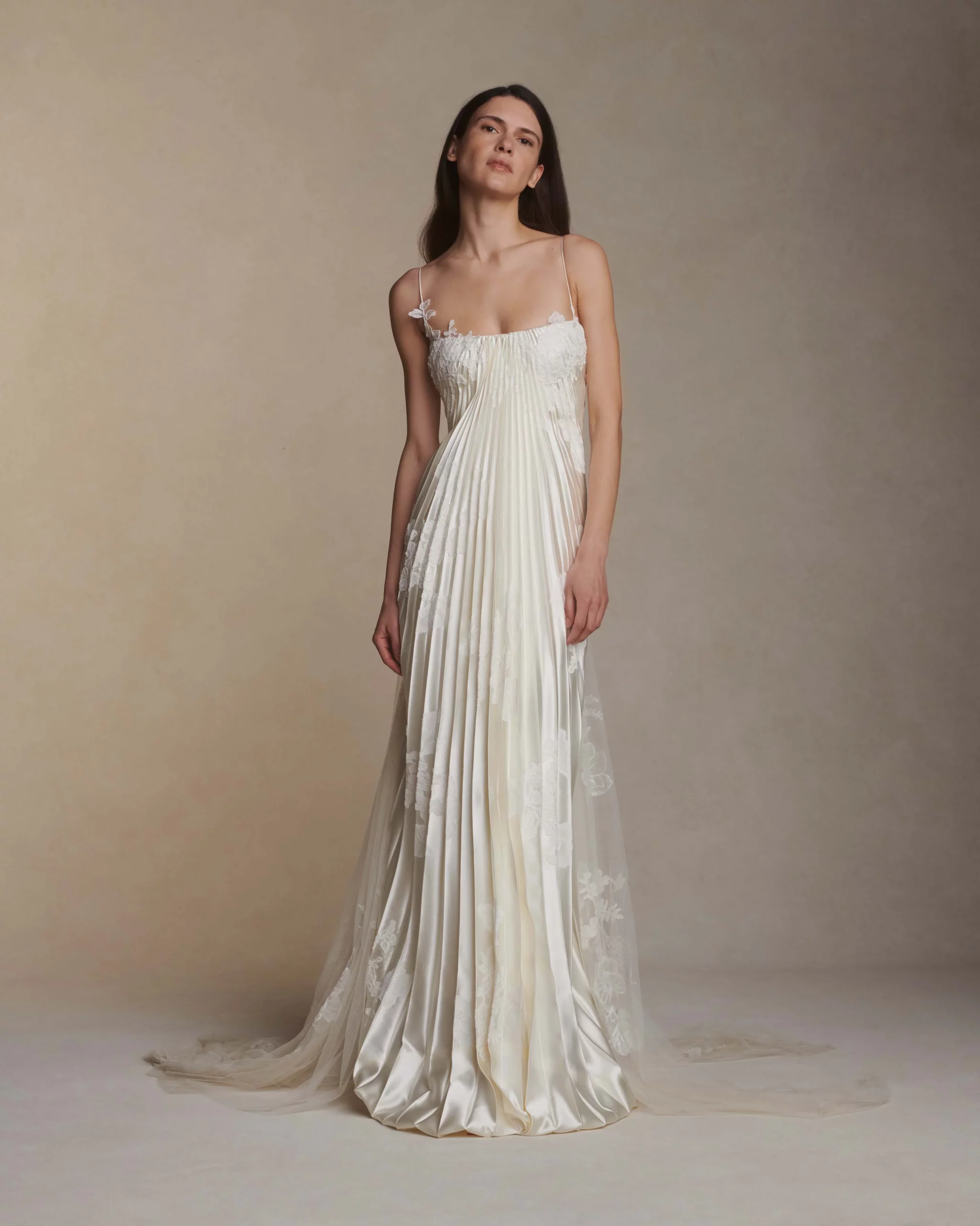 Главная цель невесты невысокого роста — казаться выше и стройнее. Эту иллюзию создает завышенная талия. Забудьте о низкой посадке или поясе на бедрах. Корсет, переходящий в А-силуэт, или струящийся «ампир» (линия сразу под грудью) творит чудеса. Ноги визуально становятся длиннее.
