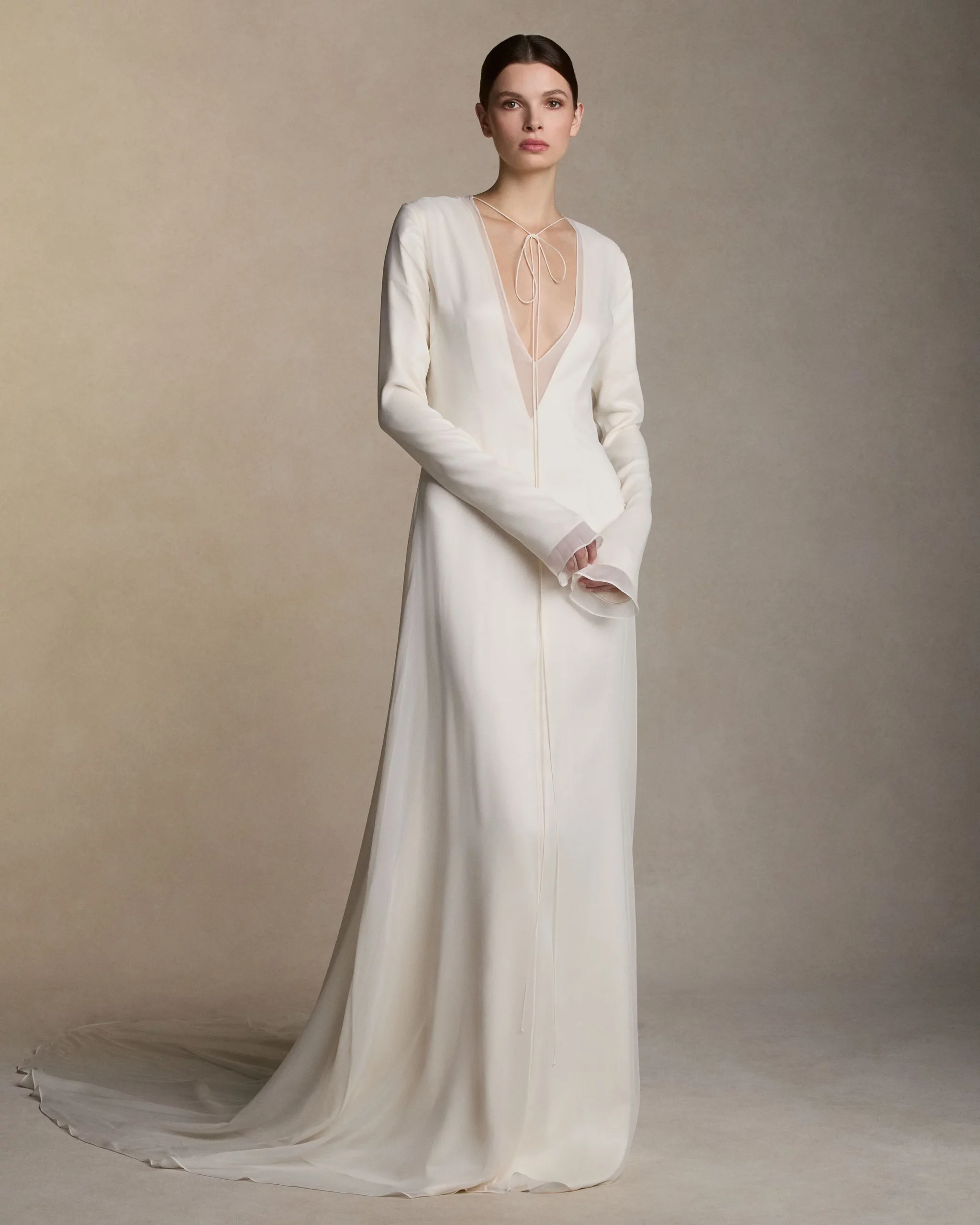 Для роста до 165 см идеальна длина «в пол» и высокий каблук. Подол должен быть четко до пола или на 1 см выше. Никаких шлейфов длиннее метра (максимум — отстегивающийся шлейф на церемонию). Платье-макси в сочетании с туфлями на каблуке прибавит вам 10−15 см роста.