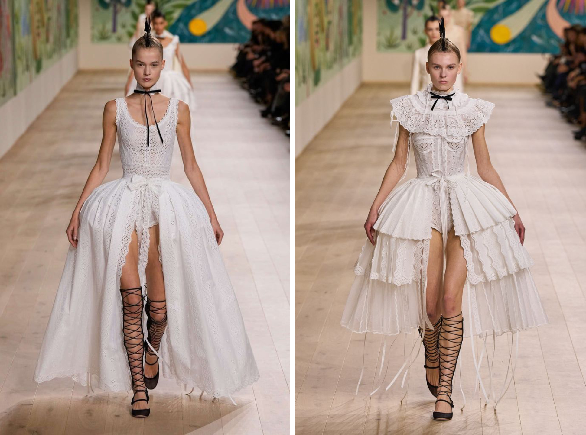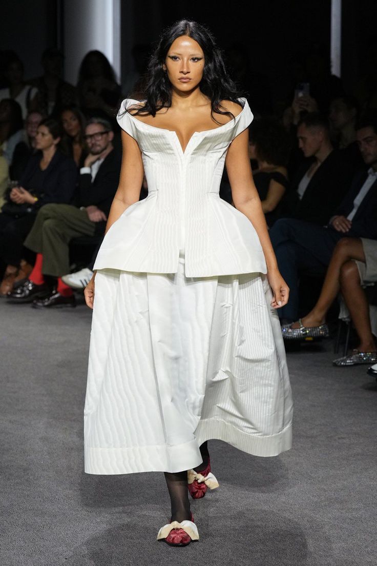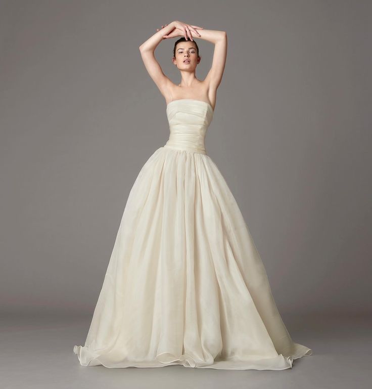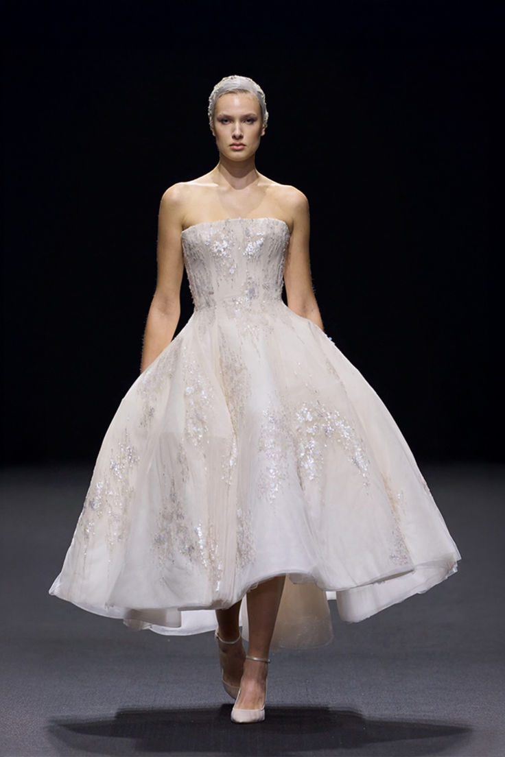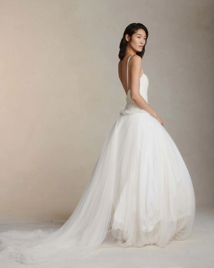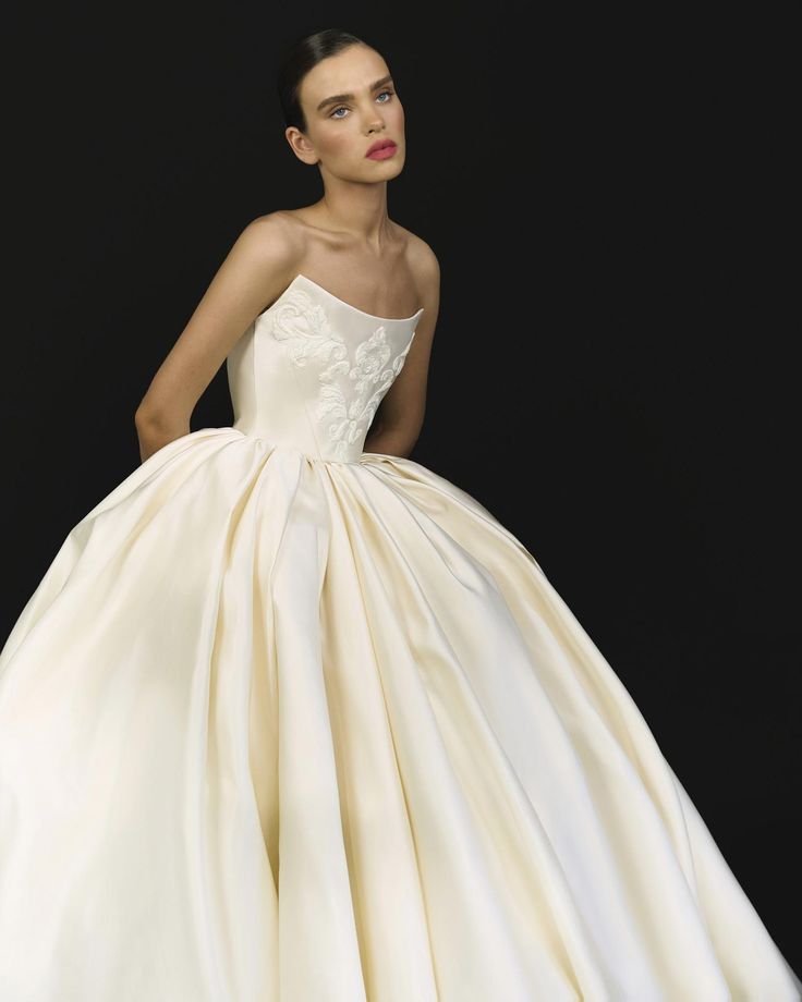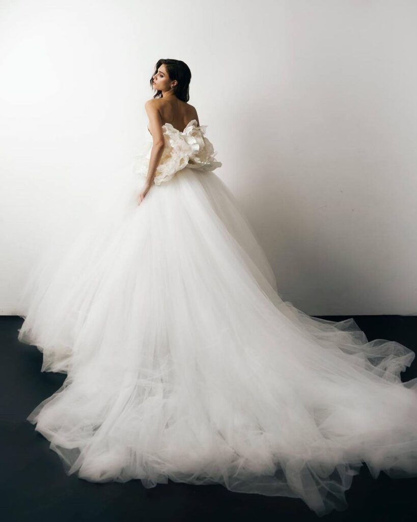 На кутюрных показах сезона весна-лето 2026 и на Неделе свадебной моды в Нью-Йорке все чаще мелькали силуэты с кринолином. Кринолин — это умный каркас, который создает объемную юбку-колокол. Такой силуэт расширяется от талии, создавая выразительный контраст с узким лифом, что зрительно делает талию еще тоньше.