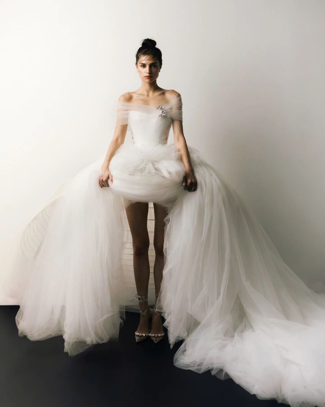 Образ получается одновременно величественным и легким: юбка держит идеальную форму на протяжении всего дня свадьбы. Это гарантия безупречной линии на каждой фотографии. Силуэты с кринолином были замечены на последнем кутюрном шоу Dior, в свадебной коллекции Danielle Frankel, на показе Vivienne Westwood.