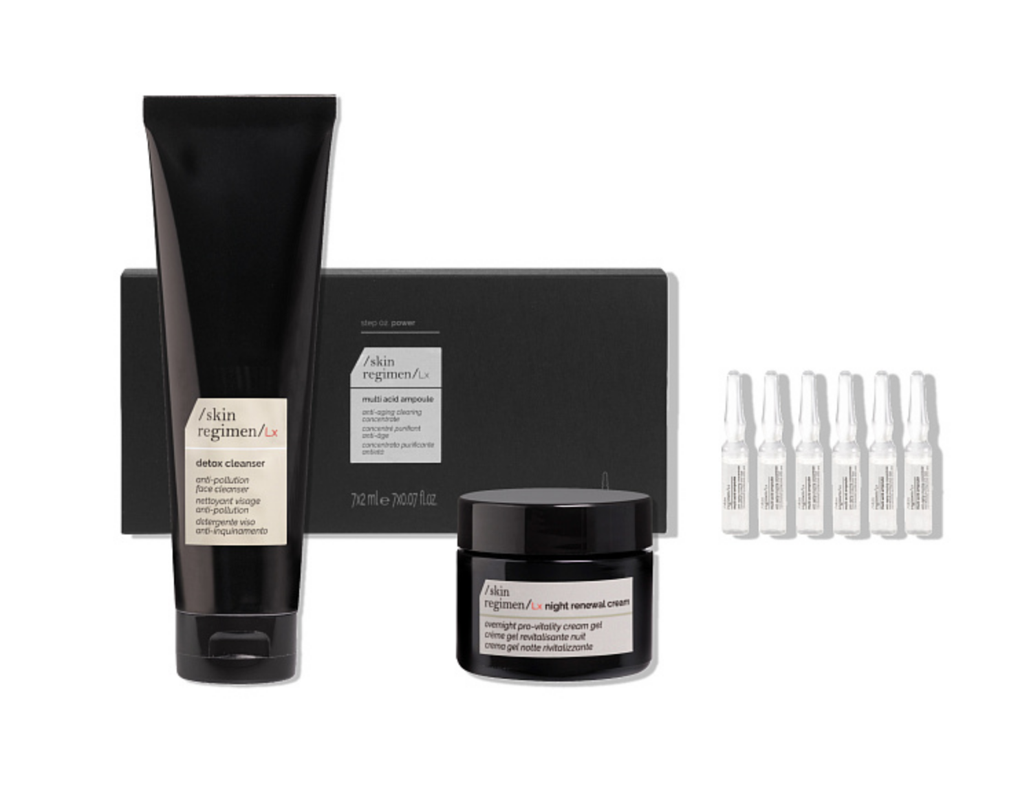 В наборе — все для видимого преображения и омоложения — очищающий крем-гель, ампулы с кислотами и ночной крем для лица. Интенсивный комплекс Skin Regimen Lx, входящий в состав средств, борется с главными врагами городской кожи: загрязнениями, обезвоживанием и последствиями стресса.