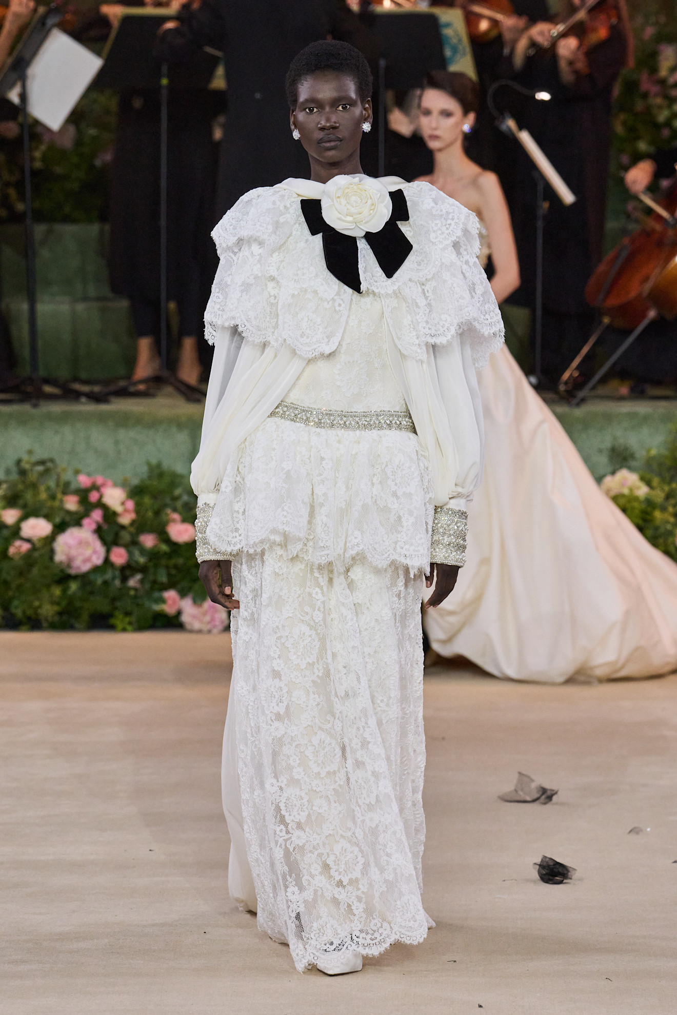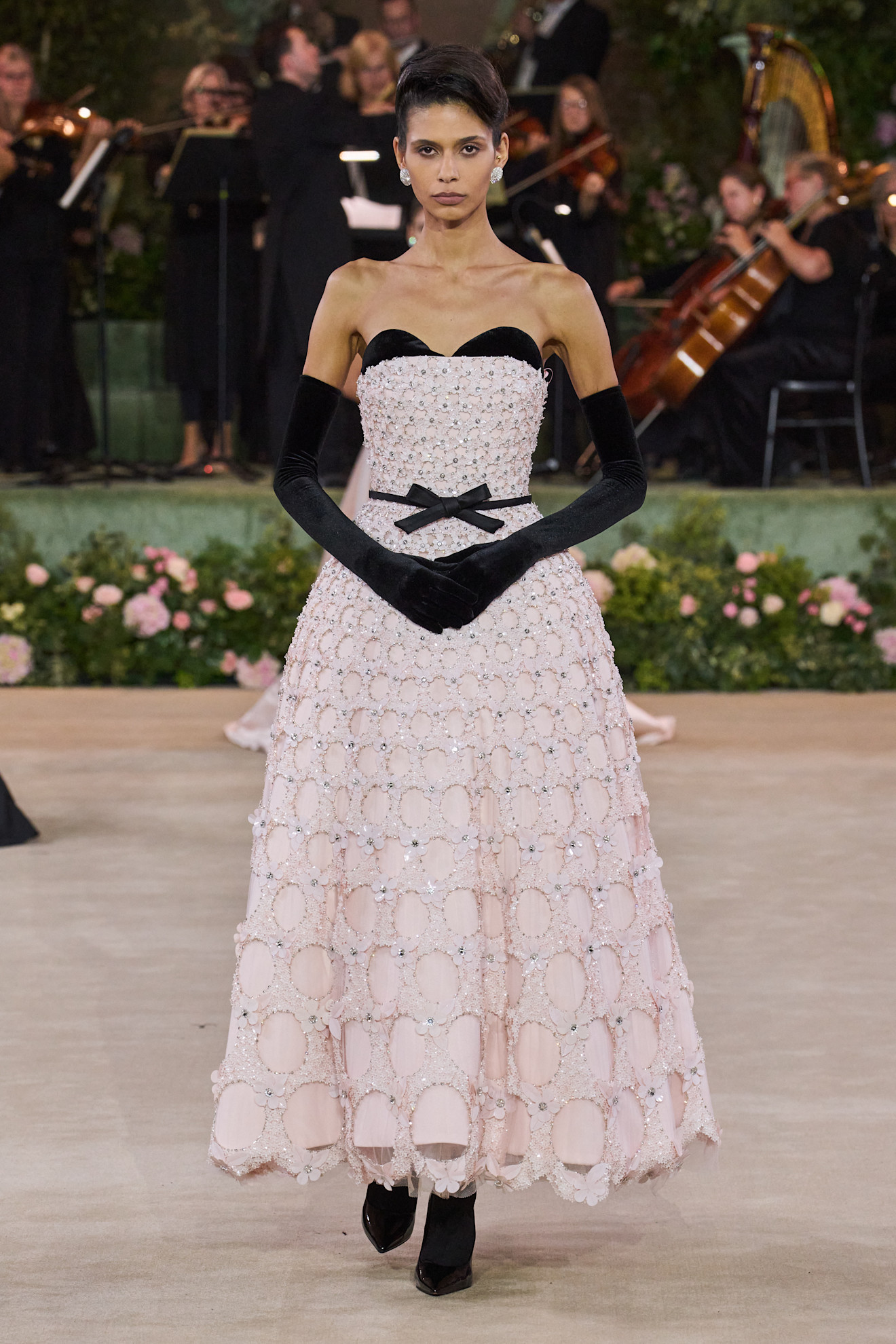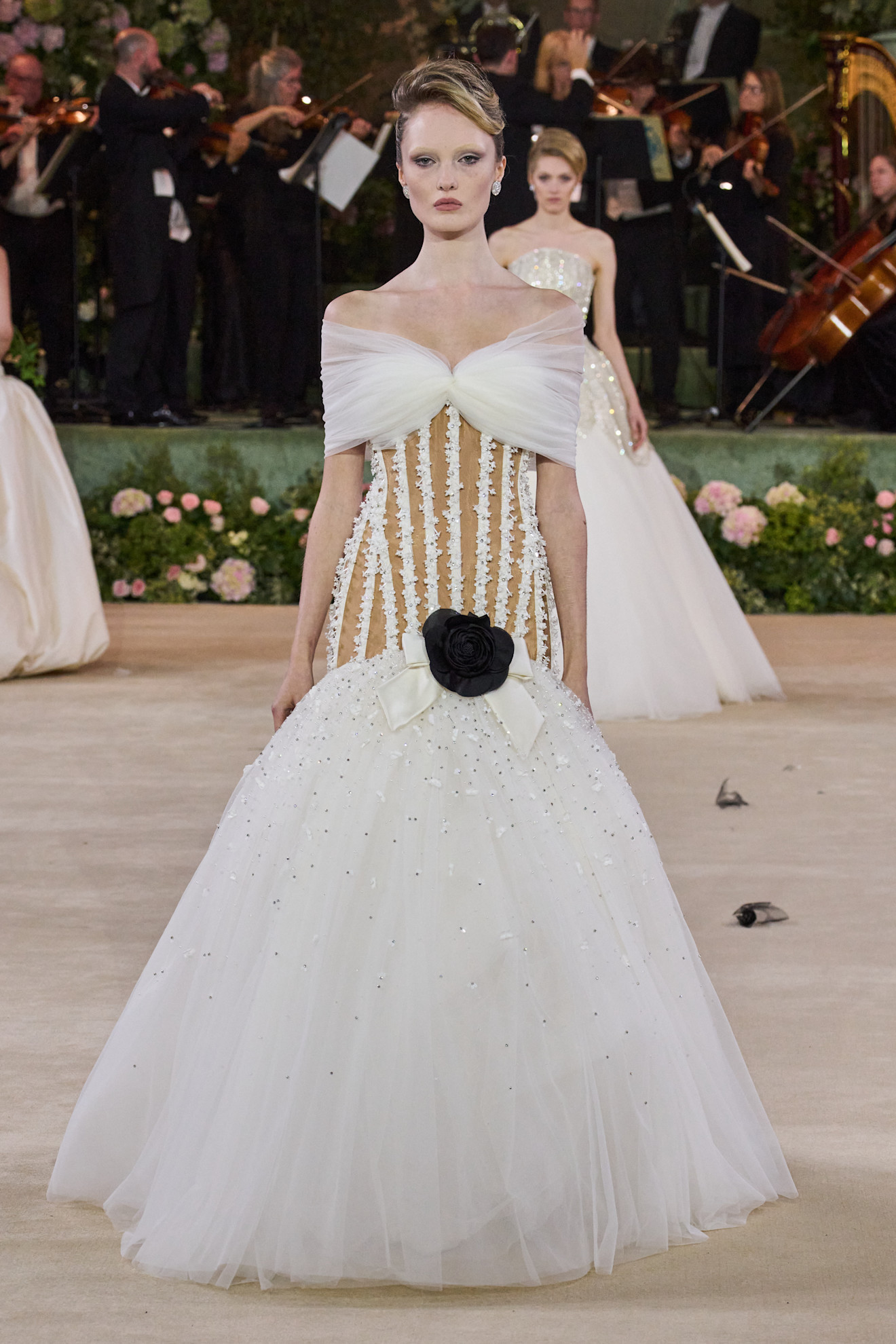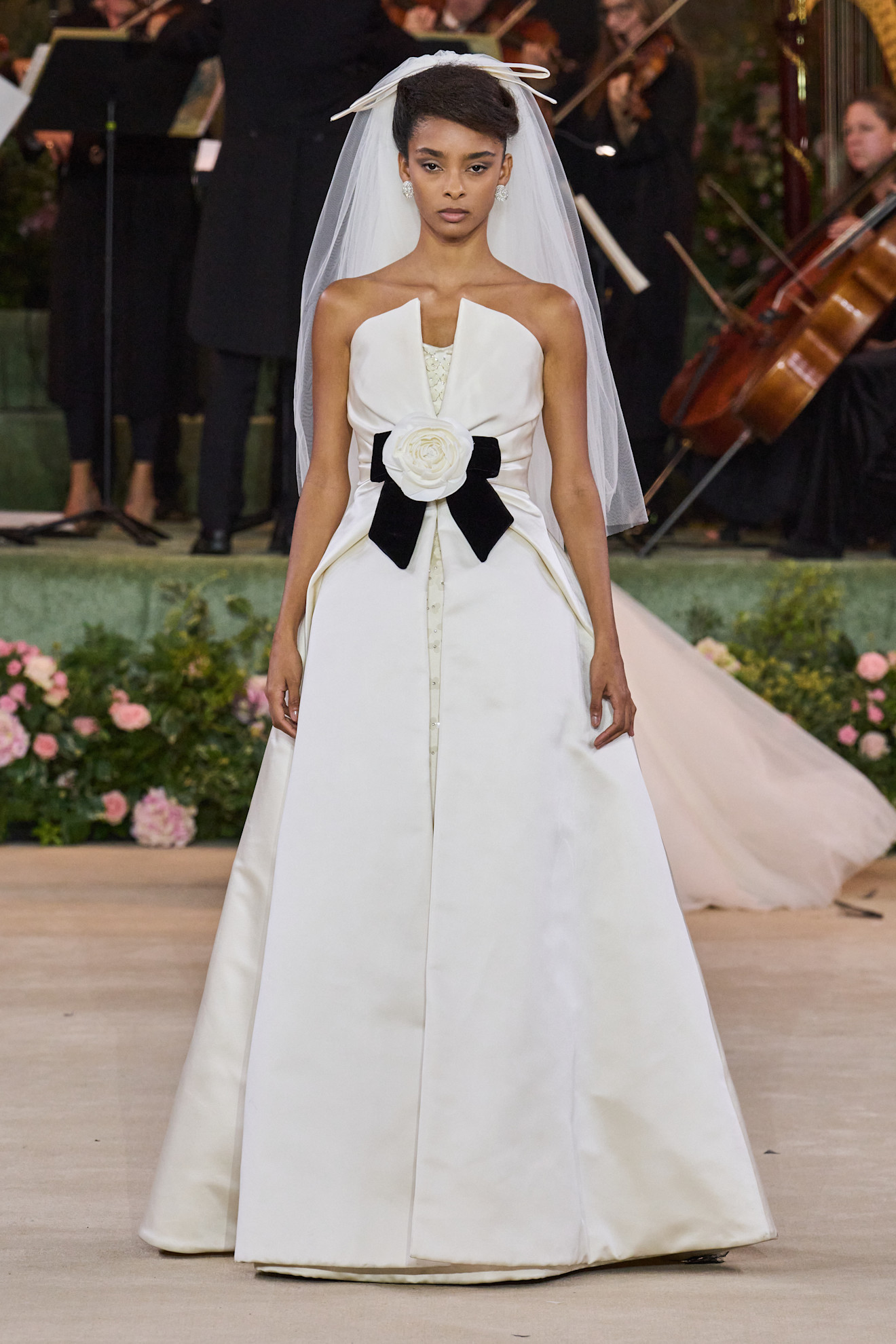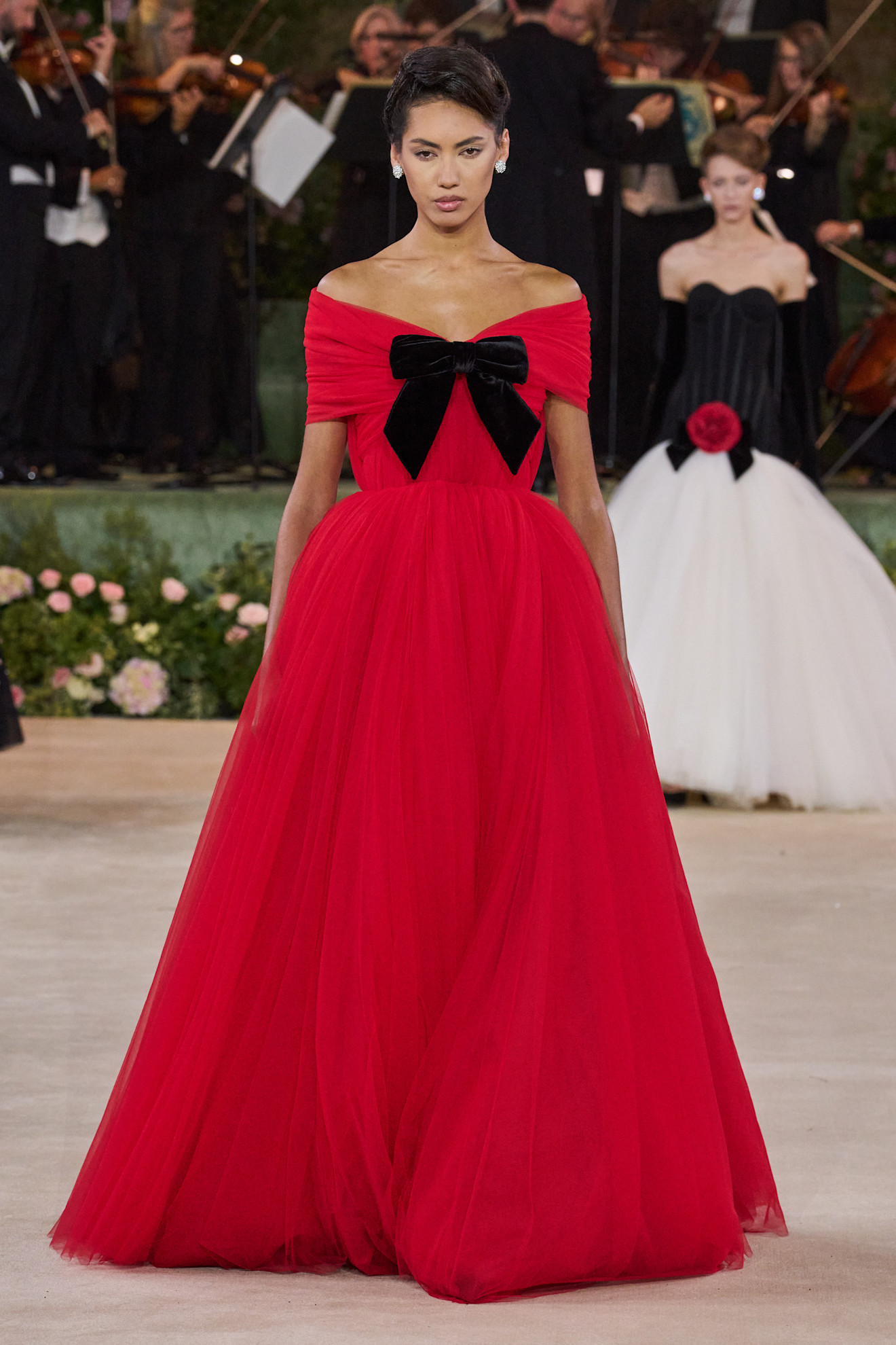 Шоу открыла легендарная Наоми Кэмпбелл в длинном черном платье с открытыми плечами, украшенном изящным бутоном розы на груди. Этот цветок стал ключевым мотивом всей коллекции, появляясь в самых разных образах — от элегантного платья-футляра до костюмов с расклешенными юбками и роскошных свадебных нарядов. Еще одним связующим элементом линейки, наряду с розами, стал бант.