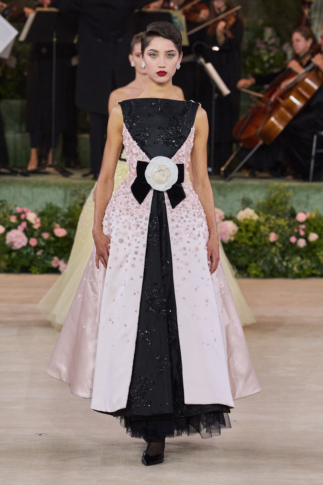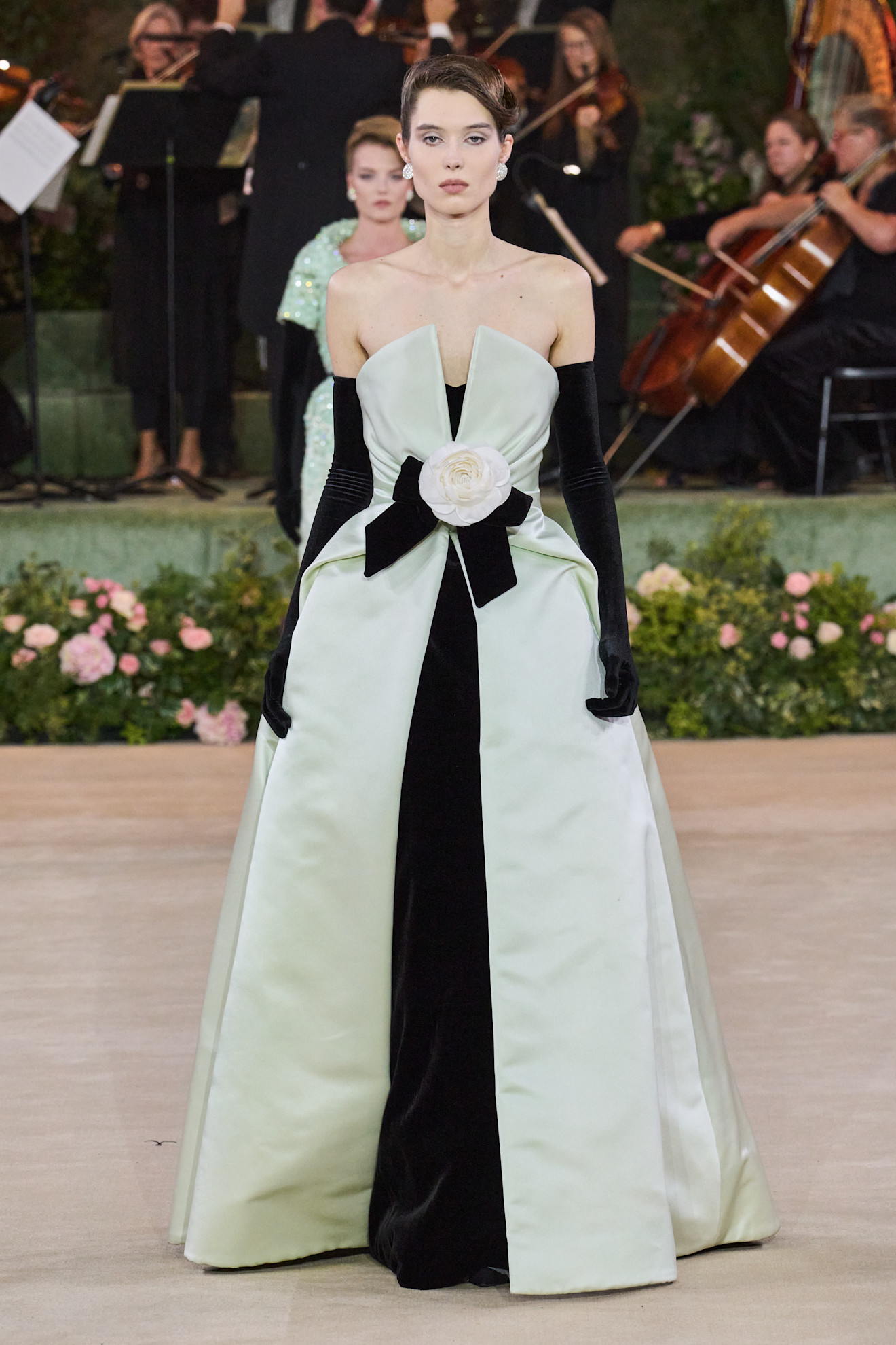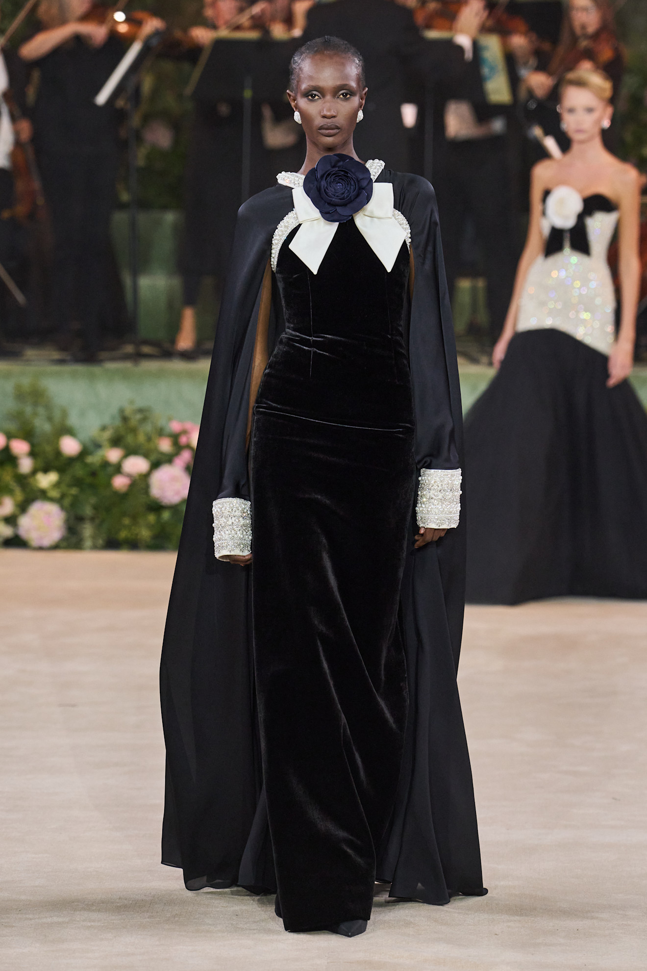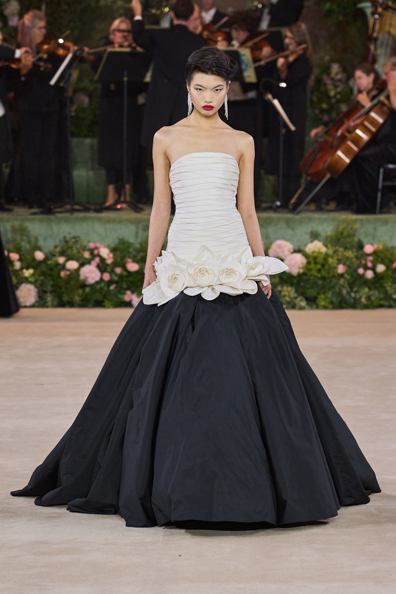 Шоу открыла легендарная Наоми Кэмпбелл в длинном черном платье с открытыми плечами, украшенном изящным бутоном розы на груди. Этот цветок стал ключевым мотивом всей коллекции, появляясь в самых разных образах — от элегантного платья-футляра до костюмов с расклешенными юбками и роскошных свадебных нарядов. Еще одним связующим элементом линейки, наряду с розами, стал бант.