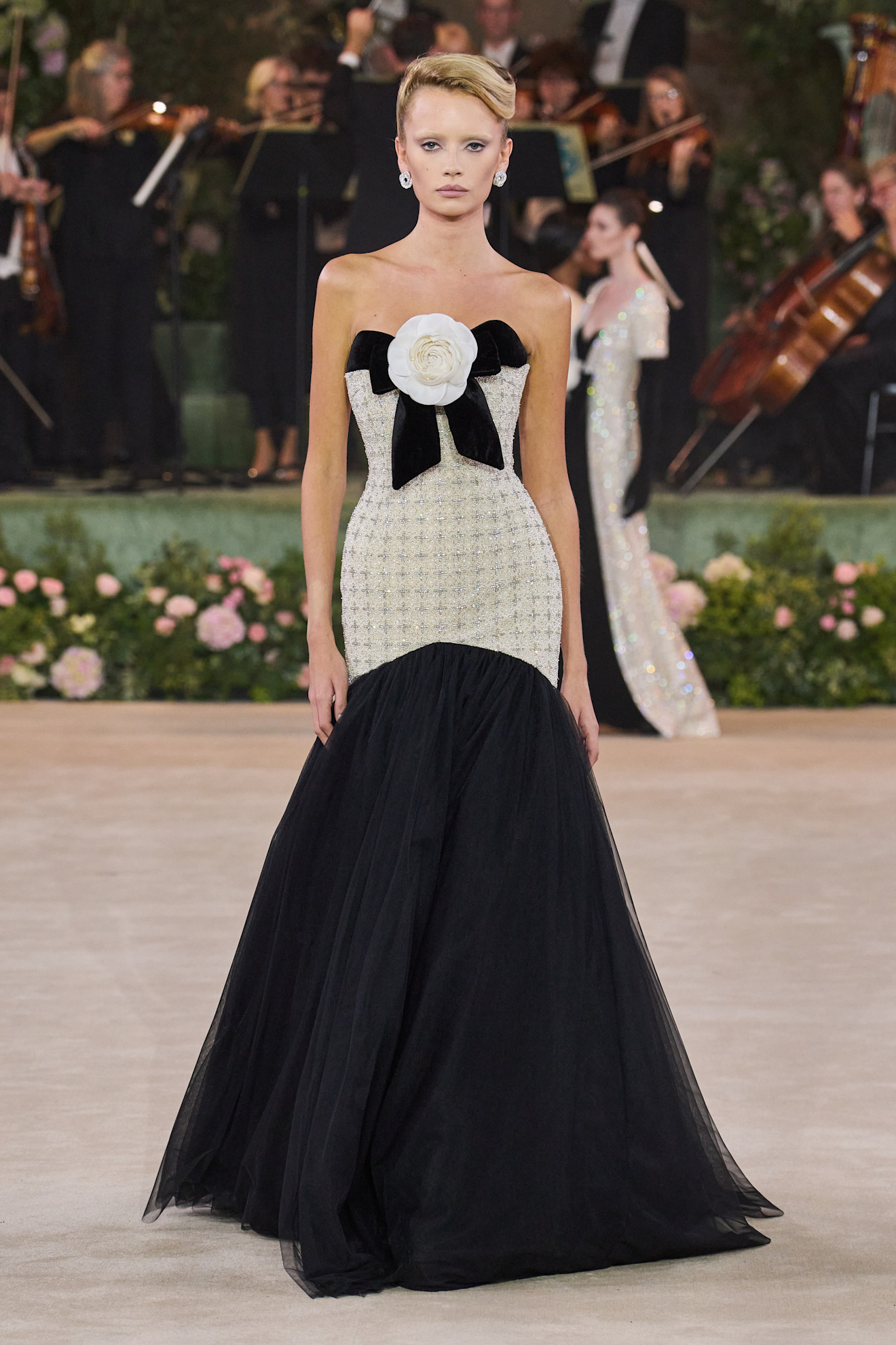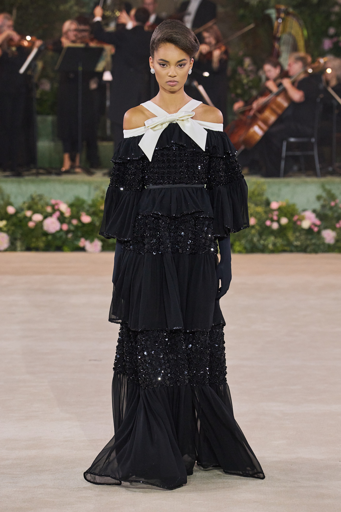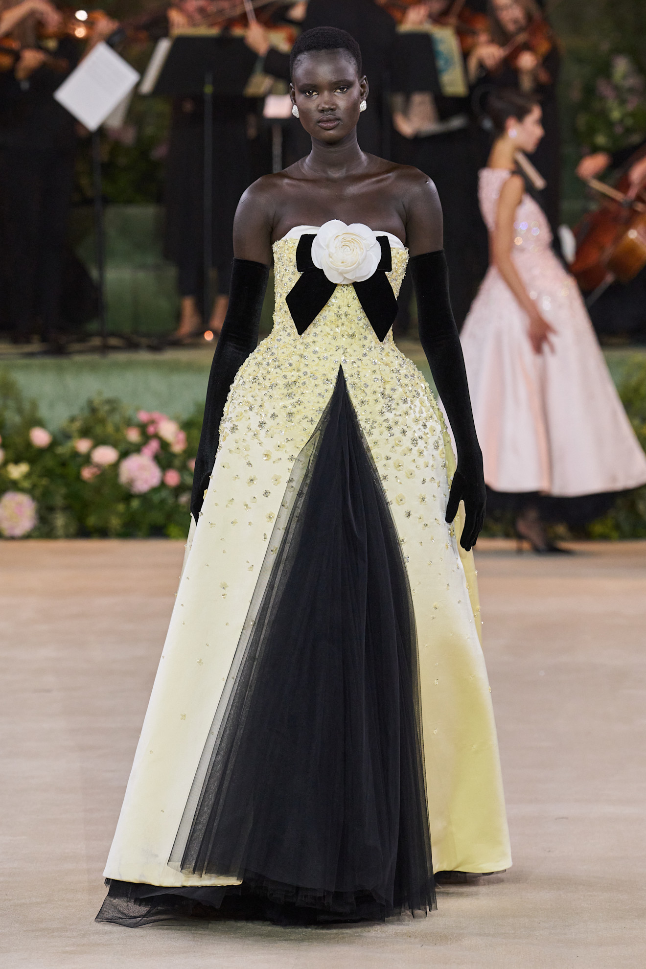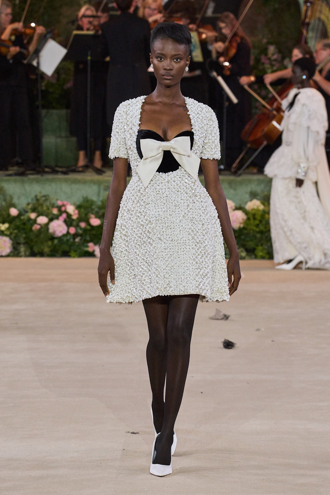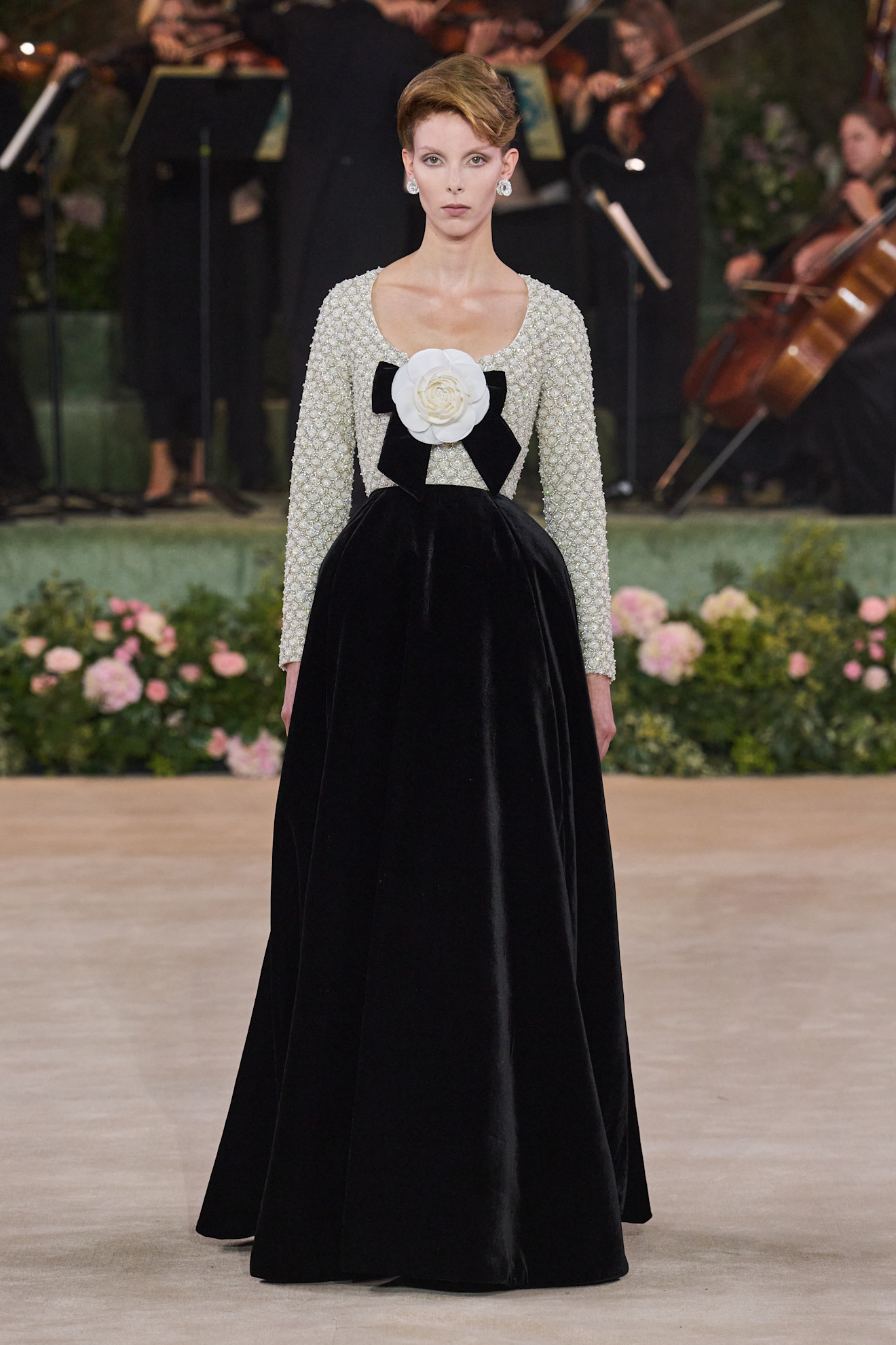 Шоу открыла легендарная Наоми Кэмпбелл в длинном черном платье с открытыми плечами, украшенном изящным бутоном розы на груди. Этот цветок стал ключевым мотивом всей коллекции, появляясь в самых разных образах — от элегантного платья-футляра до костюмов с расклешенными юбками и роскошных свадебных нарядов. Еще одним связующим элементом линейки, наряду с розами, стал бант.