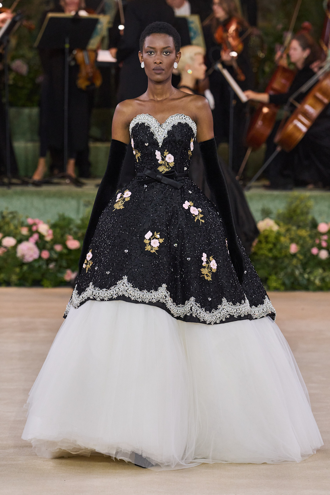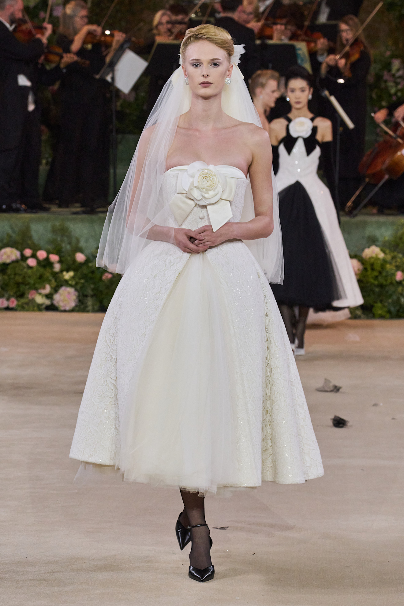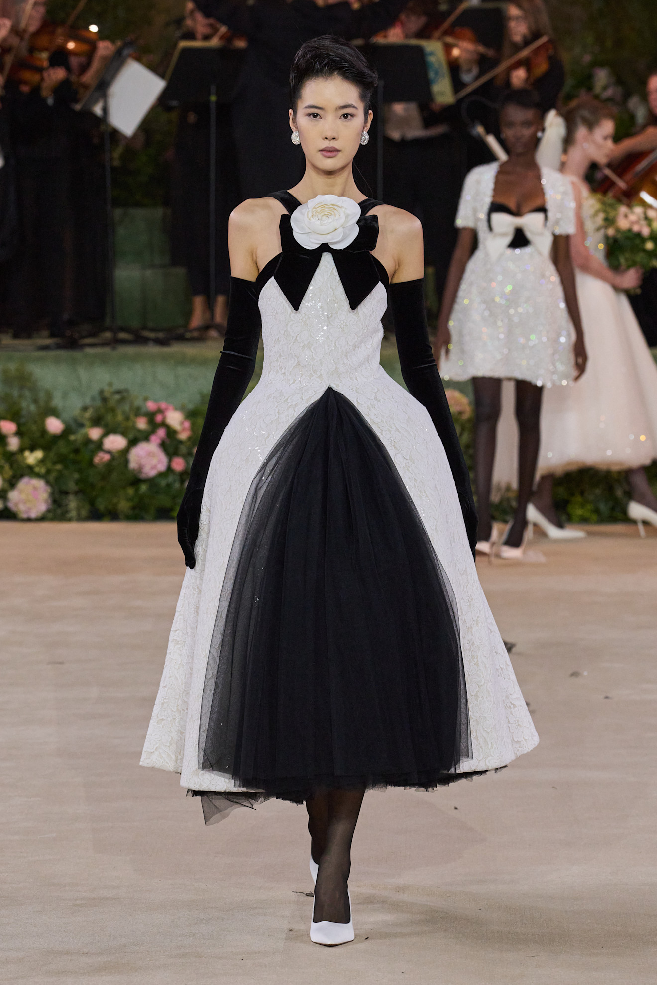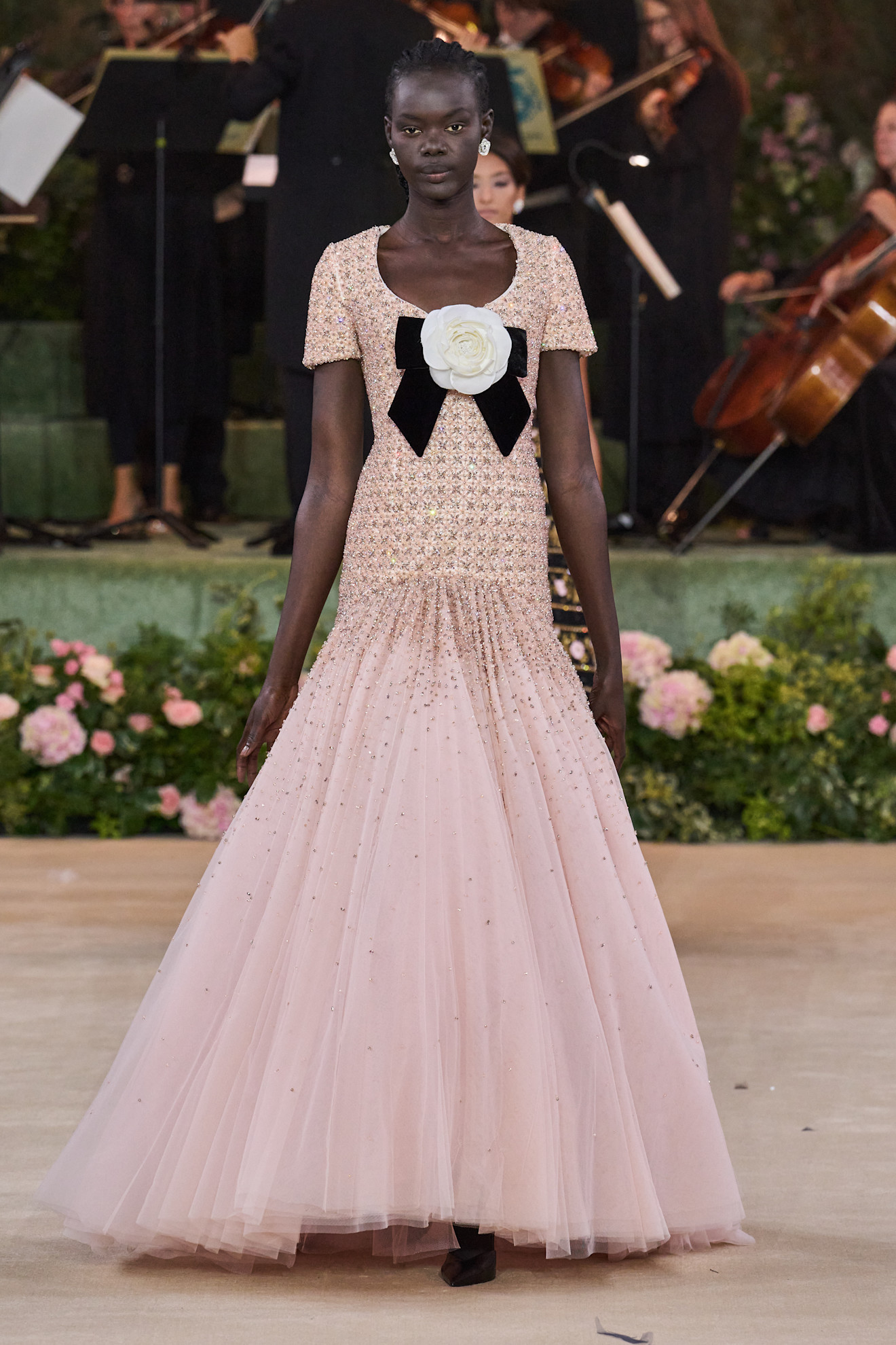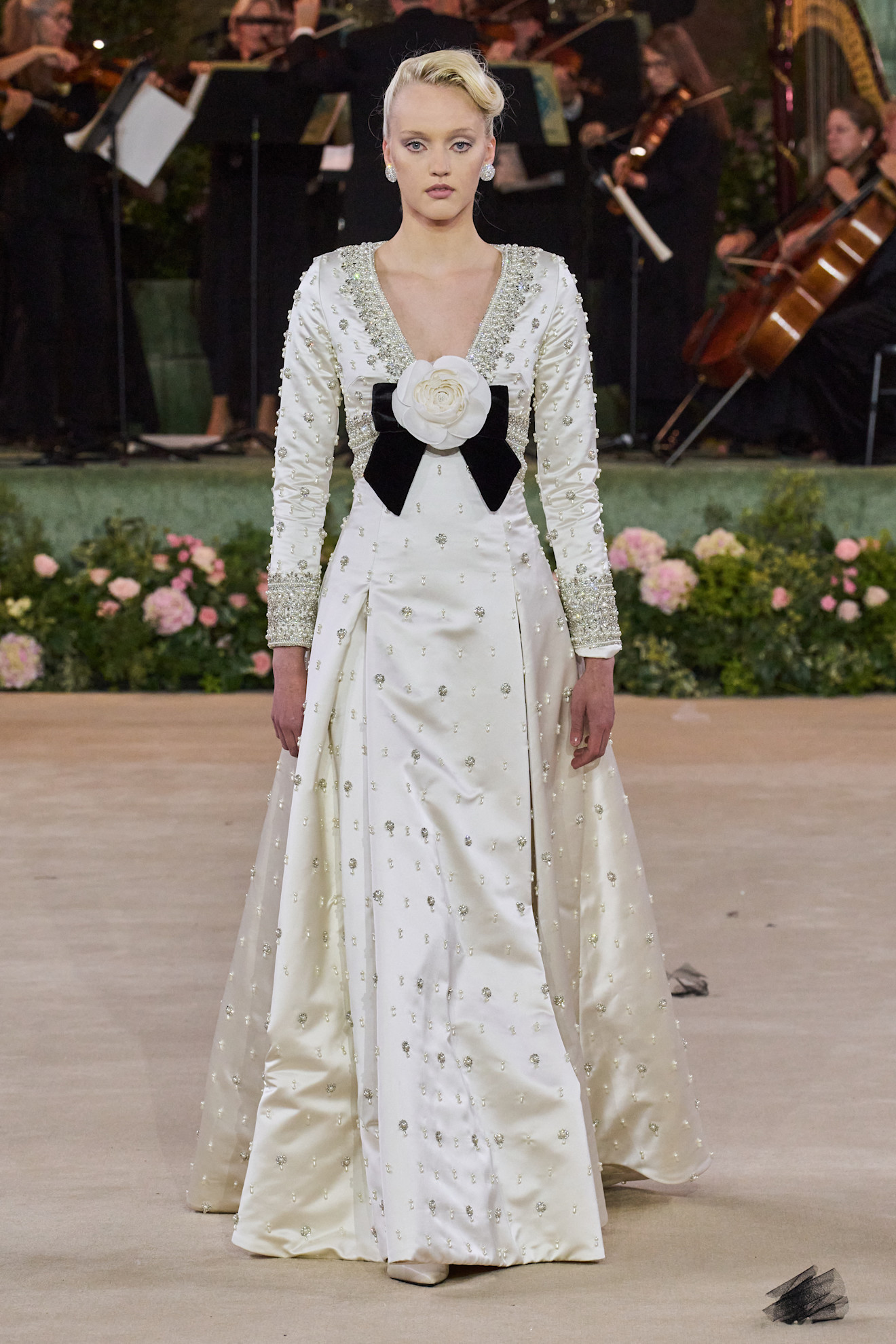Шоу открыла легендарная Наоми Кэмпбелл в длинном черном платье с открытыми плечами, украшенном изящным бутоном розы на груди. Этот цветок стал ключевым мотивом всей коллекции, появляясь в самых разных образах — от элегантного платья-футляра до костюмов с расклешенными юбками и роскошных свадебных нарядов. Еще одним связующим элементом линейки, наряду с розами, стал бант.