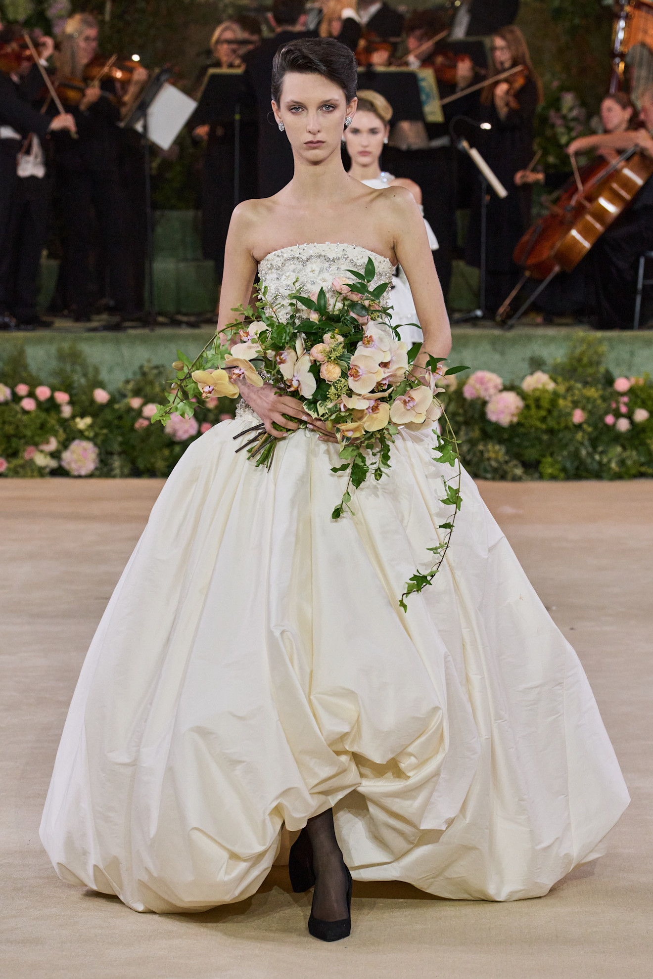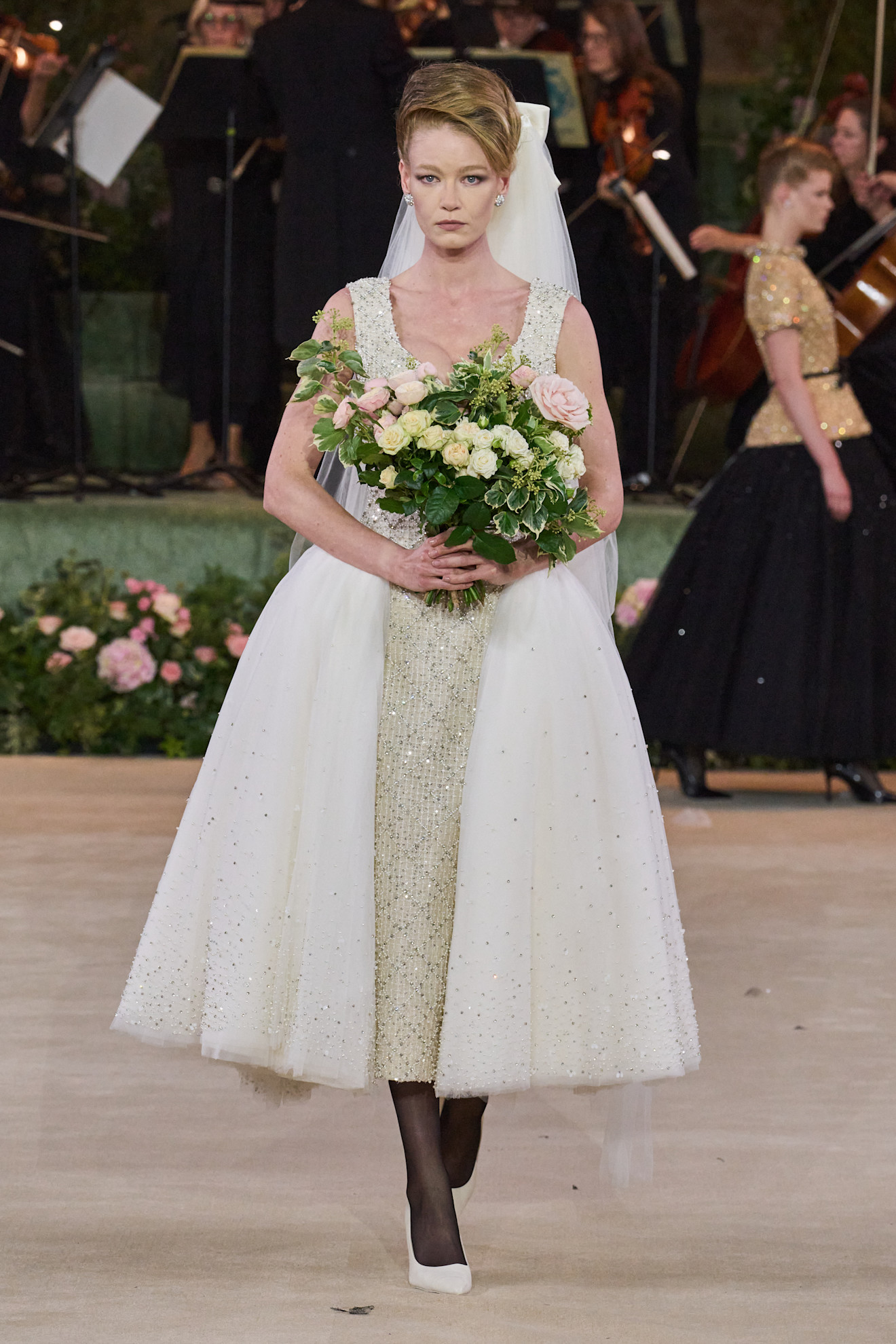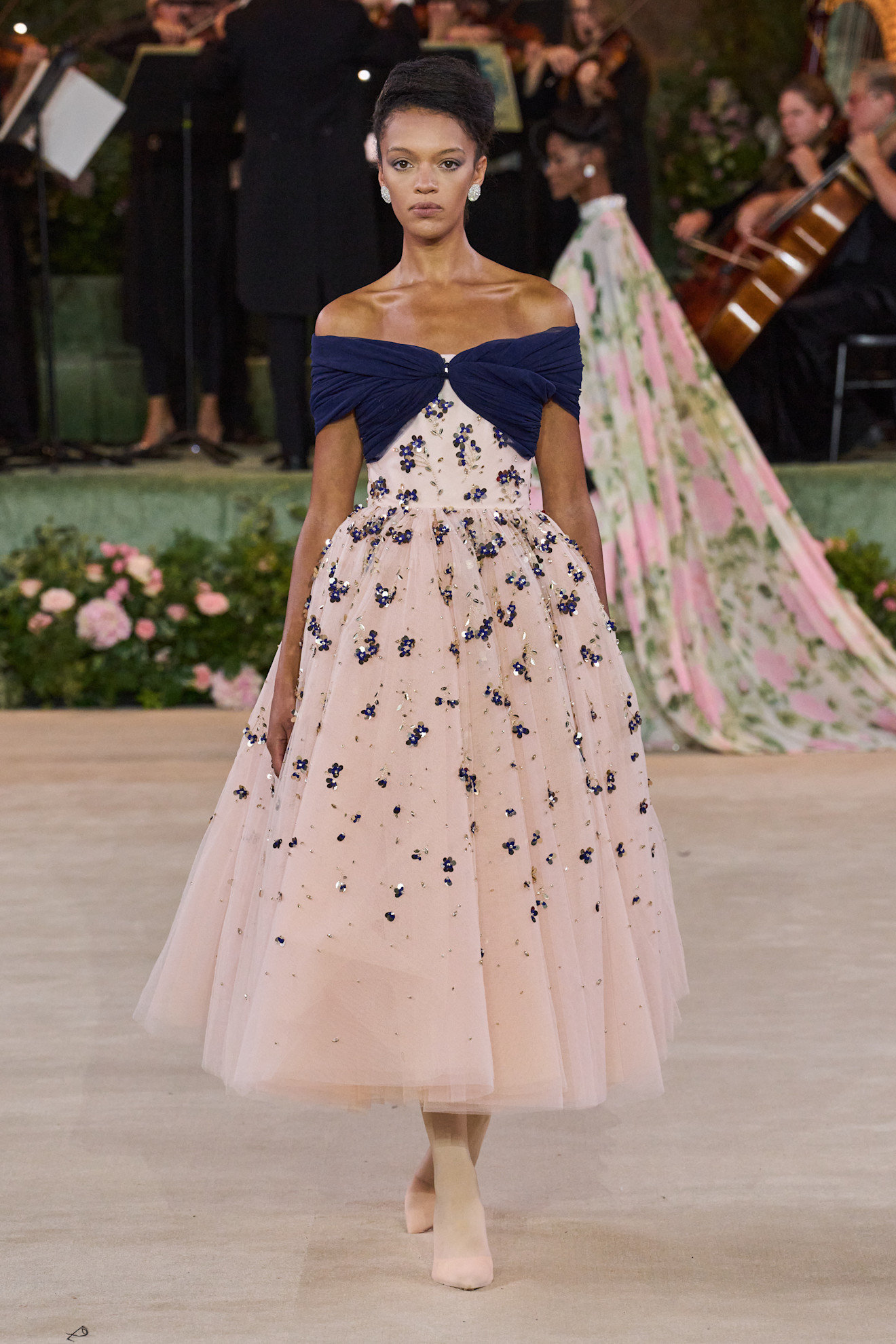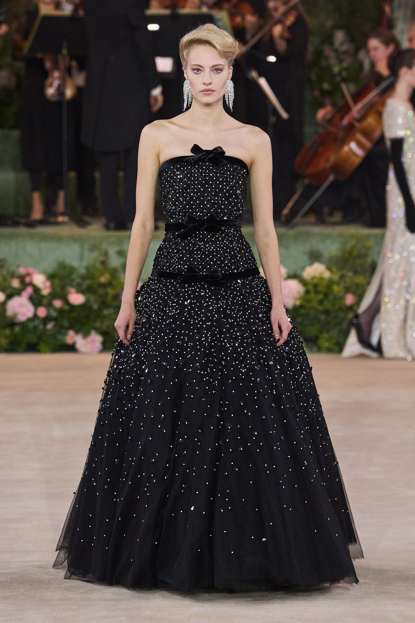 Шоу открыла легендарная Наоми Кэмпбелл в длинном черном платье с открытыми плечами, украшенном изящным бутоном розы на груди. Этот цветок стал ключевым мотивом всей коллекции, появляясь в самых разных образах — от элегантного платья-футляра до костюмов с расклешенными юбками и роскошных свадебных нарядов. Еще одним связующим элементом линейки, наряду с розами, стал бант.
