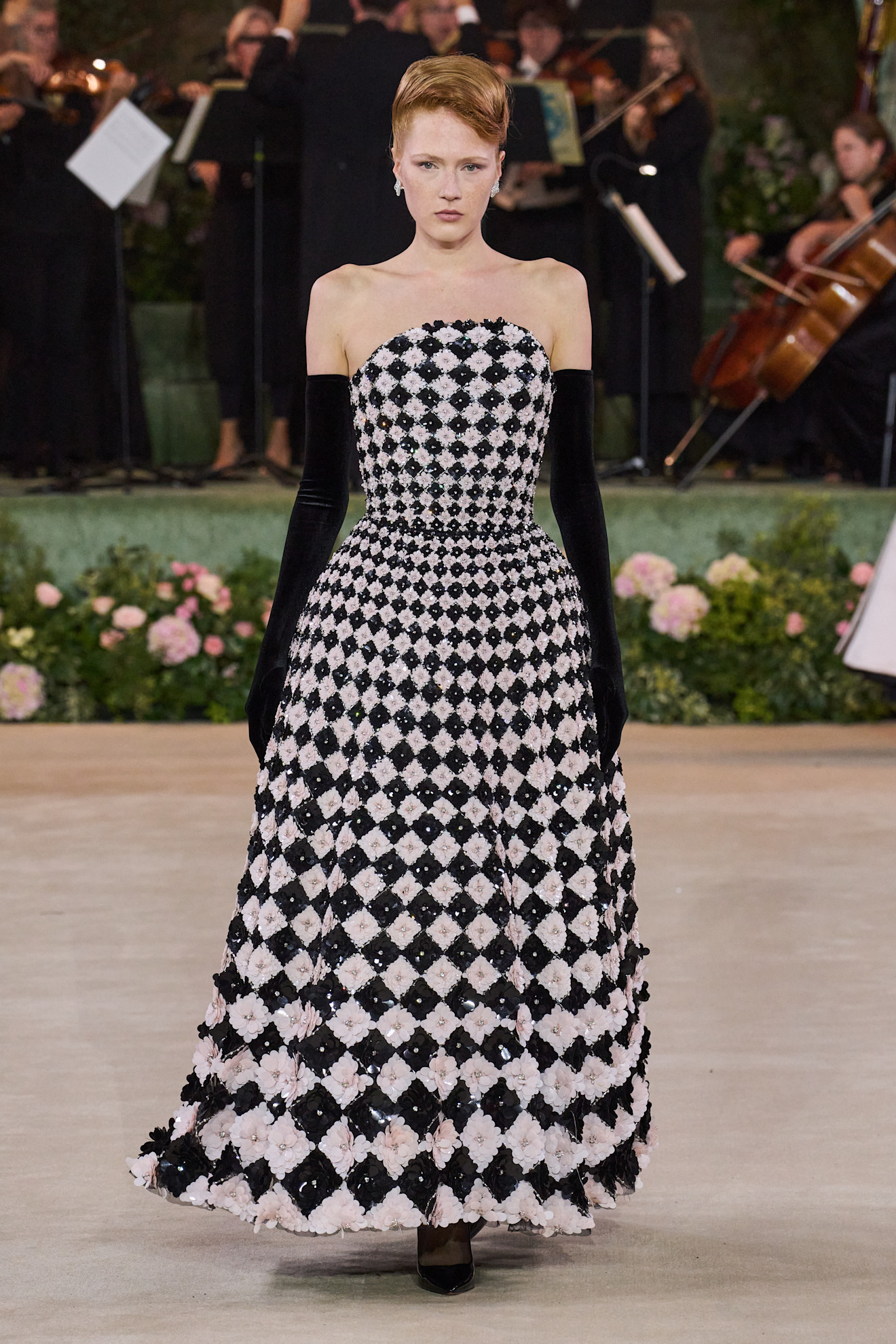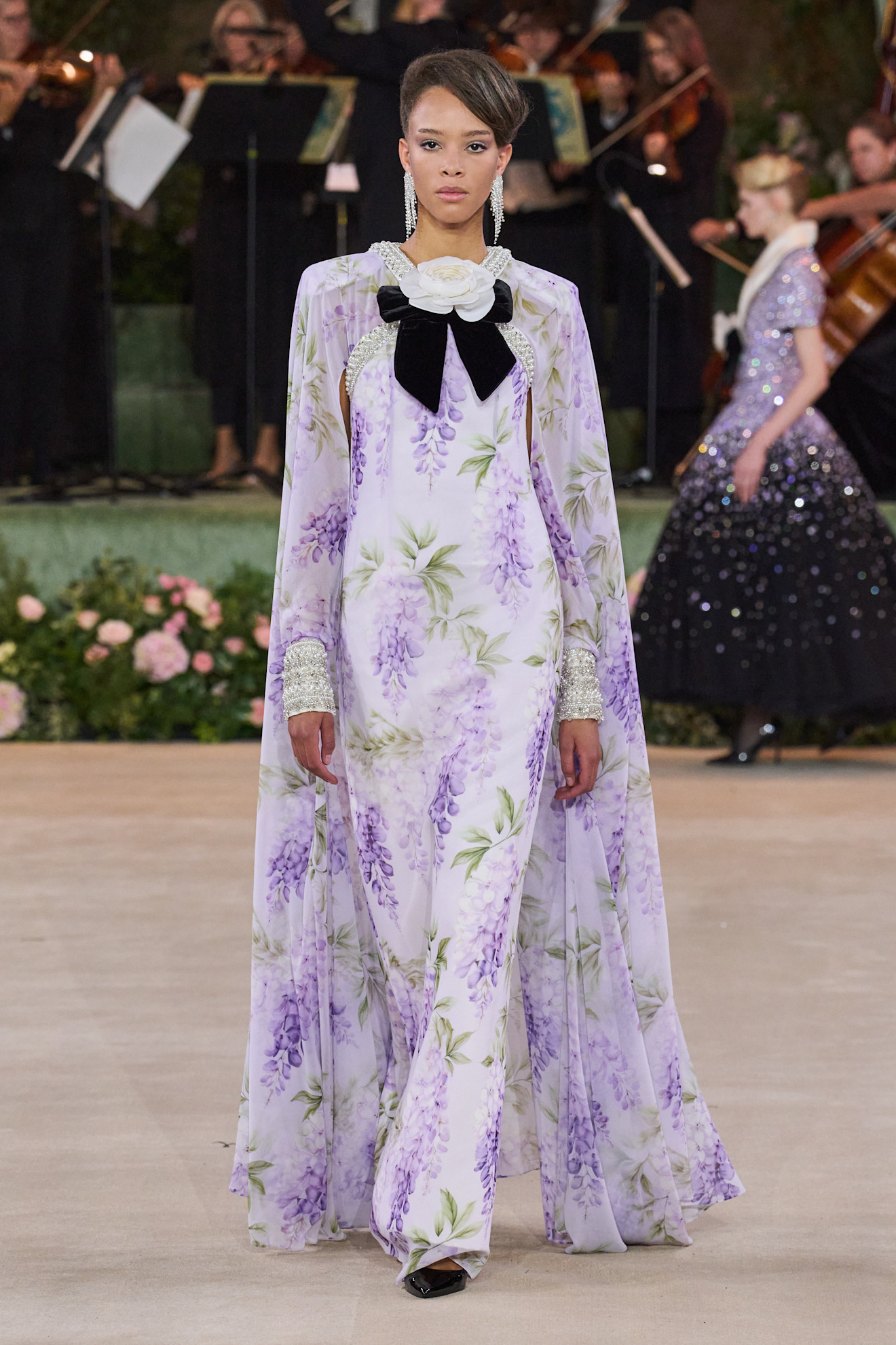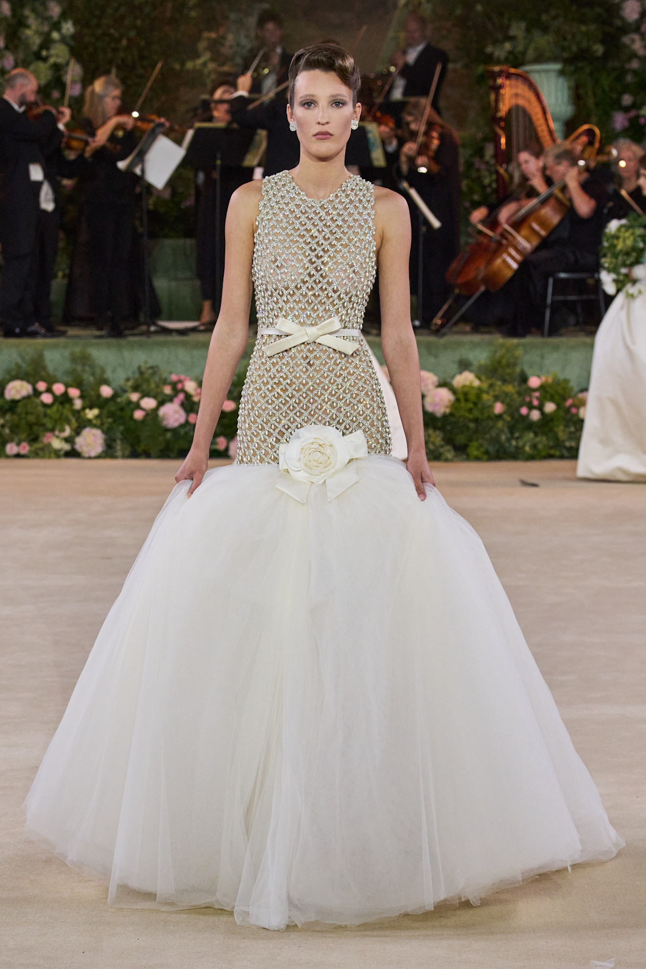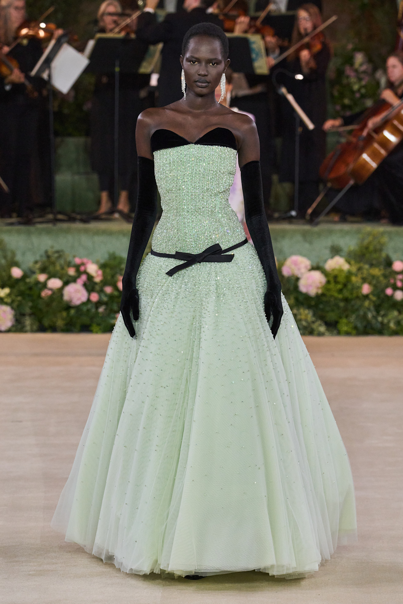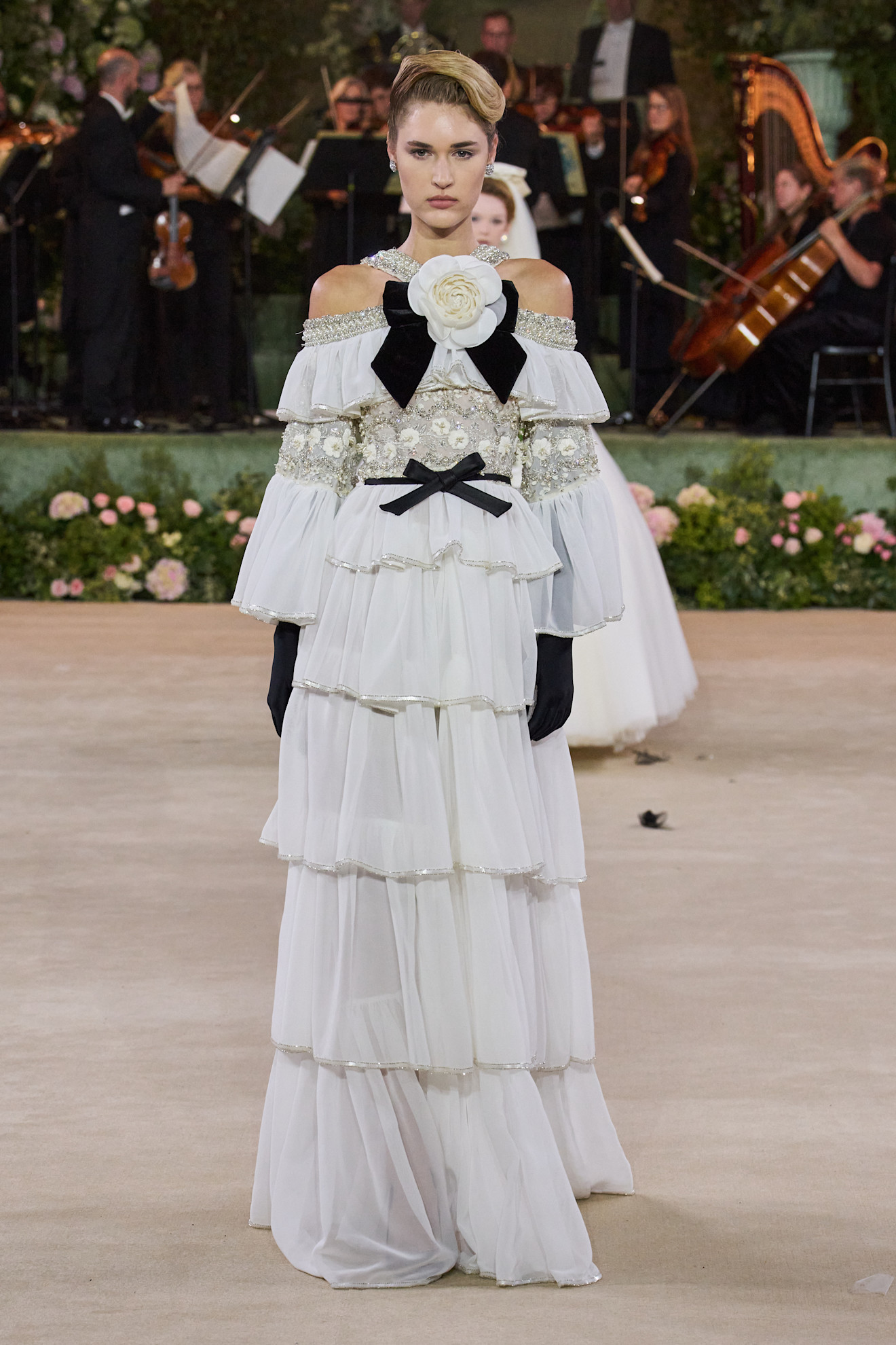 Шоу открыла легендарная Наоми Кэмпбелл в длинном черном платье с открытыми плечами, украшенном изящным бутоном розы на груди. Этот цветок стал ключевым мотивом всей коллекции, появляясь в самых разных образах — от элегантного платья-футляра до костюмов с расклешенными юбками и роскошных свадебных нарядов. Еще одним связующим элементом линейки, наряду с розами, стал бант.