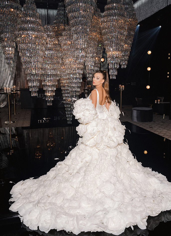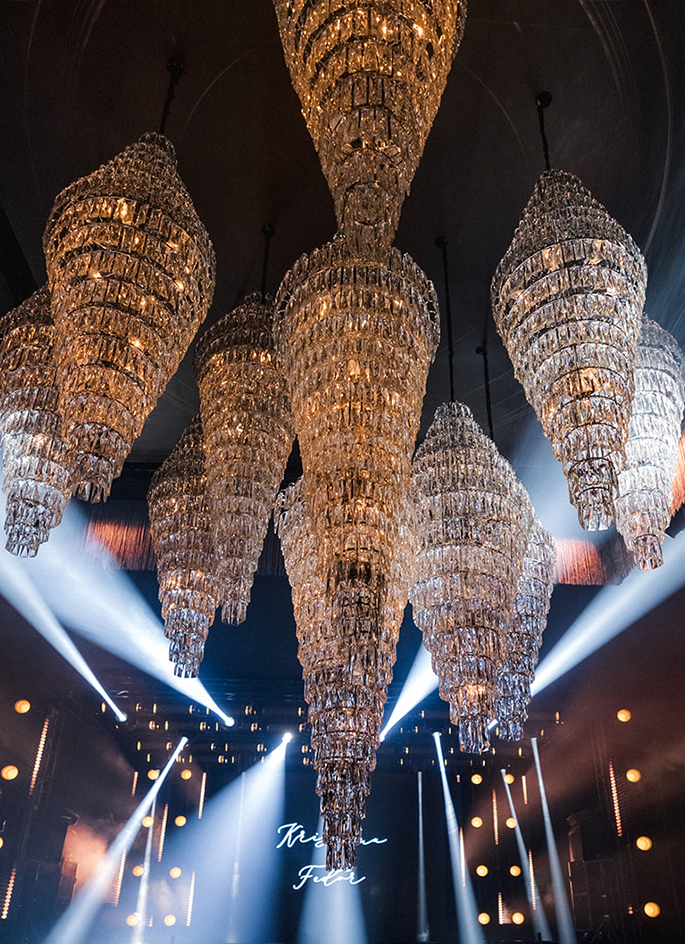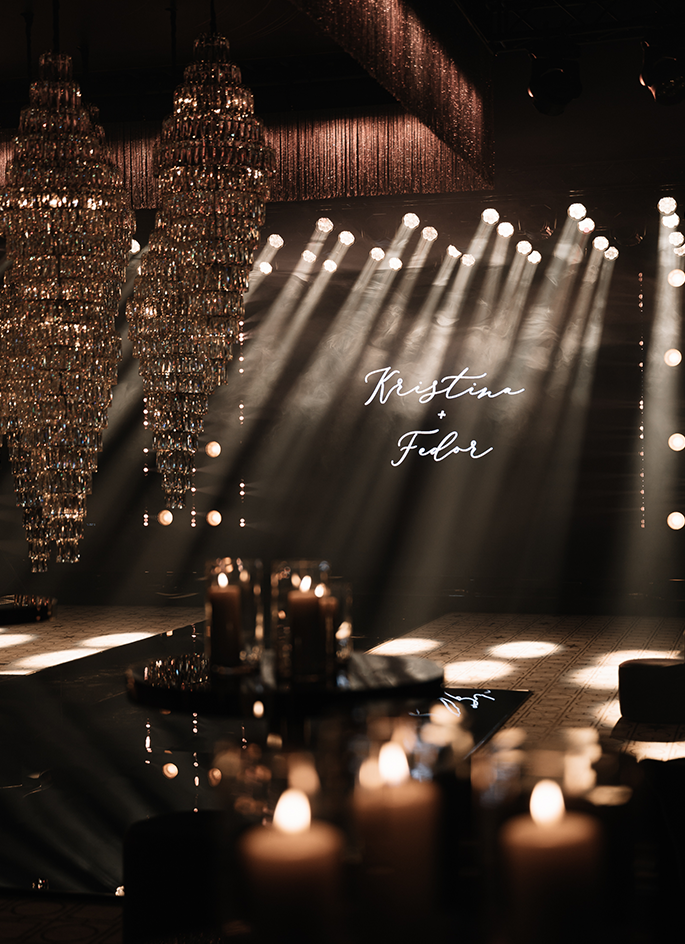 Вторая часть вечера — более танцевальная, более движовая — проходила в яхт-клубе. Хотелось воссоздать атмосферу клуба, но при этом и сохранить атмосферу свадьбы, поэтому мы использовали прием с хрусталем. Сделали все очень по классике, но при этом этот вайб и настроение клуба, ночной вечеринки остались. Гости сразу погружались в атмосферу гламурного бара с музыкантами и танцами. В центре зала мы повесили огромную стеклянную люстру, выставили свет так, что она переливалась тысячами огней и стала главным арт-объектом вечера (после невероятных нарядов Кристины, конечно же).