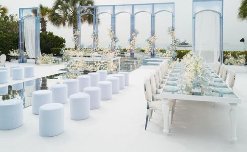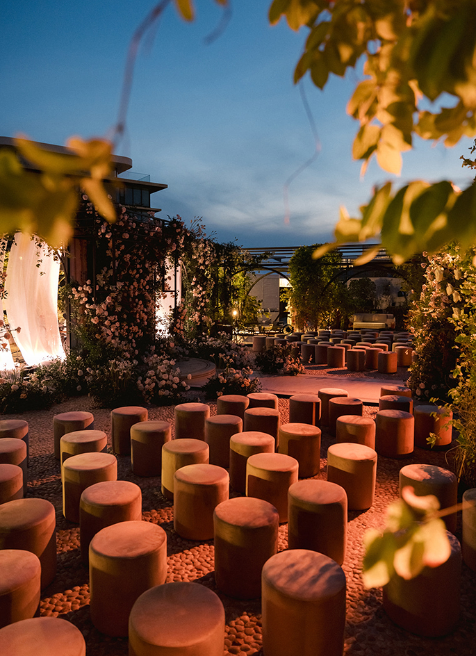 Все мероприятие проходило на территории отеля Bulgari. Мы оборудовали это пространство таким образом, чтобы соблюсти все национальные обычаи для церемонии никах — например, стулья, стол, необходимые для церемонии должны быть расположены особым образом.