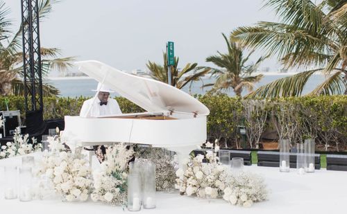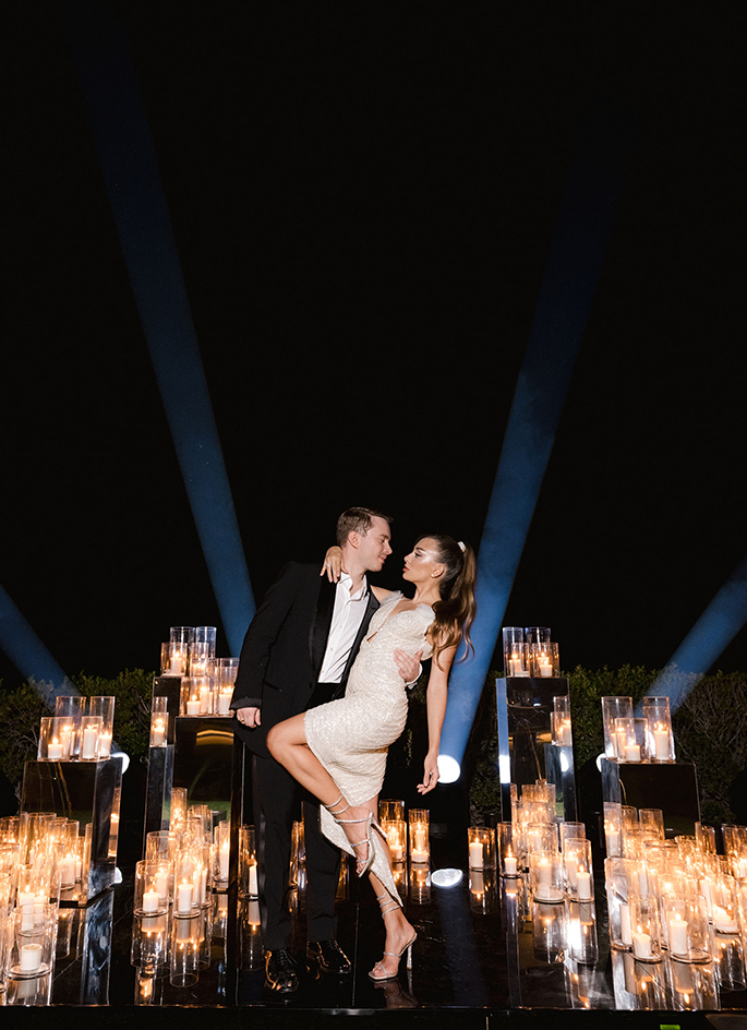 Нам нужно было сделать там и welcome, и церемонию, и первую часть ужина. Перед нами стояла задача — разместить 100 человек гостей в лимонном саду, так как локация сама по себе небольшая, мы совместно с декораторами придумали классное решение и поделили сад на две части, в одной части приходила церемония, в другой — ужин. Мы очень любим церемонии, не приглашаем церемониймейстеров, делаем это с музыкантами, приглашаем живой band или оркестр. В данном случае мы прописали очень классные стихи, основанные на истории любви пары. Музыкант и сценарист Вася Зоркий написал стихи про историю Кристины и Федора, про их любовь. А церемонию провел актер Антон Лаврентьев, который читал стихи и исполнял авторские песни под аккомпанемент The Gipsy Band. Получилось невероятное комбо, про двух влюбленных, которые доверили нам быть свидетелями самого главного таинства в их жизни. На этом музыка не закончилась, M’Dee и The Limba, любимые исполнители ребят, спели строчки, которые до сих пор крутятся в голове. Организаторам достаточно легко привезти в Дубай звезду любого масштаба.