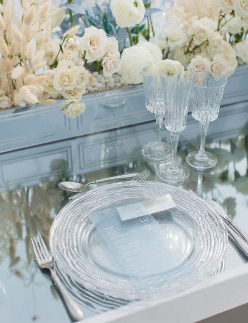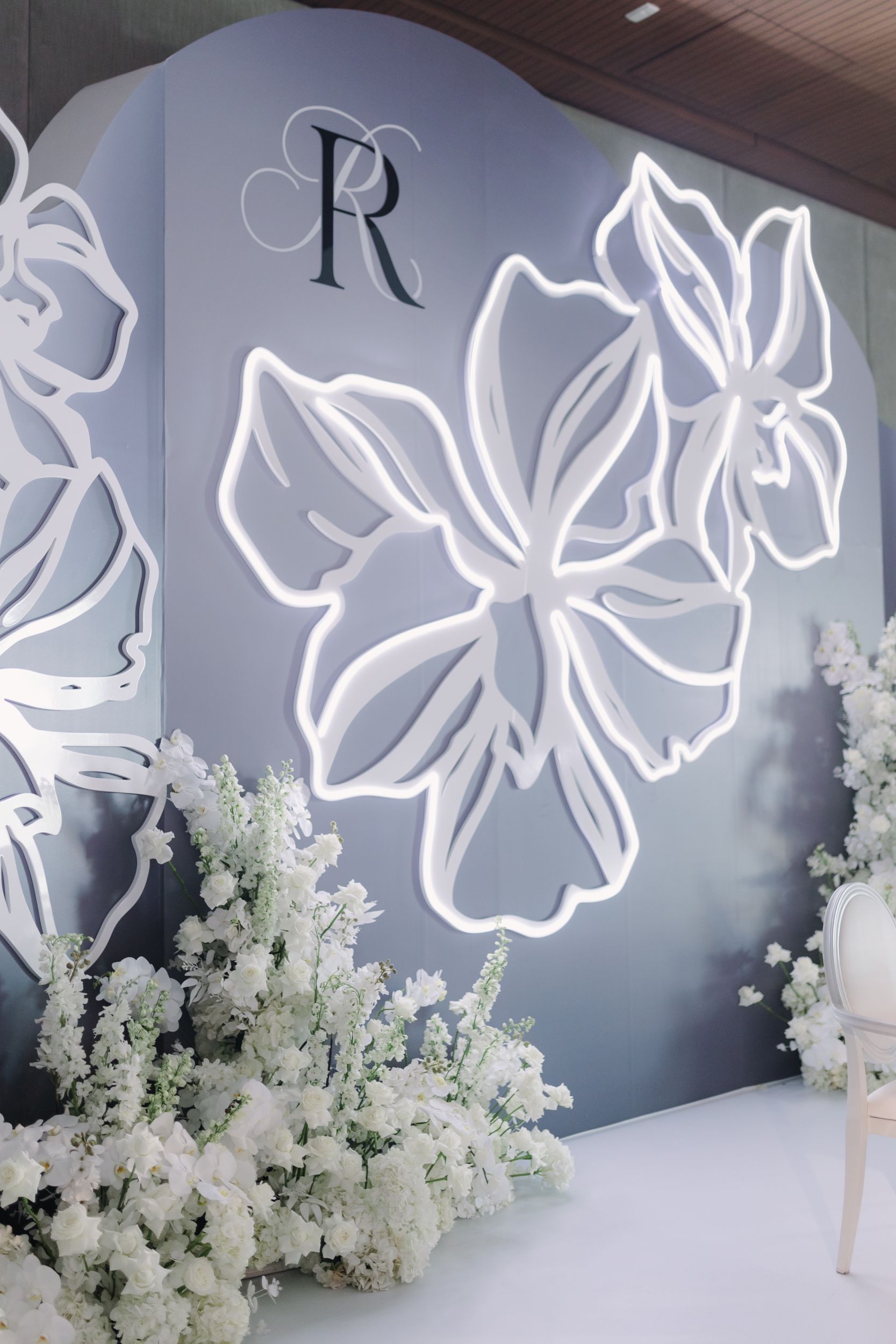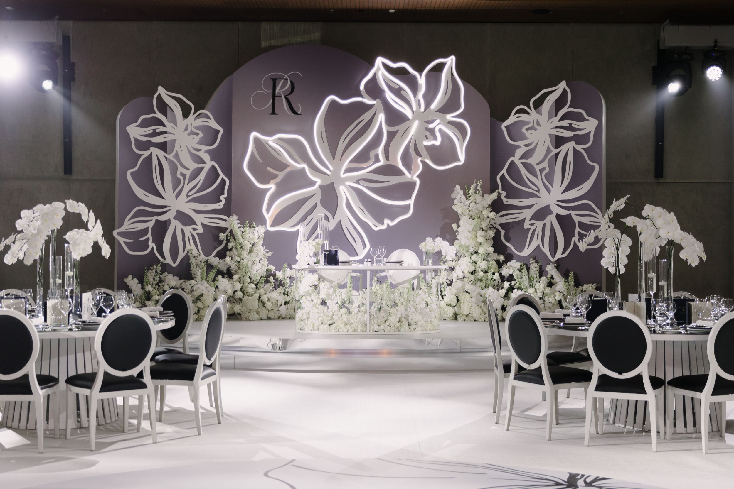 Тема отражений последовательно проведена через весь декор свадьбы, в котором использовано множество зеркальных поверхностей и повторяющихся элементов. Например, две большие R (первая буква имен молодоженов) или парные неоновые цветы, украшающие президиум.