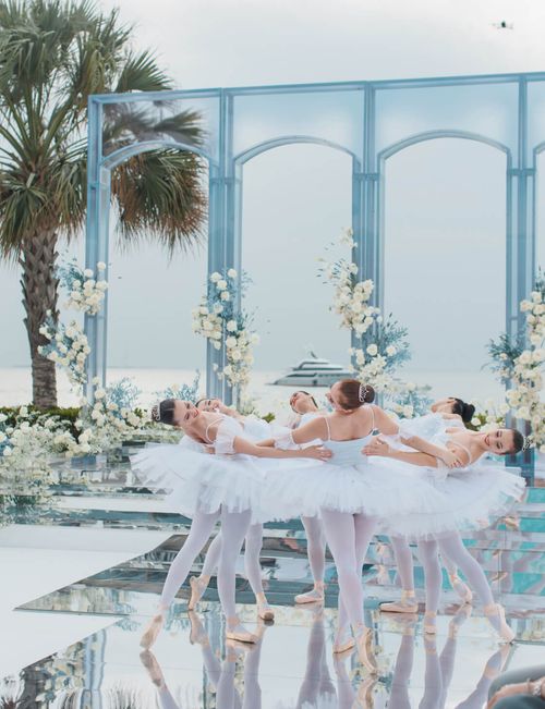 Первый танец жениха и невесты мы специально поставили. Репетировали его даже во время монтажа свадебной площадки, потому что некоторые движения важно было делать под определённые моменты. Сопровождался танец словами про пару, которые показывали на вертикальном экране — ещё одной фишке площадки. Танцевали ребята на подиуме с выездной регистрации. Гости насладились невероятной картиной — влюблённая пара кружится в красивом декоре и закатном солнце с видом на Персидский залив.