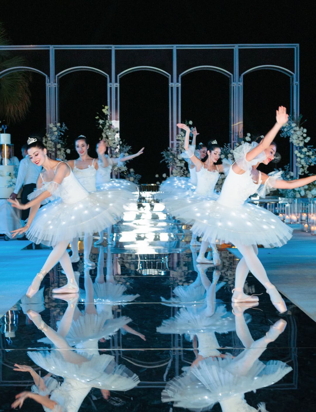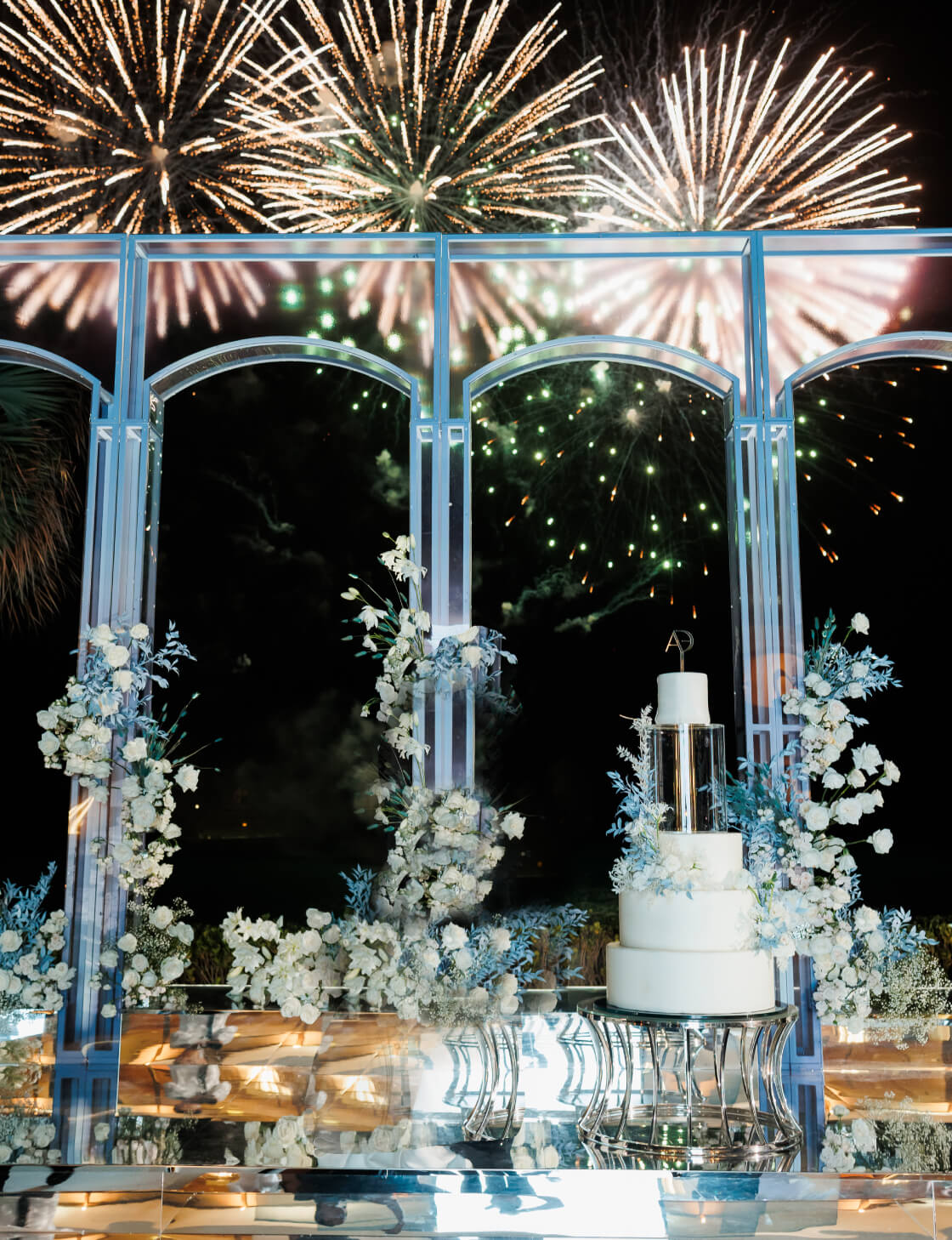 Финал получился впечатляющим: мы разыграли букет невесты и бутоньерку жениха, а также показали эффектный шоу-номер — подача свадебного торта, который появился на площадке под голос диктора и танец балерин. Выход пары к десерту также был отрепетирован вплоть по таймкодам. Особенно ярким был первый надрез торта — молодожены его делали в конкретный такт мелодии, любимой песни жениха и невесты, который сопровождался взлётом фейерверка. Очень красивое и эффектное завершение официальной части вечера!