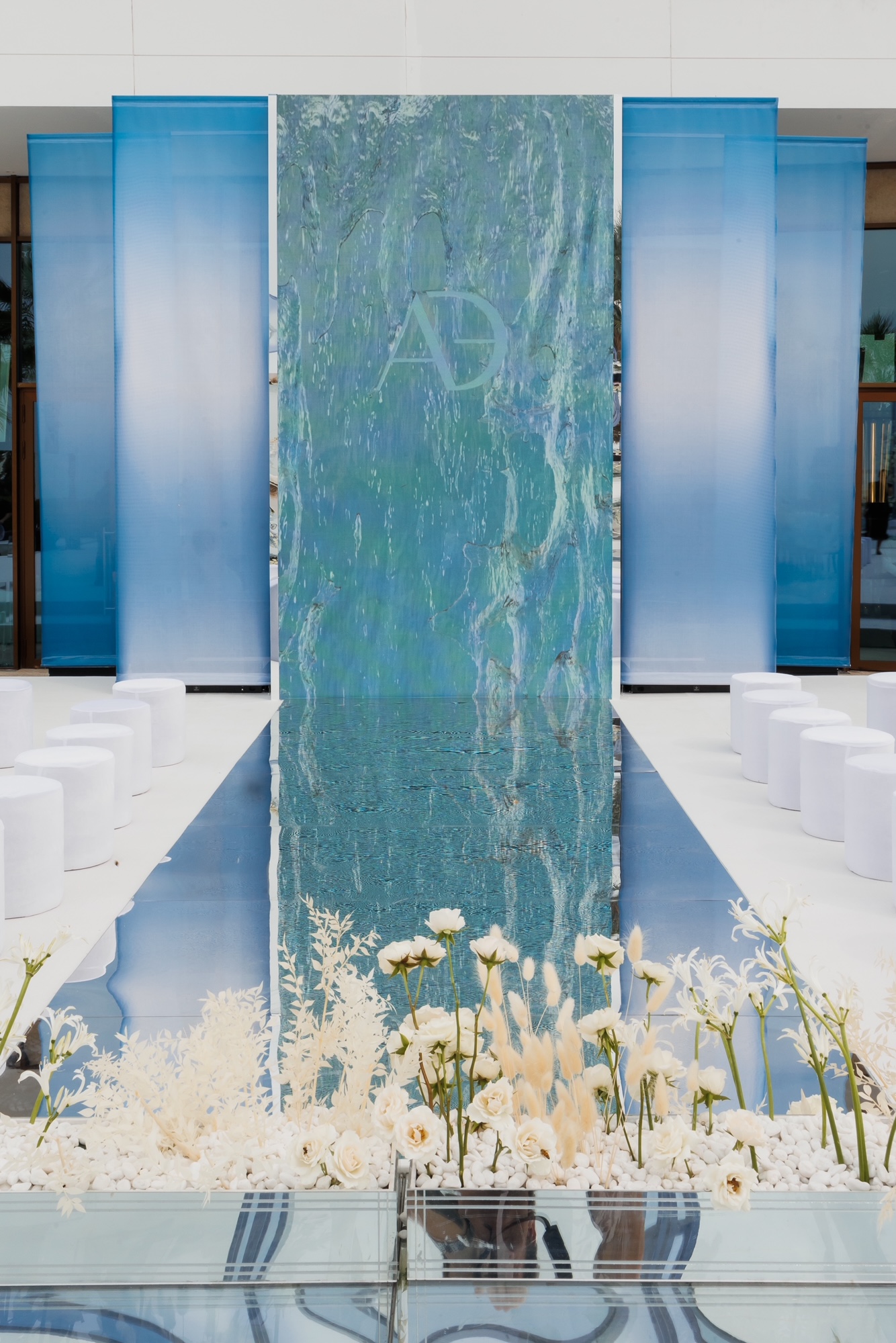Весь контент на мероприятии транслировался на большом прямоугольном вертикальном экране. Ещё одна фишка торжества — анимация стекающей воды.
